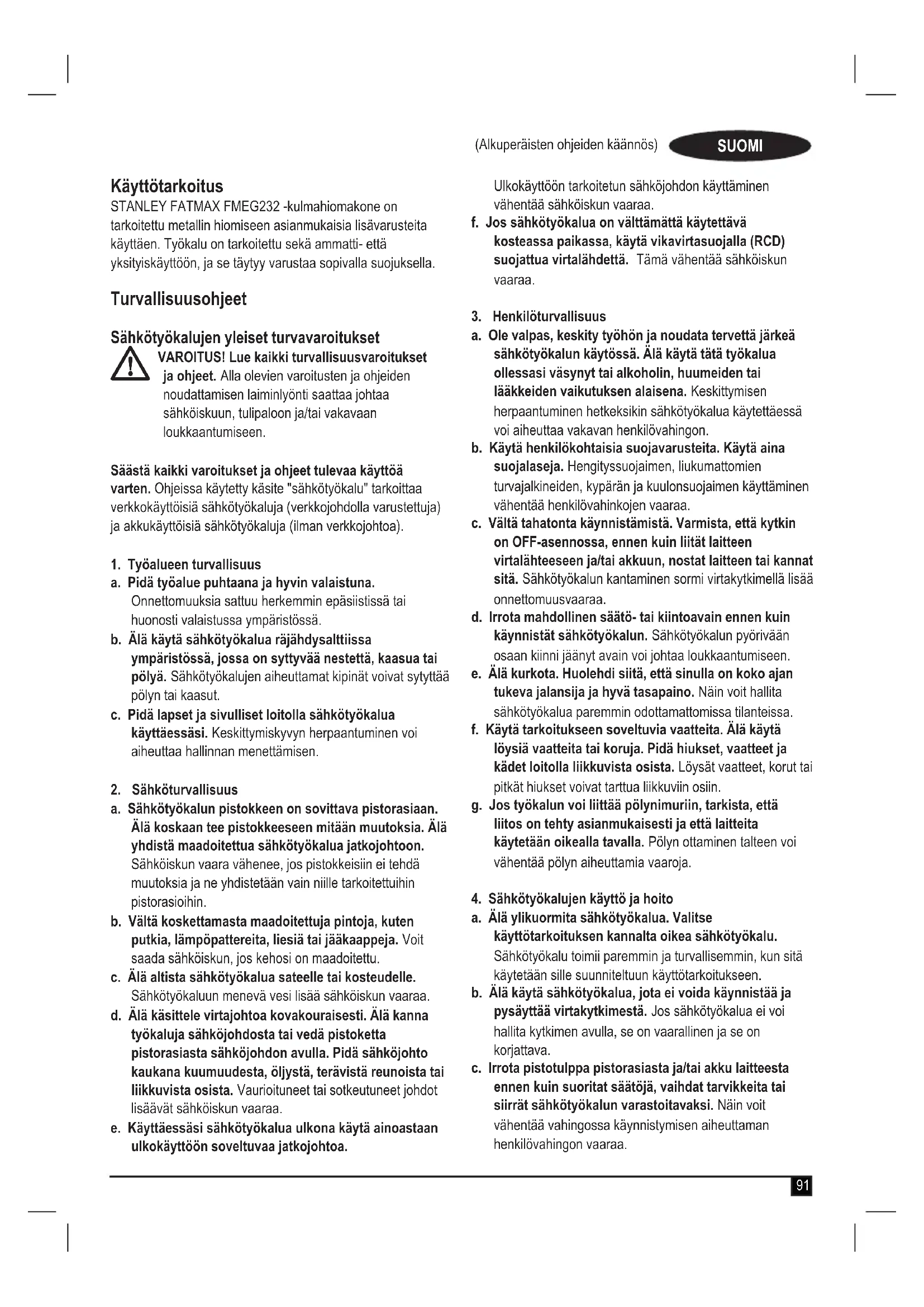 Takuu Stanley Fat Max on vakuuttunut tuotteidensa korkeasta laadusta ja tarjoaa kuluttajille 12 kuukauden takuun, joka astuu voimaan ostopäivänä. Takuu on lisäys kuluttajan laillisiin oikeuksiin eikä vaikuta niihin. Tämä takuu on voimassa kaikissa EU- ja ETA-maissa. Edellytyksenä takuun saamiselle on, että vaade täyttää Stanley Fat Maxin ehdot ja että ostaja toimittaa ostotositteen jälleenmyyjälle tai valtuutetulle huoltoliikkeelle. Stanley Fat Max yhden vuoden takuun ehdot ja lähimmän valtuutetun korjauspalvelun yhteystiedot ovat saatavilla osoitteessa www.2helpU.com tai ottamalla yhteyttä paikalliseen Stanley Fat Maxin toimipisteeseen tässä ohjekirjassa ilmoitettuihin osoitteisiin. Käy verkkosivuillamme osoitteessa www.stanleytools.co.uk/ ja rekisteröi uusi Stanley Fat Max -tuotteesi. Sivuilta saat myös päivityksiä uusista tuotteista ja erikoistarjouksista.98 (Alkuperäisten ohjeiden käännös) SUOMI Lisävarustekaavio Suojustyyppi Lisävaruste Kuvaus Hiomakoneen asentaminen Tyypin 27 suoja Keskipainaumalla varustettu hiomalaikka Tyypin 27 suojus Taustalaippa Keskipainaumalla varustettu laikka (tyyppi 27) Lukituslaippa Lankakiekot Kierteisellä mutterilla kiinnitettävät lankakiekot Tyypin 27 suojus Lankakiekko Kierteisellä mutterilla kiinnitettävä lankaharja Tyypin 27 suojus Lankaharja99 (Μετάφραση των πρωτότυπων οδηγιών) Προβλεπόμενη χρήση Ο γωνιακός τροχός STANLEY FATMAX FMEG232 έχει σχεδιαστεί για τρόχισμα και λείανση μετάλλων με χρήση αξεσουάρ του κατάλληλου τύπου. Όταν είναι εξοπλισμένο με το κατάλληλο προστατευτικό, αυτό το εργαλείο προορίζεται για επαγγελματική και για ιδιωτική, μη επαγγελματική χρήση. Οδηγίες ασφαλείας Γενικές προειδοποιήσεις ασφαλείας για ηλεκτρικά