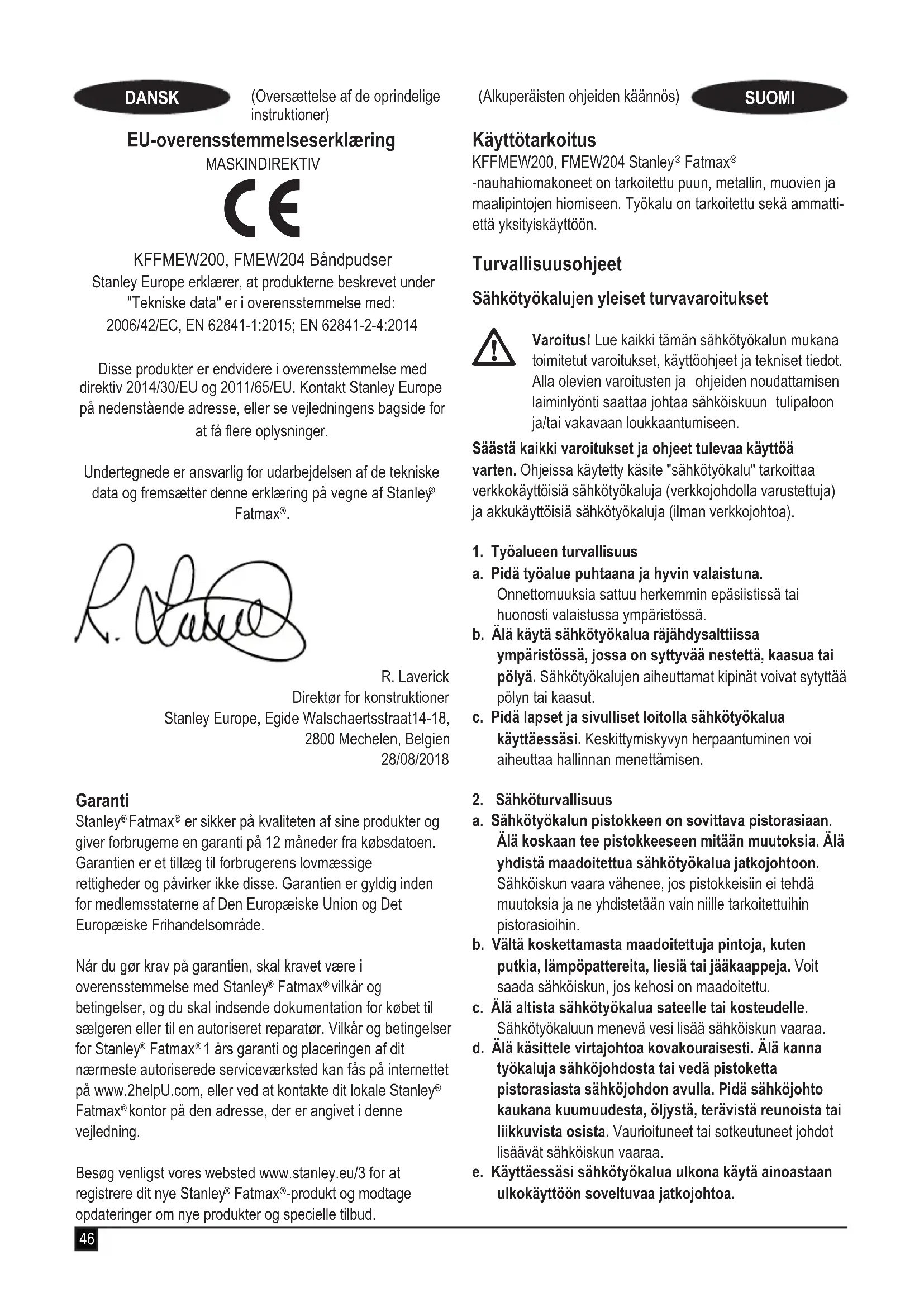 KFFMEW200, FMEW204 Hiomakone Stanley Europe ilmoittaa, että tuotteet, jotka on kuvattu kohdassa Tekniset tiedot, täyttävät seuraavien direktiivien vaatimukset: 2006/42/EY, EN 62841-1:2015; EN 62841-2-4:2014 Nämä tuotteet täyttävät myös direktiivien 2014/30/EU ja 2011/65/EU vaatimukset. Lisätietoja saa ottamalla yhteyttä Stanley Europeen seuraavassa osoitteessa. Tiedot ovat myös käyttöoppaan takakannessa. Allekirjoittanut vastaa teknisten tietojen kokoamisesta ja antaa tämän ilmoituksen Stanley