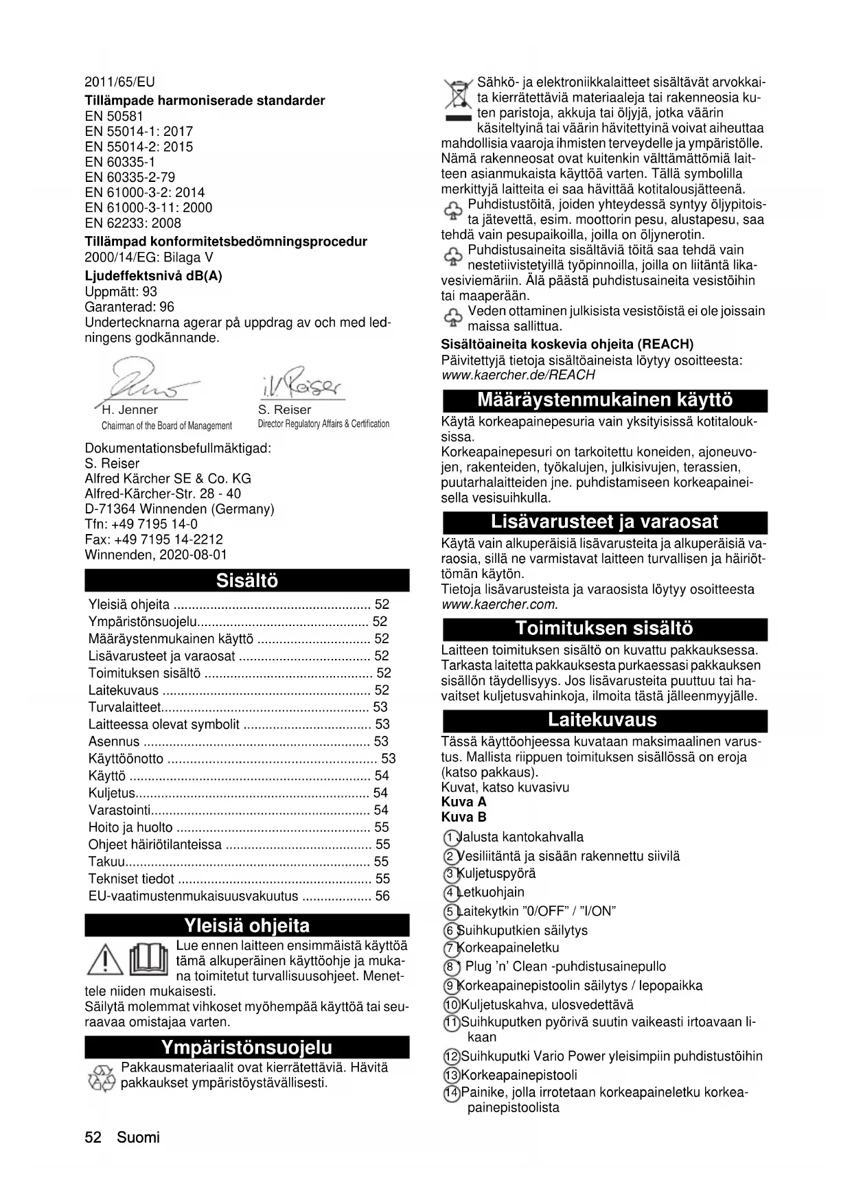 - dB(A) 96 9652 Suomi 2011/65/EU Tillämpade harmoniserade standarder EN 50581 EN 55014-1: 2017 EN 55014-2: 2015 EN 60335-1 EN 60335-2-79 EN 61000-3-2: 2014 EN 61000-3-11: 2000 EN 62233: 2008 Tillämpad konformitetsbedömningsprocedur 2000/14/EG: Bilaga V Ljudeffektsnivå dB(A) Uppmätt: 93 Garanterad: 96 Undertecknarna agerar på uppdrag av och med led- ningens godkännande. Dokumentationsbefullmäktigad: S. Reiser Alfred Kärcher SE & Co. KG Alfred-Kärcher-Str. 28 - 40 D-71364 Winnenden (Germany) Tfn: +49 7195 14-0 Fax: +49 7195 14-2212 Winnenden, 2020-08-01 Sisältö Yleisiä ohjeita Lue ennen laitteen ensimmäistä käyttöä tämä alkuperäinen käyttöohje ja muka- na toimitetut turvallisuusohjeet. Menet- tele niiden mukaisesti. Säilytä molemmat vihkoset myöhempää käyttöä tai seu- raavaa omistajaa varten. Ympäristönsuojelu Pakkausmateriaalit ovat kierrätettäviä. Hävitä pakkaukset ympäristöystävällisesti. Sähkö- ja elektroniikkalaitteet sisältävät arvokkai- ta kierrätettäviä materiaaleja tai rakenneosia ku- ten paristoja, akkuja tai öljyjä, jotka väärin käsiteltyinä tai väärin hävitettyinä voivat aiheuttaa mahdollisia vaaroja ihmisten terveydelle ja ympäristölle. Nämä rakenneosat ovat kuitenkin välttämättömiä lait- teen asianmukaista käyttöä varten. Tällä symbolilla merkittyjä laitteita ei saa hävittää kotitalousjätteenä. Puhdistustöitä, joiden yhteydessä syntyy öljypitois- ta jätevettä, esim. moottorin pesu, alustapesu, saa tehdä vain pesupaikoilla, joilla on öljynerotin. Puhdistusaineita sisältäviä töitä saa tehdä vain nestetiivistetyillä työpinnoilla, joilla on liitäntä lika- vesiviemäriin. Älä päästä puhdistusaineita vesistöihin tai maaperään. Veden ottaminen julkisista vesistöistä ei ole joissain maissa sallittua. Sisältöaineita koskevia ohjeita (REACH) Päivitettyjä tietoja sisältöaineista löytyy osoitteesta: www.kaercher.de/REACH Määräystenmukainen käyttö Käytä korkeapainepesuria vain yksityisissä kotitalouk- sissa. Korkeapainepesuri on tarkoitettu koneiden, ajoneuvo- jen, rakenteiden, työkalujen, julkisivujen, terassien, puutarhalaitteiden jne. puhdistamiseen korkeapainei- sella vesisuihkulla. Lisävarusteet ja varaosat Käytä vain alkuperäisiä lisävarusteita ja alkuperäisiä va- raosia, sillä ne varmistavat laitteen turvallisen ja häiriöt- tömän käytön. Tietoja lisävarusteista ja varaosista löytyy osoitteesta www.kaercher.com. Toimituksen sisältö Laitteen toimituksen sisältö on kuvattu pakkauksessa. Tarkasta laitetta pakkauksesta purkaessasi pakkauksen sisällön täydellisyys. Jos lisävarusteita puuttuu tai ha- vaitset kuljetusvahinkoja, ilmoita tästä jälleenmyyjälle. Laitekuvaus Tässä käyttöohjeessa kuvataan maksimaalinen varus- tus. Mallista riippuen toimituksen sisällössä on eroja (katso pakkaus). Kuvat, katso kuvasivu Kuva A Kuva B 1 Jalusta kantokahvalla 2 Vesiliitäntä ja sisään rakennettu siivilä 3 Kuljetuspyörä 4 Letkuohjain 5 Laitekytkin ”0/OFF” / ”I/ON” 6 Suihkuputkien säilytys 7 Korkeapaineletku 8 * Plug ’n’ Clean -puhdistusainepullo 9 Korkeapainepistoolin säilytys / lepopaikka 10 Kuljetuskahva, ulosvedettävä 11 Suihkuputken pyörivä suutin vaikeasti irtoavaan li- kaan 12 Suihkuputki Vario Power yleisimpiin puhdistustöihin 13 Korkeapainepistooli 14 Painike, jolla irrotetaan korkeapaineletku korkea- painepistoolista Yleisiä ohjeita p. 52