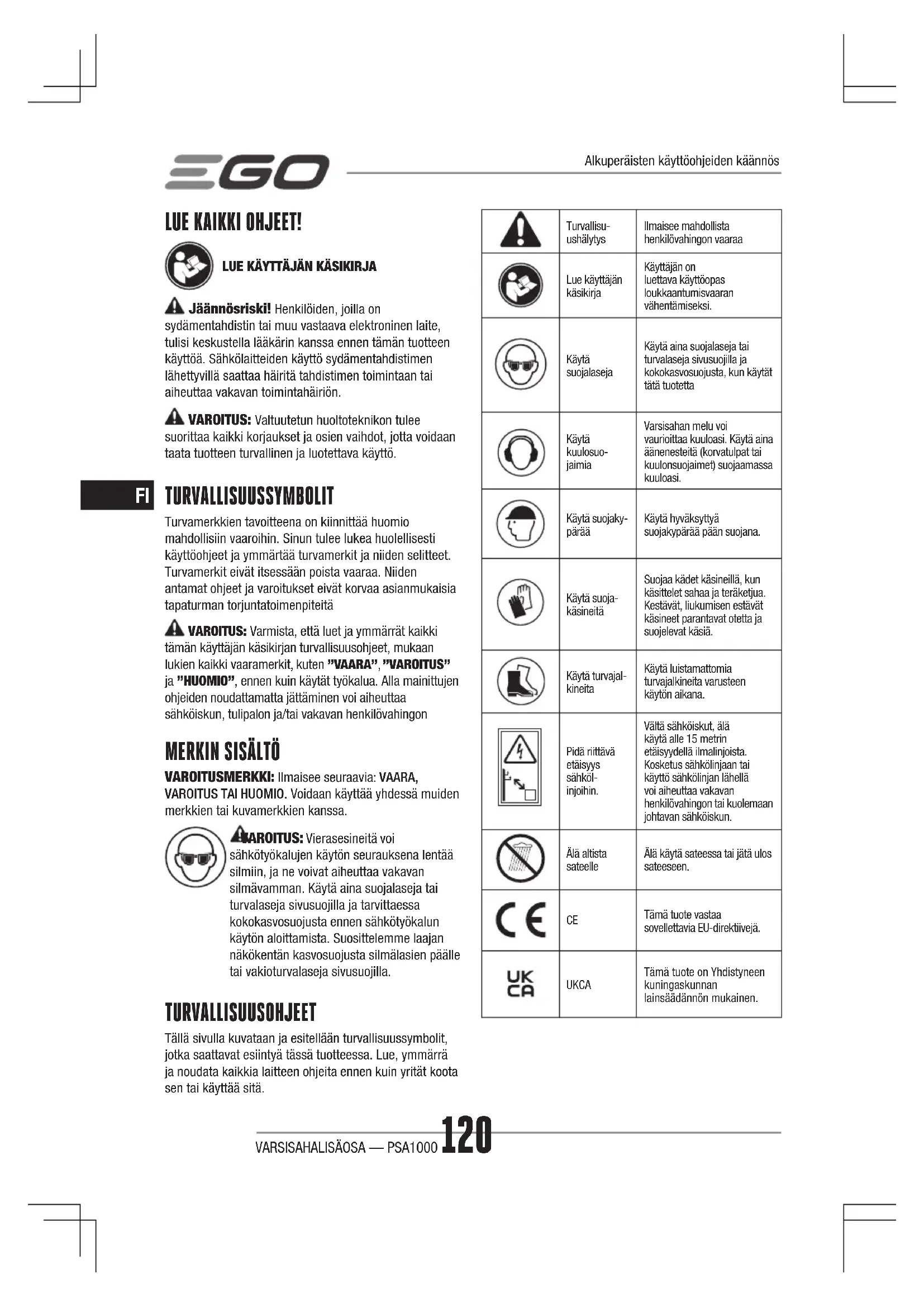 VAROITUSMERKKI: Ilmaisee seuraavia: VAARA, VAROITUS TAI HUOMIO. Voidaan käyttää yhdessä muiden merkkien tai kuvamerkkien kanssa. VAROITUS: Vierasesineitä voi sähkötyökalujen käytön seurauksena lentää silmiin, ja ne voivat aiheuttaa vakavan silmävamman. Käytä aina suojalaseja tai turvalaseja sivusuojilla ja tarvittaessa kokokasvosuojusta ennen sähkötyökalun käytön aloittamista. Suosittelemme laajan näkökentän kasvosuojusta silmälasien päälle tai vakioturvalaseja sivusuojilla. TURVALLISUUSOHJEET Tällä sivulla kuvataan ja esitellään turvallisuussymbolit, jotka saattavat esiintyä tässä tuotteessa. Lue, ymmärrä ja noudata kaikkia laitteen ohjeita ennen kuin yrität koota sen tai käyttää sitä. Turvallisu-ushälytysIlmaisee mahdollista henkilövahingon vaaraaLue käyttäjän käsikirjaKäyttäjän on luettava käyttöopas loukkaantumisvaaran vähentämiseksi.Käytä suojalasejaKäytä aina suojalaseja tai turvalaseja sivusuojilla ja kokokasvosuojusta, kun käytät tätä tuotettaKäytä kuulosuo-jaimiaVarsisahan melu voi vaurioittaa kuuloasi. Käytä aina äänenesteitä (korvatulpat tai kuulonsuojaimet) suojaamassa kuuloasi.Käytä suojaky-pärääKäytä hyväksyttyä suojakypärää pään suojana.Käytä suoja-käsineitäSuojaa kädet käsineillä, kun käsittelet sahaa ja teräketjua. Kestävät, liukumisen estävät käsineet parantavat otetta ja suojelevat käsiä.Käytä turvajal-kineitaKäytä luistamattomia turvajalkineita varusteen käytön aikana.Pidä riittävä etäisyys sähköl-injoihin.Vältä sähköiskut, älä käytä alle 15 metrin etäisyydellä ilmalinjoista. Kosketus sähkölinjaan tai käyttö sähkölinjan lähellä voi aiheuttaa vakavan henkilövahingon tai kuolemaan johtavan sähköiskun.Älä altista sateelleÄlä käytä sateessa tai jätä ulos sateeseen. Tämä tuote vastaa sovellettavia EU-direktiivejä. UKCA Tämä tuote on Yhdistyneen kuningaskunnan lainsäädännön mukainen. Alkuperäisten käyttöohjeiden käännösVARSISAHALISÄOSA — PSA1000 121