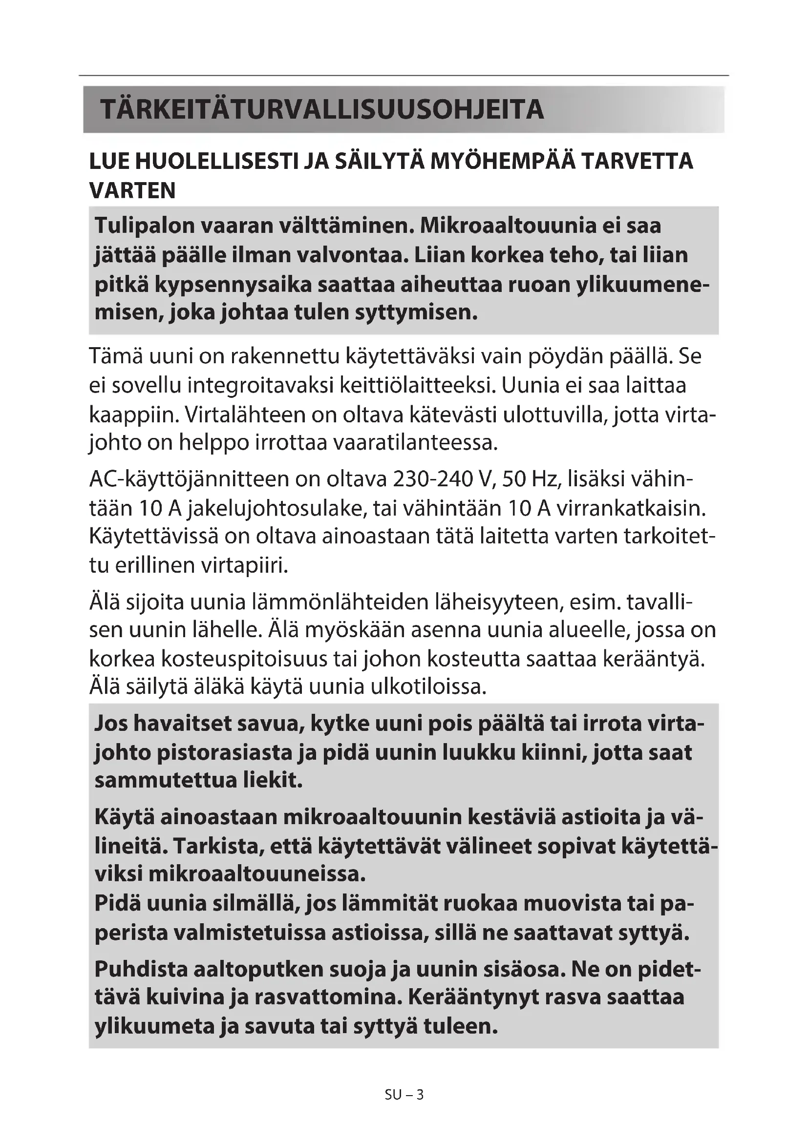 LUE HUOLELLISESTI JA SÄILYTÄ MYÖHEMPÄÄ TARVETTA VARTEN Tulipalon vaaran välttäminen. Mikroaaltouunia ei saa jättää päälle ilman valvontaa. Liian korkea teho, tai liian pitkä kypsennysaika saattaa aiheuttaa ruoan ylikuumene- misen, joka johtaa tulen syttymisen. Tämä uuni on rakennettu käytettäväksi vain pöydän päällä. Se ei sovellu integroitavaksi keittiölaitteeksi. Uunia ei saa laittaa kaappiin. Virtalähteen on oltava kätevästi ulottuvilla, jotta virta- johto on helppo irrottaa vaaratilanteessa. AC-käyttöjännitteen on oltava 230-240 V, 50 Hz, lisäksi vähin- tään 10 A jakelujohtosulake, tai vähintään 10 A virrankatkaisin. Käytettävissä on oltava ainoastaan tätä laitetta varten tarkoitet- tu erillinen virtapiiri. Älä sijoita uunia lämmönlähteiden läheisyyteen, esim. tavalli- sen uunin lähelle. Älä myöskään asenna uunia alueelle, jossa on korkea kosteuspitoisuus tai johon kosteutta saattaa kerääntyä. Älä säilytä äläkä käytä uunia ulkotiloissa. Jos havaitset savua, kytke uuni pois päältä tai irrota virta- johto pistorasiasta ja pidä uunin luukku kiinni, jotta saat sammutettua liekit. Käytä ainoastaan mikroaaltouunin kestäviä astioita ja vä- lineitä. Tarkista, että käytettävät välineet sopivat käytettä- viksi mikroaaltouuneissa. Pidä uunia silmällä, jos lämmität ruokaa muovista tai pa- perista valmistetuissa astioissa, sillä ne saattavat syttyä. Puhdista aaltoputken suoja ja uunin sisäosa. Ne on pidet- tävä kuivina ja rasvattomina. Kerääntynyt rasva saattaa ylikuumeta ja savuta tai syttyä tuleen.FI SU – 3SU – 3
