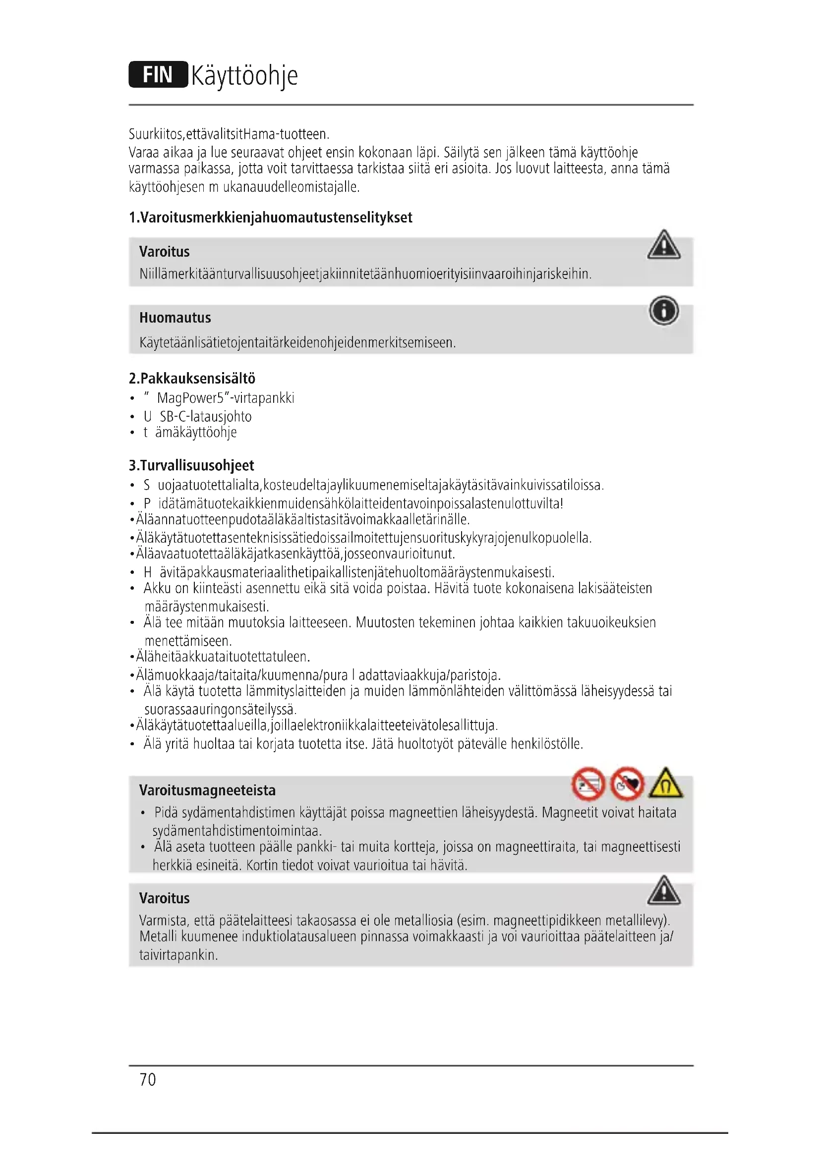- Älä aseta tuotteen päälle pankki- tai muita kortteja, joissa on magneettiraita, tai magneettisesti herkkiä esineitä. Kortintiedot voivat vaurioitua taihävitä. Varoitus Varmista, että päätelaitteesi takaosassa ei ole metalliosia (esim.magneettipidikkeen metallilevy). Metallikuumenee induktiolatausalueen pinnassa voimakkaasti ja voi vaurioittaa päätelaitteen ja/ tai virtapankin. L Käyttöohje71