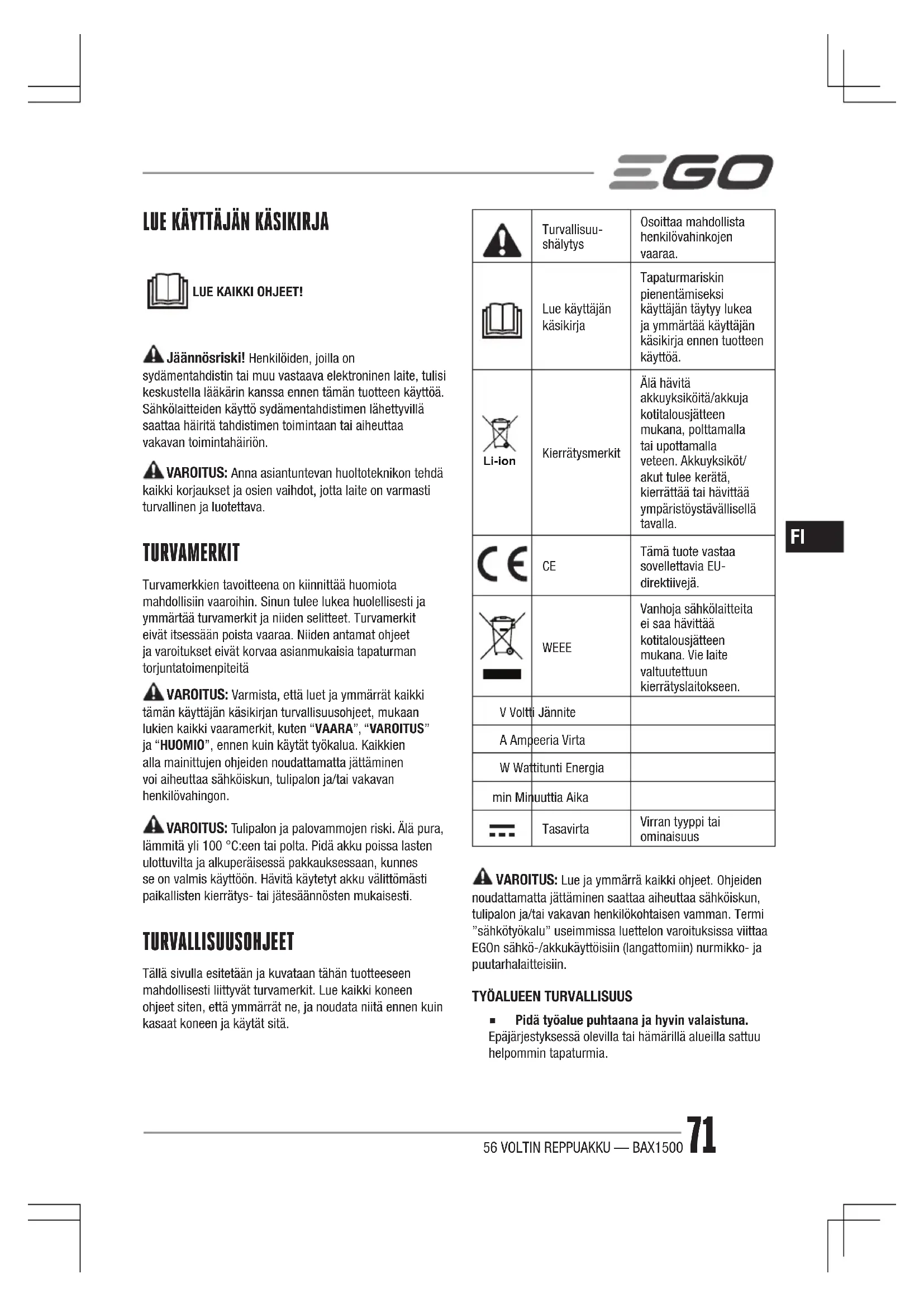 LUE KÄYTTÄJÄN KÄSIKIRJA LUE KAIKKI OHJEET! Jäännösriski! Henkilöiden, joilla on sydämentahdistin tai muu vastaava elektroninen laite, tulisi keskustella lääkärin kanssa ennen tämän tuotteen käyttöä. Sähkölaitteiden käyttö sydämentahdistimen lähettyvillä saattaa häiritä tahdistimen toimintaan tai aiheuttaa vakavan toimintahäiriön. VAROITUS: Anna asiantuntevan huoltoteknikon tehdä kaikki korjaukset ja osien vaihdot, jotta laite on varmasti turvallinen ja luotettava. TURVAMERKIT Turvamerkkien tavoitteena on kiinnittää huomiota mahdollisiin vaaroihin. Sinun tulee lukea huolellisesti ja ymmärtää turvamerkit ja niiden selitteet. Turvamerkit eivät itsessään poista vaaraa. Niiden antamat ohjeet ja varoitukset eivät korvaa asianmukaisia tapaturman torjuntatoimenpiteitä VAROITUS: Varmista, että luet ja ymmärrät kaikki tämän käyttäjän käsikirjan turvallisuusohjeet, mukaan lukien kaikki vaaramerkit, kuten “VAARA”, “VAROITUS” ja “HUOMIO”, ennen kuin käytät työkalua. Kaikkien alla mainittujen ohjeiden noudattamatta jättäminen voi aiheuttaa sähköiskun, tulipalon ja/tai vakavan henkilövahingon. VAROITUS: Tulipalon ja palovammojen riski. Älä pura, lämmitä yli 100 °C:een tai polta. Pidä akku poissa lasten ulottuvilta ja alkuperäisessä pakkauksessaan, kunnes se on valmis käyttöön. Hävitä käytetyt akku välittömästi paikallisten kierrätys- tai jätesäännösten mukaisesti. TURVALLISUUSOHJEET Tällä sivulla esitetään ja kuvataan tähän tuotteeseen mahdollisesti liittyvät turvamerkit. Lue kaikki koneen ohjeet siten, että ymmärrät ne, ja noudata niitä ennen kuin kasaat koneen ja käytät sitä.Turvallisuu- shälytysOsoittaa mahdollista henkilövahinkojen vaaraa.Lue käyttäjän käsikirja Tapaturmariskin pienentämiseksi käyttäjän täytyy lukea ja ymmärtää käyttäjän käsikirja ennen tuotteen käyttöä. Li-ion KierrätysmerkitÄlä hävitä akkuyksiköitä/akkuja kotitalousjätteen mukana, polttamalla tai upottamalla veteen. Akkuyksiköt/akut tulee kerätä, kierrättää tai hävittää ympäristöystävällisellä tavalla. Tämä tuote vastaa sovellettavia EU-direktiivejä.WEEE Vanhoja sähkölaitteita ei saa hävittää kotitalousjätteen mukana. Vie laite valtuutettuun kierrätyslaitokseen.V Voltti JänniteA Ampeeria VirtaW Wattitunti Energiamin Minuuttia AikaTasavirtaVirran tyyppi tai ominaisuus VAROITUS: Lue ja ymmärrä kaikki ohjeet. Ohjeiden noudattamatta jättäminen saattaa aiheuttaa sähköiskun, tulipalon ja/tai vakavan henkilökohtaisen vamman. Termi ”sähkötyökalu” useimmissa luettelon varoituksissa viittaa EGOn sähkö-/akkukäyttöisiin (langattomiin) nurmikko- ja puutarhalaitteisiin.