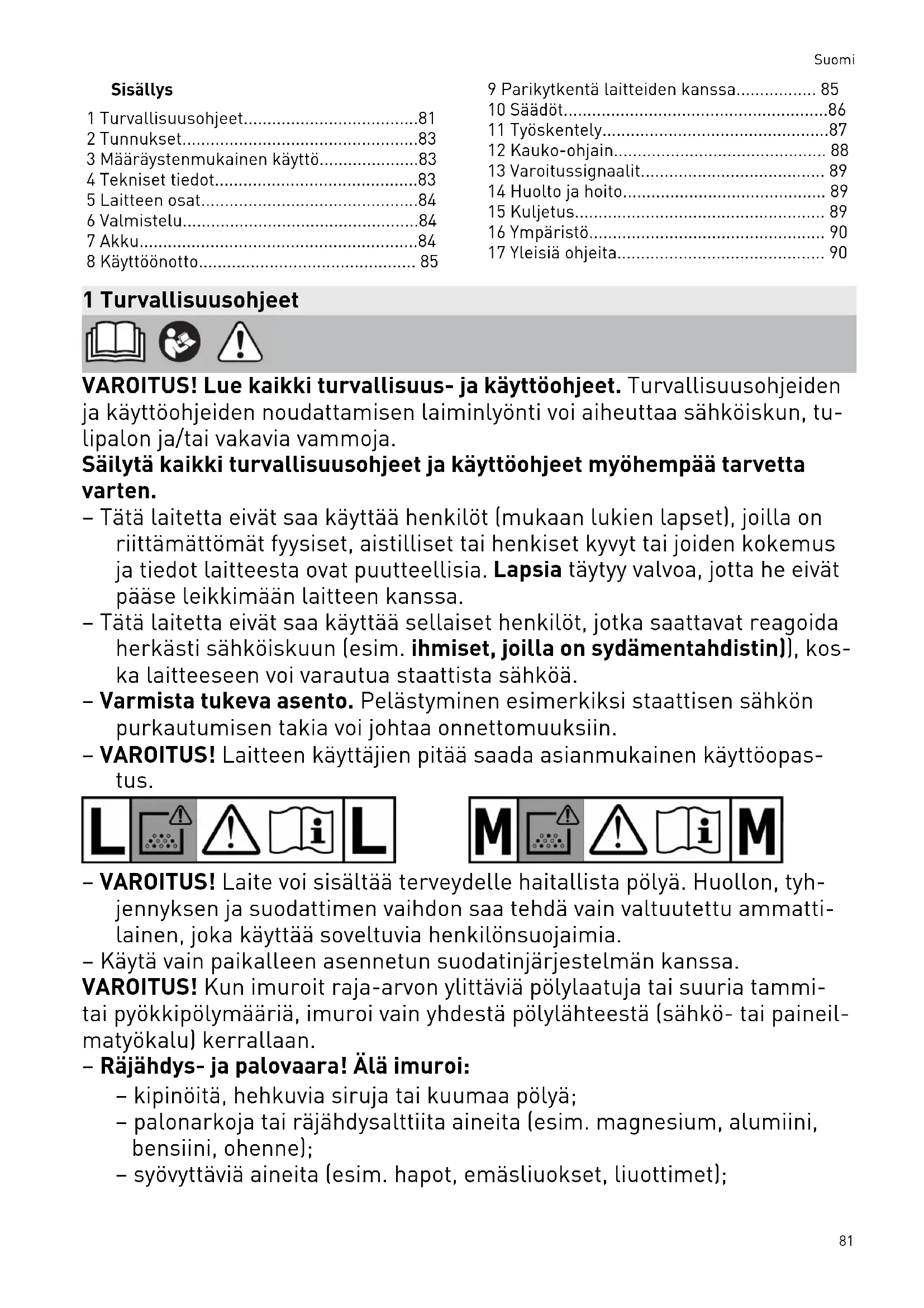 - 17 Yleisiä ohjeita 1 Turvallisuusohjeet VAROITUS! Lue kaikki turvallisuus- ja käyttöohjeet. Turvallisuusohjeiden ja käyttöohjeiden noudattamisen laiminlyönti voi aiheuttaa sähköiskun, tu lipalon ja/tai vakavia vammoja. Säilytä kaikki turvallisuusohjeet ja käyttöohjeet myöhempää tarvetta varten. – Tätä laitetta eivät saa käyttää henkilöt (mukaan lukien lapset), joilla on riittämättömät fyysiset, aistilliset tai henkiset kyvyt tai joiden kokemus ja tiedot laitteesta ovat puutteellisia. Lapsia täytyy valvoa, jotta he eivät pääse leikkimään laitteen kanssa. – Tätä laitetta eivät saa käyttää sellaiset henkilöt, jotka saattavat reagoida herkästi sähköiskuun (esim. ihmiset, joilla on sydämentahdistin)), kos ka laitteeseen voi varautua staattista sähköä. – Varmista tukeva asento. Pelästyminen esimerkiksi staattisen sähkön purkautumisen takia voi johtaa onnettomuuksiin. – VAROITUS! Laitteen käyttäjien pitää saada asianmukainen käyttöopas tus. – VAROITUS! Laite voi sisältää terveydelle haitallista pölyä. Huollon, tyh jennyksen ja suodattimen vaihdon saa tehdä vain valtuutettu ammatti lainen, joka käyttää soveltuvia henkilönsuojaimia. – Käytä vain paikalleen asennetun suodatinjärjestelmän kanssa. VAROITUS! Kun imuroit raja-arvon ylittäviä pölylaatuja tai suuria tammi- tai pyökkipölymääriä, imuroi vain yhdestä pölylähteestä (sähkö- tai paineil matyökalu) kerrallaan. – Räjähdys- ja palovaara! Älä imuroi: – kipinöitä, hehkuvia siruja tai kuumaa pölyä; – palonarkoja tai räjähdysalttiita aineita (esim. magnesium, alumiini, bensiini, ohenne); – syövyttäviä aineita (esim. hapot, emäsliuokset, liuottimet); Suomi 81– kemiallisesti reaktiivisia aineita, jotka aiheuttavat lämpöä, happoja/ emäksiä, kaasuja yms. (esim. reaktiiviset 2K-materiaalit, alumiini ja vesi). – Noudata kansallisia turvallisuusmääräyksiä sekä materiaalin valmista jan antamia ohjeita! – VAROITUS! Sammuta laite välittömästi, jos siitä tulee vaahtoa tai nes tettä ulos. – VARO! Puhdista vesimäärän rajoituslaite säännöllisin väliajoin ja tarkis ta se vaurioiden varalta. – Käytä vain sopivan suojavarustuksen kanssa! – Työskentele vain kunnossa olevan laitteen kanssa (tarkasta silmämää räisesti), kuivassa ympäristössä ja ohjeiden mukaan! – Älä nosta äläkä kuljeta nosturikoukun tai nostolaitteen varassa. – Kanna laitetta vain sen asianmukaisen kahvan varassa. – Käytä vain alkuperäistä Festool-imuletkua. – Vaarojen välttämiseksi tarkasta akkuliitäntä ja suodatin säännöllisin vä liajoin. Vaihdata vaurioitunut akkuliitäntä vain valtuutetussa huoltokor jaamossa. – Huomioi työskentelyalueen olosuhteet ja varmista oma ja sivullisten turvallisuus laitteen kujetuksen ja käytön aikana. Tällä tavalla estät esim. imuletkun tai verkkovirtavirtajohdon aiheutta mat kompastumiset. – Pidä pakkauskalvot poissa lasten ulottuvilta. Tukehtumisvaara. – Noudata laturin ja akun käyttöohjetta. – Älä käytä akkulaitetta verkkolaitteilla tai muiden valmistajien akuilla. Älä käytä vieraita latureita akkujen lataukseen. Jos käytät muita kuin valmistajan suosittelemia lisätarvikkeita, tämä voi johtaa sähköiskuun ja/tai vakaviin tapaturmiin. – Pidä käytöstä poissa oleva akku etäällä metalliesineistä (esim. naulat, ruuvit, avaimet, paperiliittimet, yms.), jotka voisivat yhdistää akun na vat keskenään. Akkukoskettimien keskinäinen oikosulku voi aiheuttaa palovammoja tai tulipalon. – Käytä akkua vain Festool-laitteessa. Vain siten suojaat akkua vaaralli selta ylikuormitukselta. Muunlaisen laitteen käyttö voi aiheuttaa tapa turmia ja tulipalon. – Älä käytä vaurioituneita tai luvattomasti muutettuja akkuja. Vaurioitu neet tai luvattomasti muutetut akut saattavat aiheuttaa tulipalon, räjäh dyksen tai tapaturmia. – Irrota akku laitteesta ennen kuin vaihdat tarvikkeita / kuluvia osia tai viet laitteen säilytyspaikkaansa. Tällaiset varotoimet pienentävät lait teen tahattoman käynnistymisen vaaraa. Suomi 822 Tunnukset Varoitus yleisestä vaarasta Sähköiskuvaara Lue käyttöohjeet ja turvallisuusohjeet! Lue käyttöopas, turvallisuusohjeet! Käytä hengityssuojainta! Soveltuu altistuksen raja-arvol taan yli 1 mg/m p. 90
