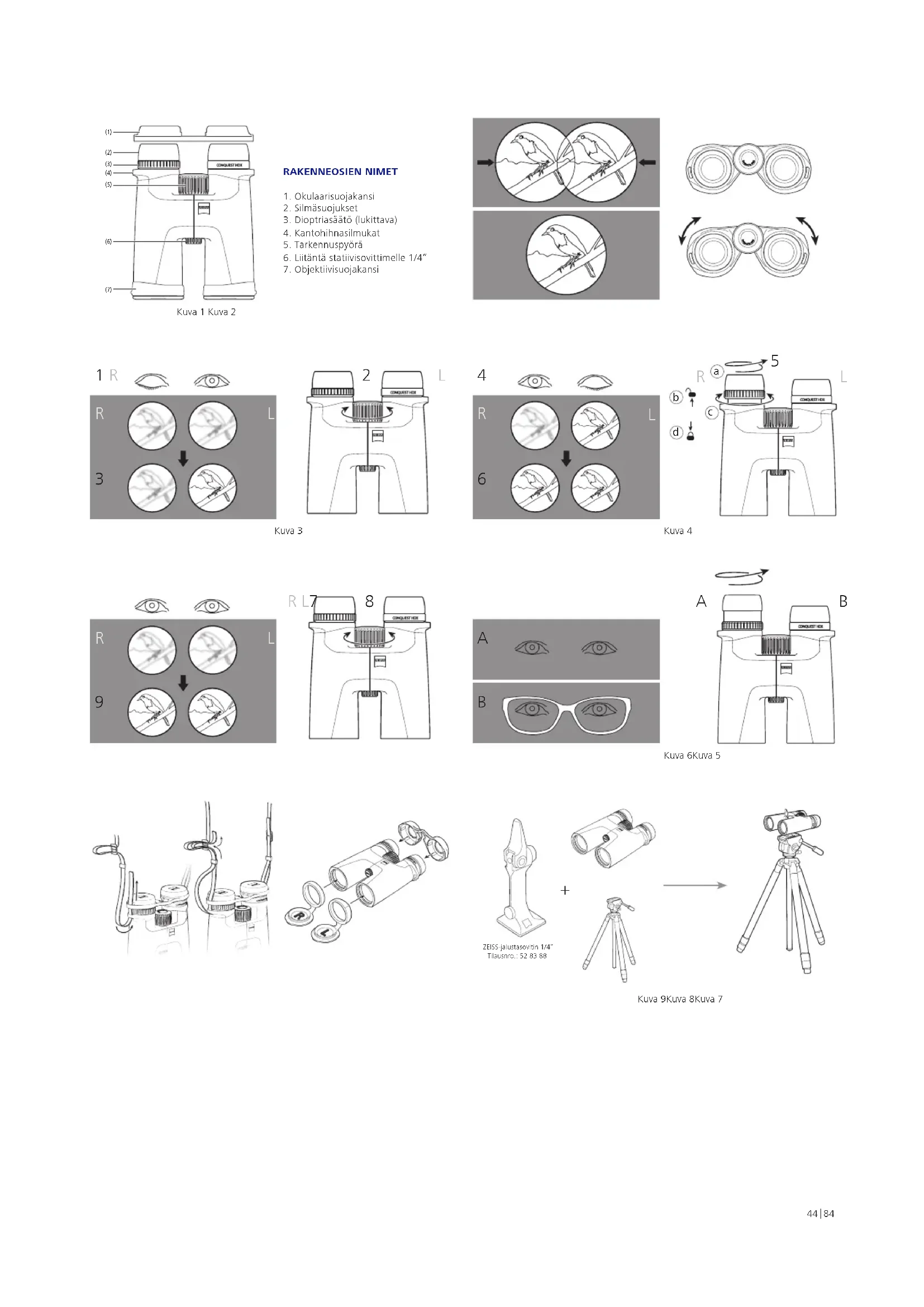 Tuote Tilausnumero Toimituksen sisältö 8 x 32 52 32 14 Kiikarit Okulaarisuojakansi Objektiivisuojakansi Kantohihna Kantolaukku ja kantohihna Optiikan puhdistuspyyhe Pikaopas Turvallisuusohjeet Jalustasovitin ¼” (vain 15 x 56 ja LRP 15 x 56) 10 x 32 52 32 15 8 x 42 52 42 14 10 x 42 52 42 15 8 x 56 52 56 34 10 x 56 52 56 35 15 x 56 52 56 36 15 x 56 LRP 52 56 36 -9901-000 Silmävälin sovittaminen (pupillietäisyys) Taita molempia kiikaripuoliskoja keskiakselin ympärillä vastakkain, kunnes molempien okulaarien etäisyys vastaa silmiesi etäisyyttä. Näin saat aikaan silmillesi ihanteellisen kuvan. Silmien ihanteellinen etäisyys on saavutettu silloin, kun molemmilla silmillä katseltaessa näkyy pyöreä kuva (kuva 2). Kuvan terävyyden säätäminen Kiikareissa on tarkennuspyörä ja pyörä dioptriasäätöön. Sulje säätöä varten oikea silmä ja säädä tarkennuspyörällä vasemman kiikaripuoliskon kuva tarkaksi (kuva 3). Sulje sen jälkeen vasen silmä ja säädä tarvittaessa oikean kiikaripuoliskon kuvantarkkuus dioptriasäädöllä (kuva 4). Lisätietoja löydät seuraavasta kappaleesta. Dioptriasäätö on varustettu asteikolla, jossa on merkit ”+” ja ”–” ja indeksipiste lähtökohtana. Merkitse oma henkilökohtainen asetuksesi. Siten voit säätää oman dioptriasäätösi nopeasti kaikista kiikareista. Eri etäisyyksillä tapahtuvaa tarkennusta varten on käytettävä vain tarkennuspyörää (kuva 5). Ohje: Käytä aina samaa objektia, jotta molemmat kuvat ovat tarkennettuja. Diopterin lukko Kiikareissa on lukitusmekanismi, joka estää diopterikompensaation ei-toivotun säädön (kuva 4). Säädä diopteria ruuvaamalla ensin silmäsuojukset (a) irti. Voit sitten vetää diopterin säätörengasta ylöspäin avataksesi sen (b). Vaihda diopterit edellä kuvatulla tavalla kääntämällä diopterin säätörengasta (c). Kun kuvan tarkennus on säädetty oikein, paina diopterin säätörengasta takaisin alas sen lukitsemiseksi (d). Silmäsuojusten asentaminen, käyttö silmälasien kanssa ja ilman silmälaseja Kun tarkkailet ilman silmälaseja, käytä laitetta silmäsuojukset ulosvedettyinä. Käännä silmäsuojuksia vastapäivään ylöspäin haluamallasi tavalla ylimpään kiinnitykseen asti (kuva 6 – kuva A). Silmäsuojukset on kiinnitettävissä neljään asentoon: ylempään ja alempaan sekä kahteen väliasentoon. Kyseisellä asetusmahdollisuudella voidaan säädellä silmän etäisyyttä lähtöpupilliin ja säätö voidaan siten tehdä yksilöllisesti jokaiselle käyttäjälle. Käytettäessä silmälaseja katselun aikana silmäsuojukset käännetään alaspäin (myötäpäivään), kunnes ne ovat alimmassa asennossa (kuva 6 – kuva B). Ohje: Jos jatkat silmäsuojusten kääntämistä vastapäivään, kun ne ovat uloskierretyssä tilassa, ne voivat irrota. Tämä on tarkoituksellista, katso ”Silmäsuojusten puhdistus ja vaihto”. Silmäsuojusten puhdistus ja vaihto Silmäsuojukset voi kiertää vaihtoa tai puhdistusta varten kokonaan irti kiikareista. Kuten kuvassa 6 on esitetty, kierrä silmäsuojukset ulos ylimpään lukitustasoon asti ja jatka kääntämistä samaan suuntaan kierteen yli, kunnes silmäsuojukset on kokonaan irrotettu. Kun olet puhdistanut tai vaihtanut silmäsuojukset, käännä ne myötäpäivään kokonaan sisään okulaariin (katso myös kohta ”Silmäsuojusten asentaminen, käyttö silmälasien kanssa ja ilman silmälaseja”). Vetämällä hieman myötäpäivään silmäsuojusten kierre kiinnittyy alimpaan asentoon. Lopuksi voit säätää lukitustasoilla tuttuun tapaan haluamasi etäisyyden silmän ja okulaarin välissä. Kantohihnan ja suojakannen kiinnittäminen Kantohihna, okulaarisuojakansi ja objektiivisuojakannet ovat pakkauksessa. Okulaarisuojakansi kiinnitetään kiikareihin kuvassa 7 kuvatulla tavalla kantohihnalla kantohihnasilmukoiden läpi. Hihnan pituus voidaan säätää haluttuun pituuteen hihnaa kiristämällä tai löysäämällä. Menettele okulaarisuojakannen toisella puolella tarvittaessa samassa järjestyksessä. Okulaarisuojakannen voi kiinnittää oman harkinnan mukaan myös vain toiselle puolelle. Objektiivisuojakannet on merkitty merkinnöin ”L” vasenta ja ”R” oikeaa varten, ja ne kiinnitetään vastaavasti vasempaan ja oikeaan putkeen (kuva 8). Okulaari- ja objektiivisuojakansien käyttö Okulaarisuojakansi työnnetään silmäsuojusten päälle (kuva 8). Voit ylläpitää haluamaasi pupillien etäisyyttä. Irrota kansi ennen kiikareiden käyttöä. Objektiivisuojakannet voivat pysyä kiikarissa pysyvästi sen jälkeen, kun ne on kiinnitetty, ja ne on avattava vain ennen käyttöä. Statiivisovittimien kiinnittäminen