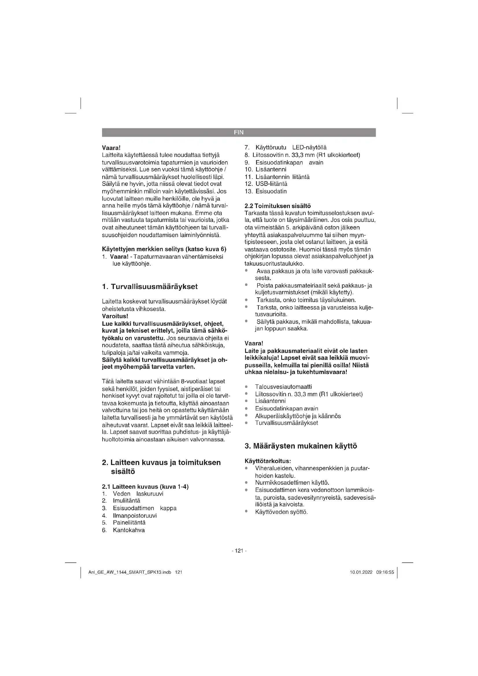 Pitemmän seisonnan jälkeen tarkasta paina- malla päälle-pois-katkaisinta lyhyesti, pyöriikö roottori esteettömästi. Anl_GE_AW_1144_SMART_SPK13.indb 126Anl_GE_AW_1144_SMART_SPK13.indb 126 10.01.2022 09:16:5610.01.2022 09:16:56FIN