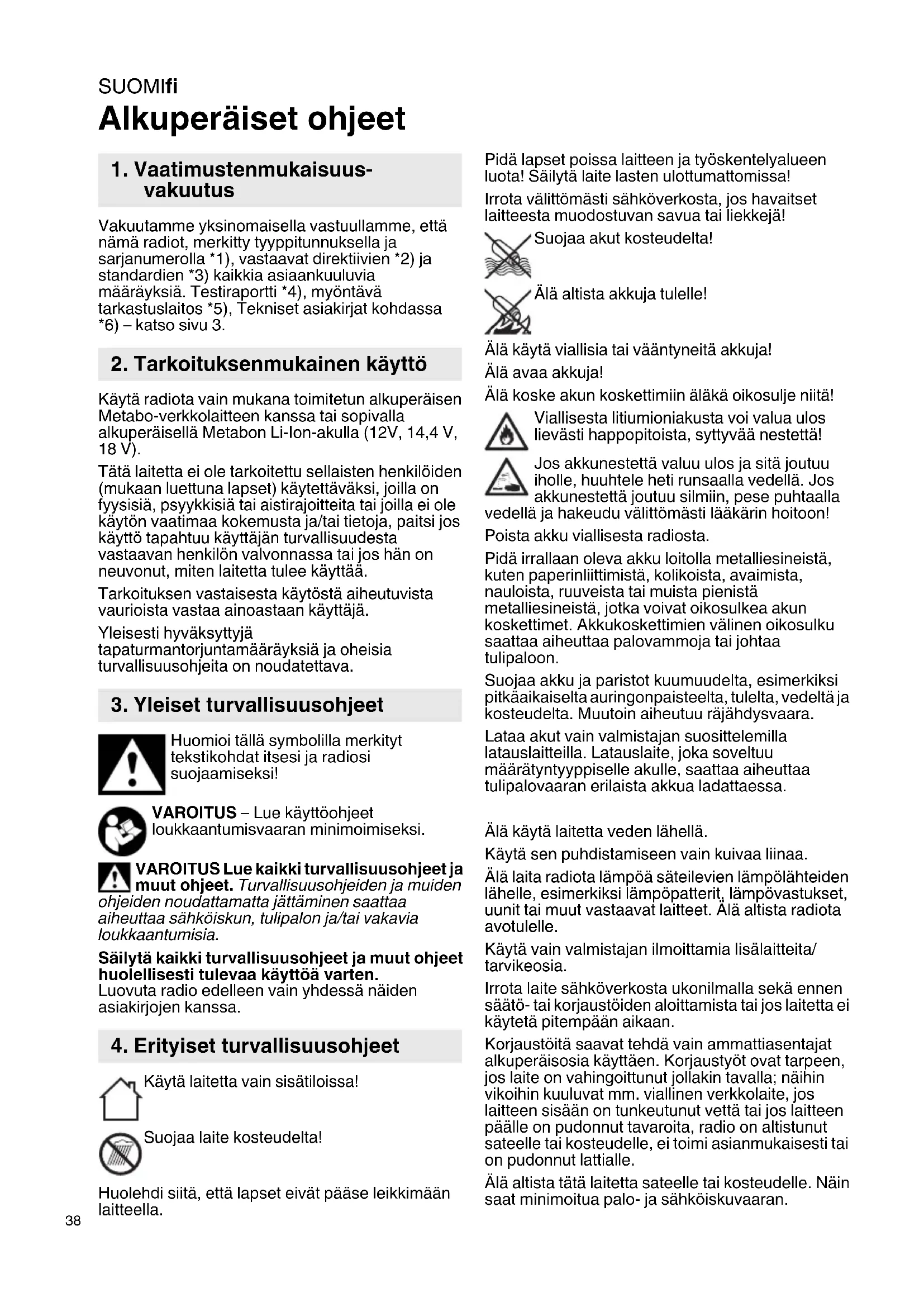 Alkuperäiset ohjeet Vakuutamme yksinomaisella vastuullamme, että nämä radiot, merkitty tyyppitunnuksella ja sarjanumerolla *1), vastaavat direktiivien *2) ja standardien *3) kaikkia asiaankuuluvia määräyksiä. Testiraportti *4), myöntävä tarkastuslaitos *5), Tekniset asiakirjat kohdassa *6) – katso sivu 3. Käytä radiota vain mukana toimitetun alkuperäisen Metabo-verkkolaitteen kanssa tai sopivalla alkuperäisellä Metabon Li-Ion-akulla (12V, 14,4 V, 18 V). Tätä laitetta ei ole tarkoitettu sellaisten henkilöiden (mukaan luettuna lapset) käytettäväksi, joilla on fyysisiä, psyykkisiä tai aistirajoitteita tai joilla ei ole käytön vaatimaa kokemusta ja/tai tietoja, paitsi jos käyttö tapahtuu käyttäjän turvallisuudesta vastaavan henkilön valvonnassa tai jos hän on neuvonut, miten laitetta tulee käyttää. Tarkoituksen vastaisesta käytöstä aiheutuvista vaurioista vastaa ainoastaan käyttäjä. Yleisesti hyväksyttyjä tapaturmantorjuntamääräyksiä ja oheisia turvallisuusohjeita on noudatettava. Huomioi tällä symbolilla merkityt tekstikohdat itsesi ja radiosi suojaamiseksi! VAROITUS – Lue käyttöohjeet loukkaantumisvaaran minimoimiseksi. VAROITUS Lue kaikki turvallisuusohjeet ja muut ohjeet. Turvallisuusohjeiden ja muiden ohjeiden noudattamatta jättäminen saattaa aiheuttaa sähköiskun, tulipalon ja/tai vakavia loukkaantumisia. Säilytä kaikki turvallisuusohjeet ja muut ohjeet huolellisesti tulevaa käyttöä varten. Luovuta radio edelleen vain yhdessä näiden asiakirjojen kanssa. Käytä laitetta vain sisätiloissa! Suojaa laite kosteudelta! Huolehdi siitä, että lapset eivät pääse leikkimään laitteella. Pidä lapset poissa laitteen ja työskentelyalueen luota! Säilytä laite lasten ulottumattomissa! Irrota välittömästi sähköverkosta, jos havaitset laitteesta muodostuvan savua tai liekkejä! Suojaa akut kosteudelta! Älä altista akkuja tulelle! Älä käytä viallisia tai vääntyneitä akkuja! Älä avaa akkuja! Älä koske akun koskettimiin äläkä oikosulje niitä! Viallisesta litiumioniakusta voi valua ulos lievästi happopitoista, syttyvää nestettä! Jos akkunestettä valuu ulos ja sitä joutuu iholle, huuhtele heti runsaalla vedellä. Jos akkunestettä joutuu silmiin, pese puhtaalla vedellä ja hakeudu välittömästi lääkärin hoitoon! Poista akku viallisesta radiosta. Pidä irrallaan oleva akku loitolla metalliesineistä, kuten paperinliittimistä, kolikoista, avaimista, nauloista, ruuveista tai muista pienistä metalliesineistä, jotka voivat oikosulkea akun koskettimet. Akkukoskettimien välinen oikosulku saattaa aiheuttaa palovammoja tai johtaa tulipaloon. Suojaa akku ja paristot kuumuudelta, esimerkiksi pitkäaikaiselta auringonpaisteelta, tulelta, vedeltä ja kosteudelta. Muutoin aiheutuu räjähdysvaara. Lataa akut vain valmistajan suosittelemilla latauslaitteilla. Latauslaite, joka soveltuu määrätyntyyppiselle akulle, saattaa aiheuttaa tulipalovaaran erilaista akkua ladattaessa. Älä käytä laitetta veden lähellä. Käytä sen puhdistamiseen vain kuivaa liinaa. Älä laita radiota lämpöä säteilevien lämpölähteiden lähelle, esimerkiksi lämpöpatterit, lämpövastukset, uunit tai muut vastaavat laitteet. Älä altista radiota avotulelle. Käytä vain valmistajan ilmoittamia lisälaitteita/ tarvikeosia. Irrota laite sähköverkosta ukonilmalla sekä ennen säätö- tai korjaustöiden aloittamista tai jos laitetta ei käytetä pitempään aikaan. Korjaustöitä saavat tehdä vain ammattiasentajat alkuperäisosia käyttäen. Korjaustyöt ovat tarpeen, jos laite on vahingoittunut jollakin tavalla; näihin vikoihin kuuluvat mm. viallinen verkkolaite, jos laitteen sisään on tunkeutunut vettä tai jos laitteen päälle on pudonnut tavaroita, radio on altistunut sateelle tai kosteudelle, ei toimi asianmukaisesti tai on pudonnut lattialle. Älä altista tätä laitetta sateelle tai kosteudelle. Näin saat minimoitua palo- ja sähköiskuvaaran.