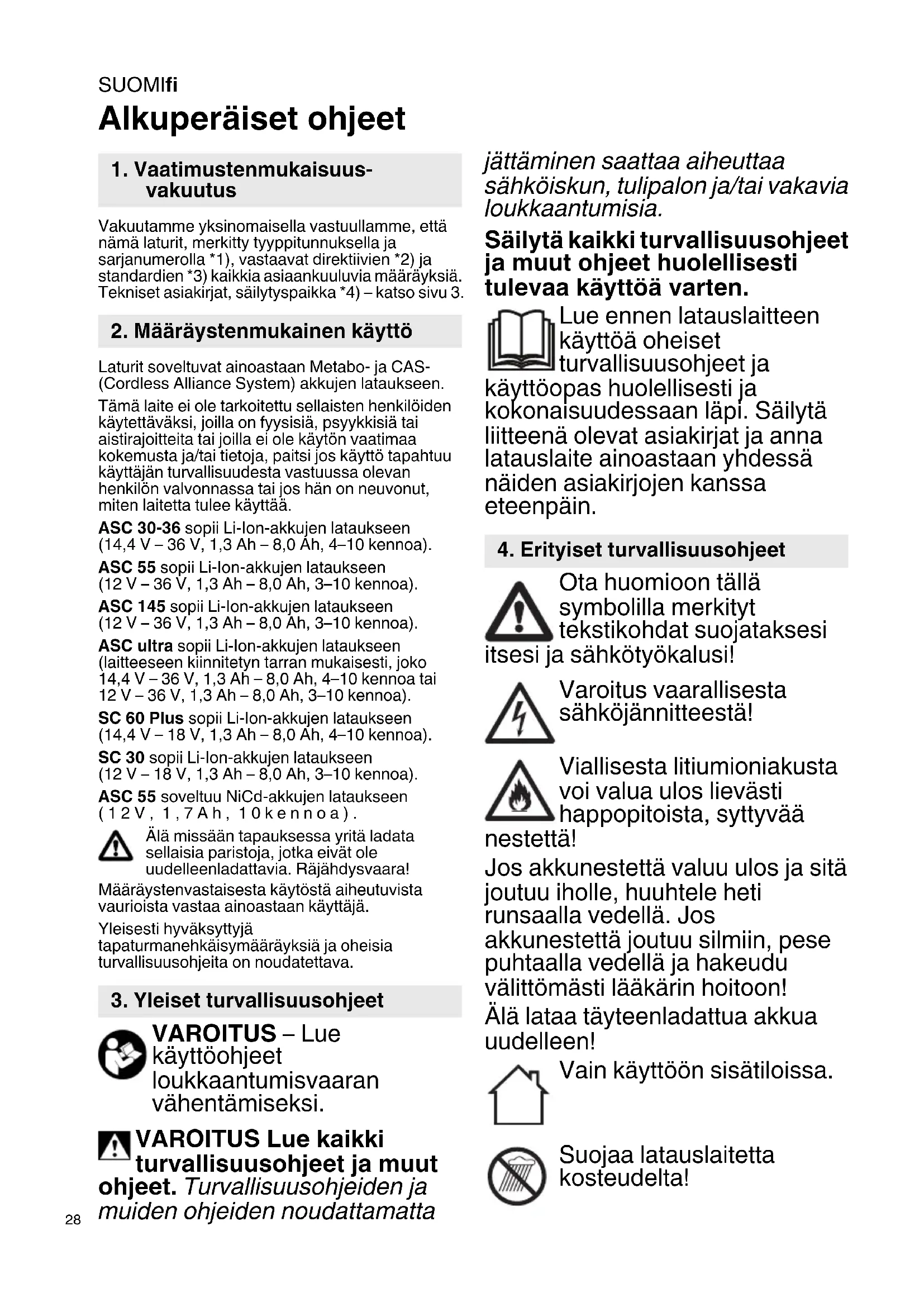 Alkuperäiset ohjeet Vakuutamme yksinomaisella vastuullamme, että nämä laturit, merkitty tyyppitunnuksella ja sarjanumerolla *1), vastaavat direktiivien *2) ja standardien *3) kaikkia asiaankuuluvia määräyksiä. Tekniset asiakirjat, säilytyspaikka *4) – katso sivu 3. Laturit soveltuvat ainoastaan Metabo- ja CAS- (Cordless Alliance System) akkujen lataukseen. Tämä laite ei ole tarkoitettu sellaisten henkilöiden käytettäväksi, joilla on fyysisiä, psyykkisiä tai aistirajoitteita tai joilla ei ole käytön vaatimaa kokemusta ja/tai tietoja, paitsi jos käyttö tapahtuu käyttäjän turvallisuudesta vastuussa olevan henkilön valvonnassa tai jos hän on neuvonut, miten laitetta tulee käyttää. ASC 30-36 sopii Li-Ion-akkujen lataukseen (14,4 V – 36 V, 1,3 Ah – 8,0 Ah, 4–10 kennoa). ASC 55 sopii Li-Ion-akkujen lataukseen (12 V – 36 V, 1,3 Ah – 8,0 Ah, 3–10 kennoa). ASC 145 sopii Li-Ion-akkujen lataukseen (12 V – 36 V, 1,3 Ah – 8,0 Ah, 3–10 kennoa). ASC ultra sopii Li-Ion-akkujen lataukseen (laitteeseen kiinnitetyn tarran mukaisesti, joko 14,4 V – 36 V, 1,3 Ah – 8,0 Ah, 4–10 kennoa tai 12 V – 36 V, 1,3 Ah – 8,0 Ah, 3–10 kennoa). SC 60 Plus sopii Li-Ion-akkujen lataukseen (14,4 V – 18 V, 1,3 Ah – 8,0 Ah, 4–10 kennoa). SC 30 sopii Li-Ion-akkujen lataukseen (12 V – 18 V, 1,3 Ah – 8,0 Ah, 3–10 kennoa). ASC 55 soveltuu NiCd-akkujen lataukseen (12V, 1,7Ah, 10kennoa). Älä missään tapauksessa yritä ladata sellaisia paristoja, jotka eivät ole uudelleenladattavia. Räjähdysvaara! Määräystenvastaisesta käytöstä aiheutuvista vaurioista vastaa ainoastaan käyttäjä. Yleisesti hyväksyttyjä tapaturmanehkäisymääräyksiä ja oheisia turvallisuusohjeita on noudatettava. VAROITUS – Lue käyttöohjeet loukkaantumisvaaran vähentämiseksi. VAROITUS Lue kaikki turvallisuusohjeet ja muut ohjeet. Turvallisuusohjeiden ja muiden ohjeiden noudattamatta jättäminen saattaa aiheuttaa sähköiskun, tulipalon ja/tai vakavia loukkaantumisia. Säilytä kaikki turvallisuusohjeet ja muut ohjeet huolellisesti tulevaa käyttöä varten. Lue ennen latauslaitteen käyttöä oheiset turvallisuusohjeet ja käyttöopas huolellisesti ja kokonaisuudessaan läpi. Säilytä liitteenä olevat asiakirjat ja anna latauslaite ainoastaan yhdessä näiden asiakirjojen kanssa eteenpäin. Ota huomioon tällä symbolilla merkityt tekstikohdat suojataksesi itsesi ja sähkötyökalusi! Varoitus vaarallisesta sähköjännitteestä! Viallisesta litiumioniakusta voi valua ulos lievästi happopitoista, syttyvää nestettä! Jos akkunestettä valuu ulos ja sitä joutuu iholle, huuhtele heti runsaalla vedellä. Jos akkunestettä joutuu silmiin, pese puhtaalla vedellä ja hakeudu välittömästi lääkärin hoitoon! Älä lataa täyteenladattua akkua uudelleen! Vain käyttöön sisätiloissa. Suojaa latauslaitetta kosteudelta!