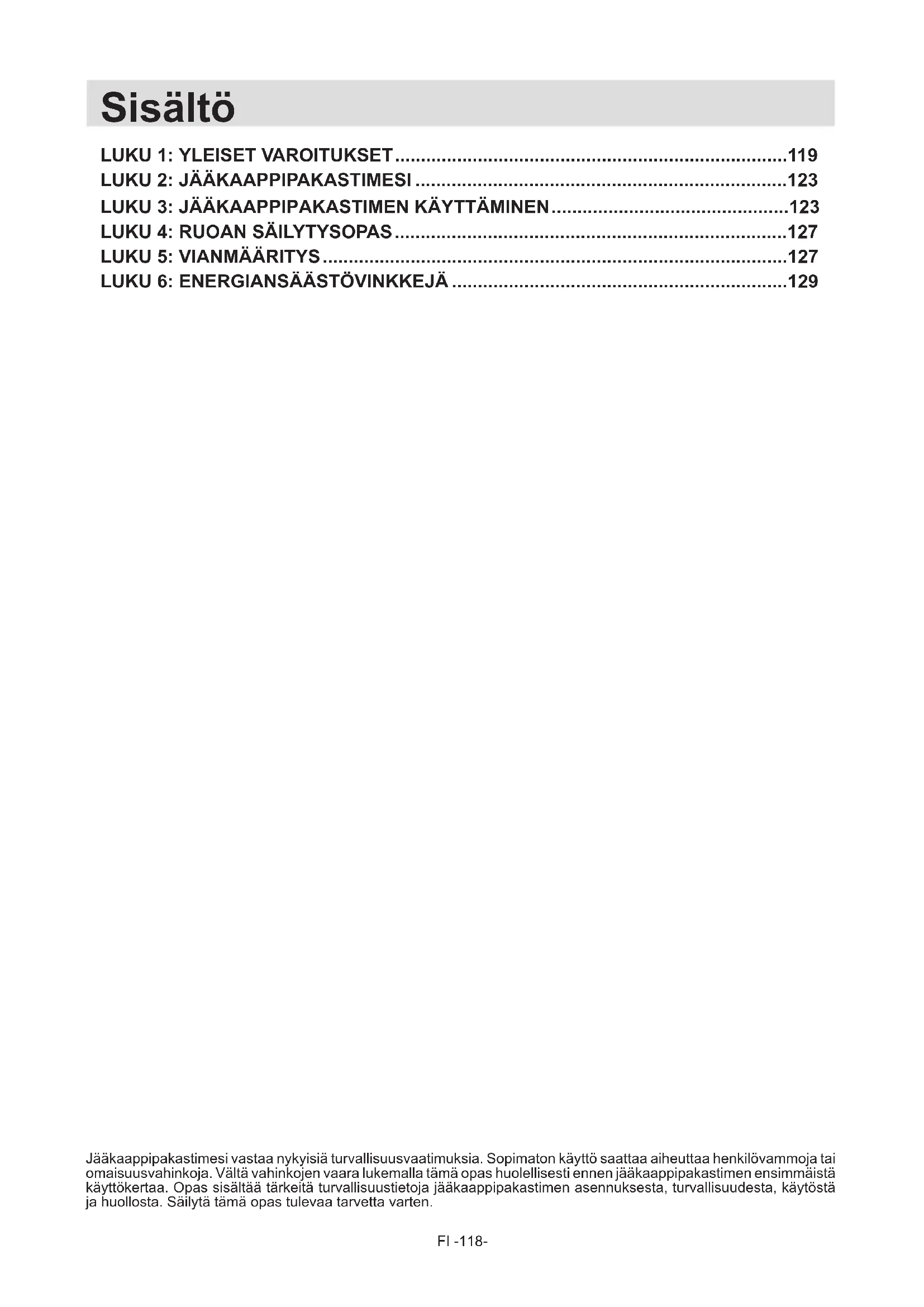 - Tämä laite on tarkoitettu käytettäväksi kotitalouksissa ja se soveltuu vain ruokien jäähdyttämiseen ja säilyttämiseen. Se ei sovellu kaupalliseen tai yleiseen käyttöön eikä muiden aineiden kuin ruoan säilyttämiseen. Yrityksemme ei ole vastuussa muista käyttötavoista aiheutuvista vahingoista. Turvallisuusvaroitukset