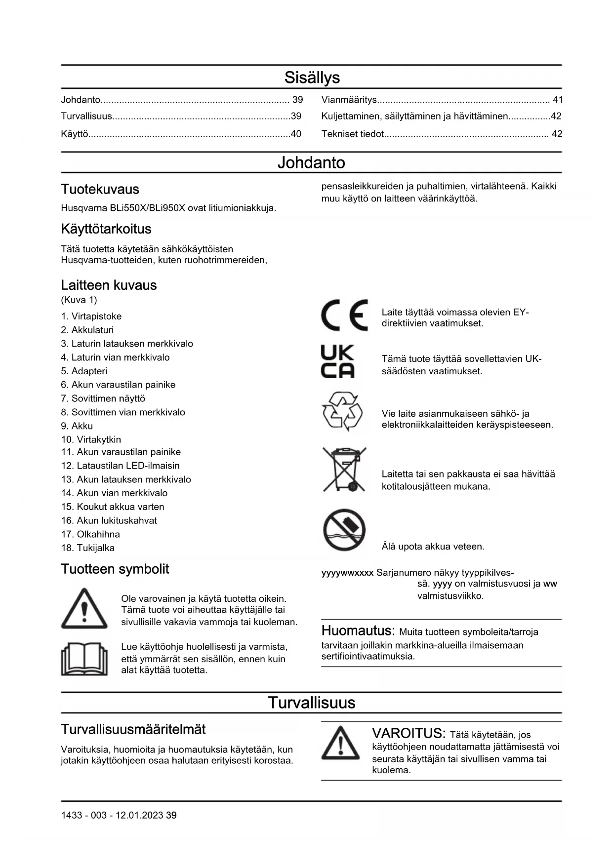 - Põhjalikumat teavet toote taaskäitlemise ja utiliseerimise kohta saate kohalikult Husqvarna edasimüüjalt. Tehnilised andmed Tehnilised andmed leiate aku tüübisildilt. 38 1433 - 003 - 12.01.2023Sisällys Johdanto....................................................................... 39 Turvallisuus...................................................................39 Käyttö............................................................................40 Vianmääritys................................................................. 41 Kuljettaminen, säilyttäminen ja hävittäminen................42 Tekniset tiedot.............................................................. 42 Johdanto Tuotekuvaus Husqvarna BLi550X/BLi950X ovat litiumioniakkuja. Käyttötarkoitus Tätä tuotetta käytetään sähkökäyttöisten Husqvarna-tuotteiden, kuten ruohotrimmereiden, pensasleikkureiden ja puhaltimien, virtalähteenä. Kaikki muu käyttö on laitteen väärinkäyttöä. Laitteen kuvaus (Kuva 1)