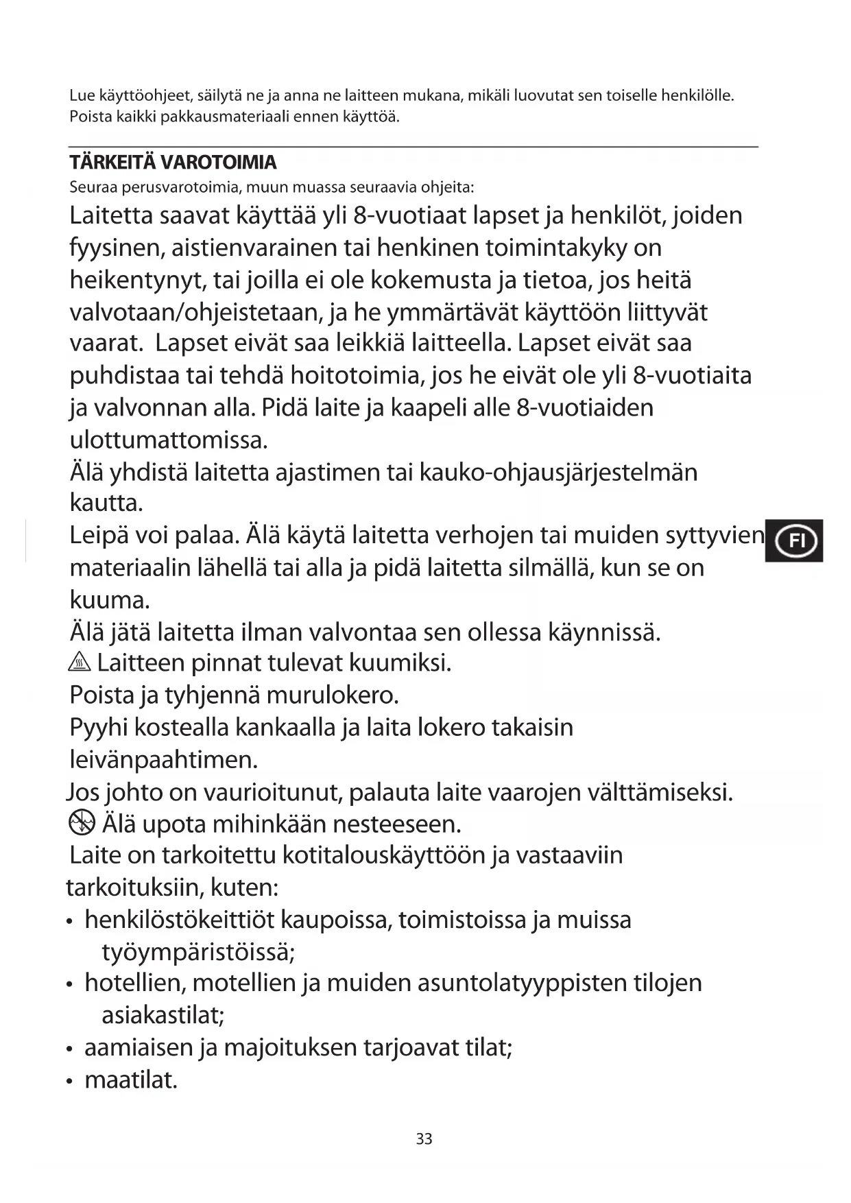 Seuraa perusvarotoimia, muun muassa seuraavia ohjeita: Laitetta saavat käyttää yli 8-vuotiaat lapset ja henkilöt, joiden fyysinen, aistienvarainen tai henkinen toimintakyky on heikentynyt, tai joilla ei ole kokemusta ja tietoa, jos heitä valvotaan/ohjeistetaan, ja he ymmärtävät käyttöön liittyvät vaarat. Lapset eivät saa leikkiä laitteella. Lapset eivät saa puhdistaa tai tehdä hoitotoimia, jos he eivät ole yli 8-vuotiaita ja valvonnan alla. Pidä laite ja kaapeli alle 8-vuotiaiden ulottumattomissa. Älä yhdistä laitetta ajastimen tai kauko-ohjausjärjestelmän kautta. Leipä voi palaa. Älä käytä laitetta verhojen tai muiden syttyvien materiaalin lähellä tai alla ja pidä laitetta silmällä, kun se on kuuma. Älä jätä laitetta ilman valvontaa sen ollessa käynnissä. h Laitteen pinnat tulevat kuumiksi. Poista ja tyhjennä murulokero. Pyyhi kostealla kankaalla ja laita lokero takaisin leivänpaahtimen. Jos johto on vaurioitunut, palauta laite vaarojen välttämiseksi. i Älä upota mihinkään nesteeseen. Laite on tarkoitettu kotitalouskäyttöön ja vastaaviin tarkoituksiin, kuten: