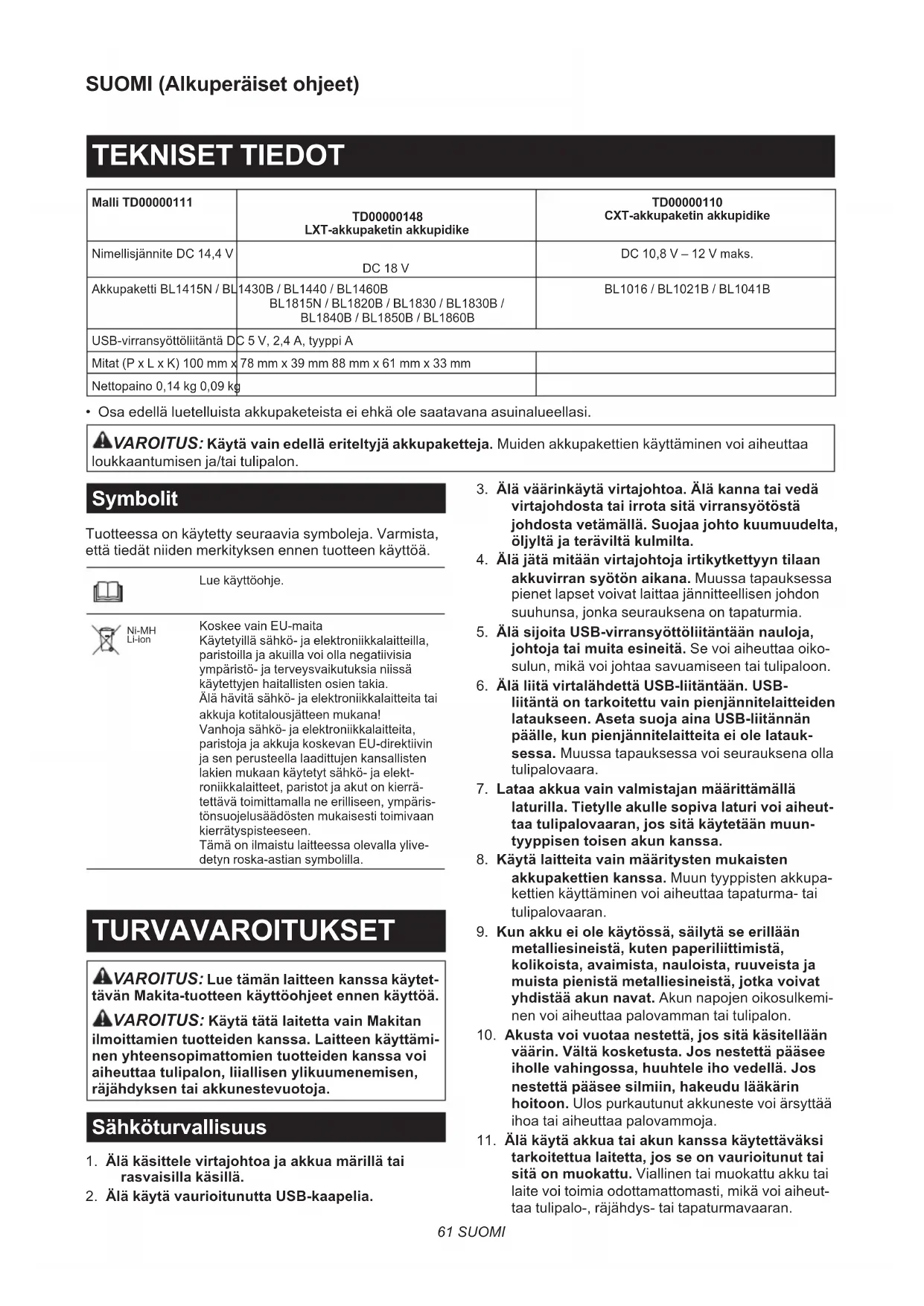 - Osa edellä luetelluista akkupaketeista ei ehkä ole saatavana asuinalueellasi. VAROITUS: Käytä vain edellä eriteltyjä akkupaketteja. Muiden akkupakettien käyttäminen voi aiheuttaa loukkaantumisen ja/tai tulipalon. Symbolit Tuotteessa on käytetty seuraavia symboleja. Varmista, että tiedät niiden merkityksen ennen tuotteen käyttöä. Lue käyttöohje. Ni-MH Li-ion Koskee vain EU-maita Käytetyillä sähkö- ja elektroniikkalaitteilla, paristoilla ja akuilla voi olla negatiivisia ympäristö- ja terveysvaikutuksia niissä käytettyjen haitallisten osien takia. Älä hävitä sähkö- ja elektroniikkalaitteita tai akkuja kotitalousjätteen mukana! Vanhoja sähkö- ja elektroniikkalaitteita, paristoja ja akkuja koskevan EU-direktiivin ja sen perusteella laadittujen kansallisten lakien mukaan käytetyt sähkö- ja elekt- roniikkalaitteet, paristot ja akut on kierrä- tettävä toimittamalla ne erilliseen, ympäris- tönsuojelusäädösten mukaisesti toimivaan kierrätyspisteeseen. Tämä on ilmaistu laitteessa olevalla ylive- detyn roska-astian symbolilla. TURVAVAROITUKSET VAROITUS: Lue tämän laitteen kanssa käytet- tävän Makita-tuotteen käyttöohjeet ennen käyttöä. VAROITUS: Käytä tätä laitetta vain Makitan ilmoittamien tuotteiden kanssa. Laitteen käyttämi- nen yhteensopimattomien tuotteiden kanssa voi aiheuttaa tulipalon, liiallisen ylikuumenemisen, räjähdyksen tai akkunestevuotoja. Sähköturvallisuus