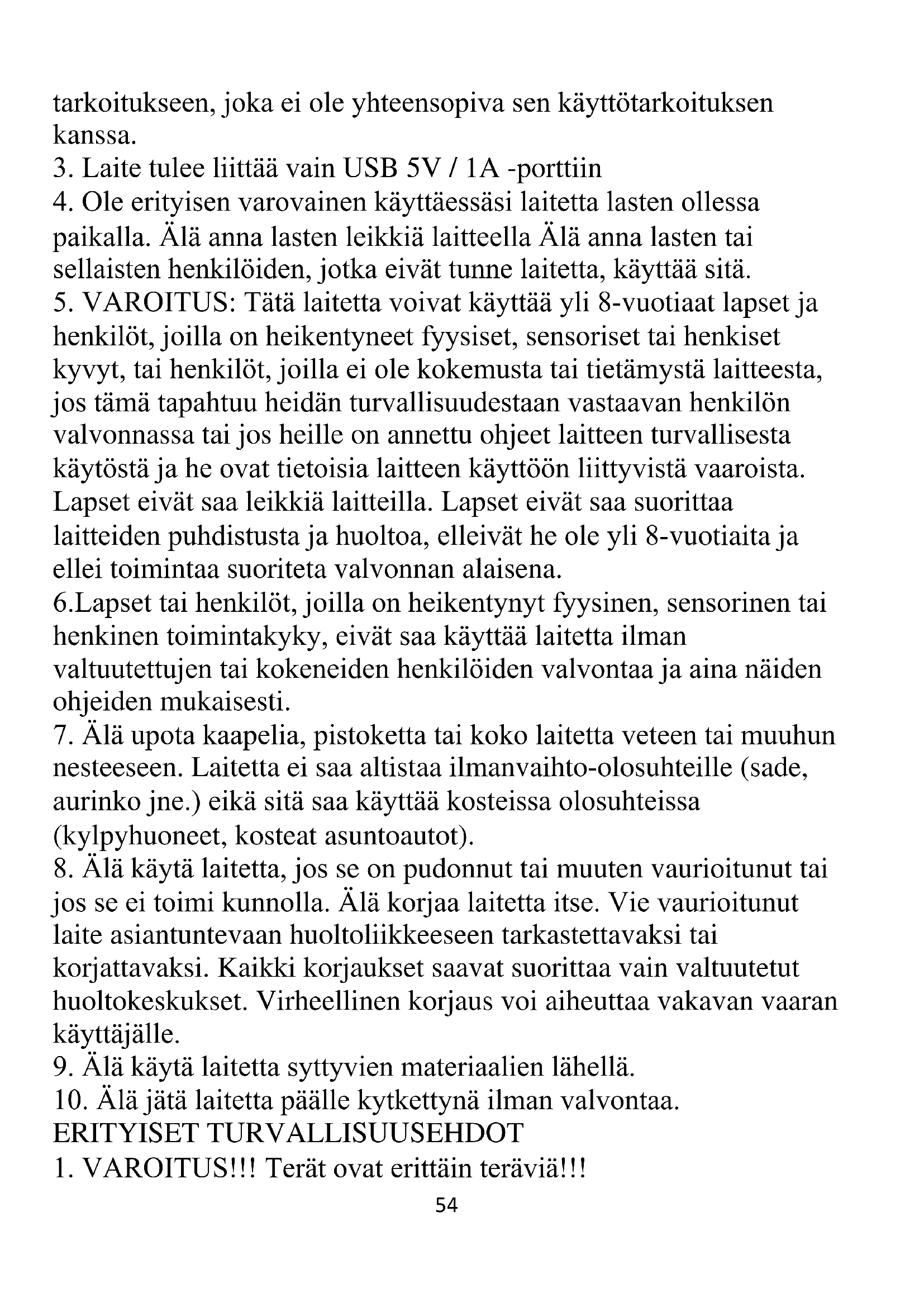 henkilöt, joilla on heikentyneet fyysiset, sensoriset tai henkiset kyvyt, tai henkilöt, joilla ei ole kokemusta tai tietämystä laitteesta, jos tämä tapahtuu heidän turvallisuudestaan vastaavan henkilön valvonnassa tai jos heille on annettu ohjeet laitteen turvallisesta käytöstä ja he ovat tietoisia laitteen käyttöön liittyvistä vaaroista. Lapset eivät saa leikkiä laitteilla. Lapset eivät saa suorittaa laitteiden puhdistusta ja huoltoa, elleivät he ole yli 8-vuotiaita ja ellei toimintaa suoriteta valvonnan alaisena. 6.Lapset tai henkilöt, joilla on heikentynyt fyysinen, sensorinen tai henkinen toimintakyky, eivät saa käyttää laitetta ilman valtuutettujen tai kokeneiden henkilöiden valvontaa ja aina näiden ohjeiden mukaisesti.