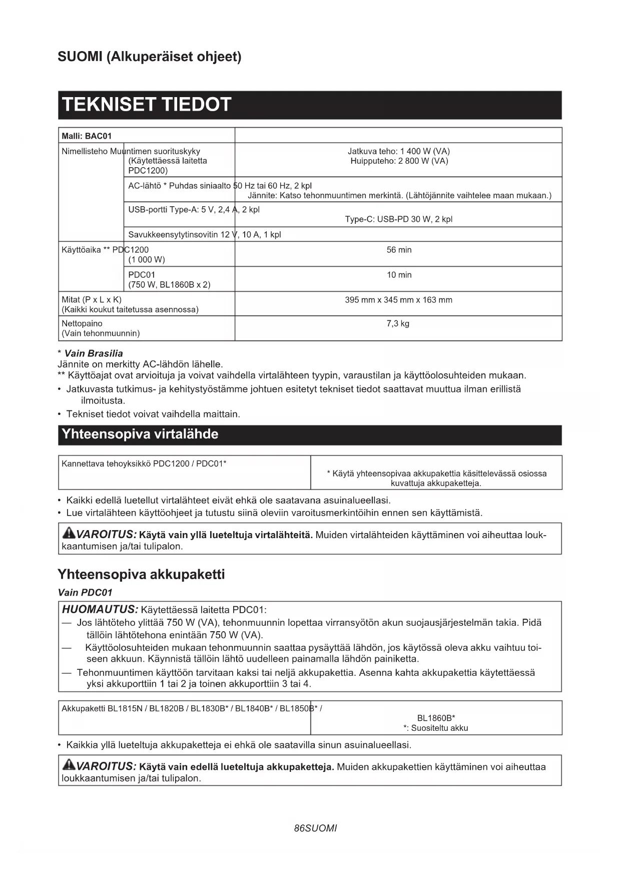 - MAKPAC MERK: Enkelte elementer i listen kan være inkludert som standardtilbehør i verktøypakken. Elementene kan variere fra land til land.86 SUOMI SUOMI (Alkuperäiset ohjeet) TEKNISET TIEDOT Malli: BAC01 Nimellisteho Muuntimen suorituskyky (Käytettäessä laitetta PDC1200) Jatkuva teho: 1 400 W (VA) Huipputeho: 2 800 W (VA) AC-lähtö * Puhdas siniaalto 50 Hz tai 60 Hz, 2 kpl Jännite: Katso tehonmuuntimen merkintä. (Lähtöjännite vaihtelee maan mukaan.) USB-portti Type-A: 5 V, 2,4 A, 2 kpl Type-C: USB-PD 30 W, 2 kpl Savukkeensytytinsovitin 12 V, 10 A, 1 kpl Käyttöaika ** PDC1200 (1 000 W) 56 min PDC01 (750 W, BL1860B x 2) 10 min Mitat (P x L x K) (Kaikki koukut taitetussa asennossa) 395 mm x 345 mm x 163 mm Nettopaino (Vain tehonmuunnin) 7,3 kg