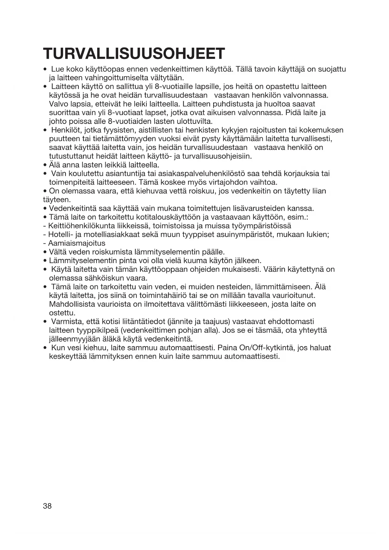 - Lue koko käyttöopas ennen vedenkeittimen käyttöä. Tällä tavoin käyttäjä on suojattu ja laitteen vahingoittumiselta vältytään.