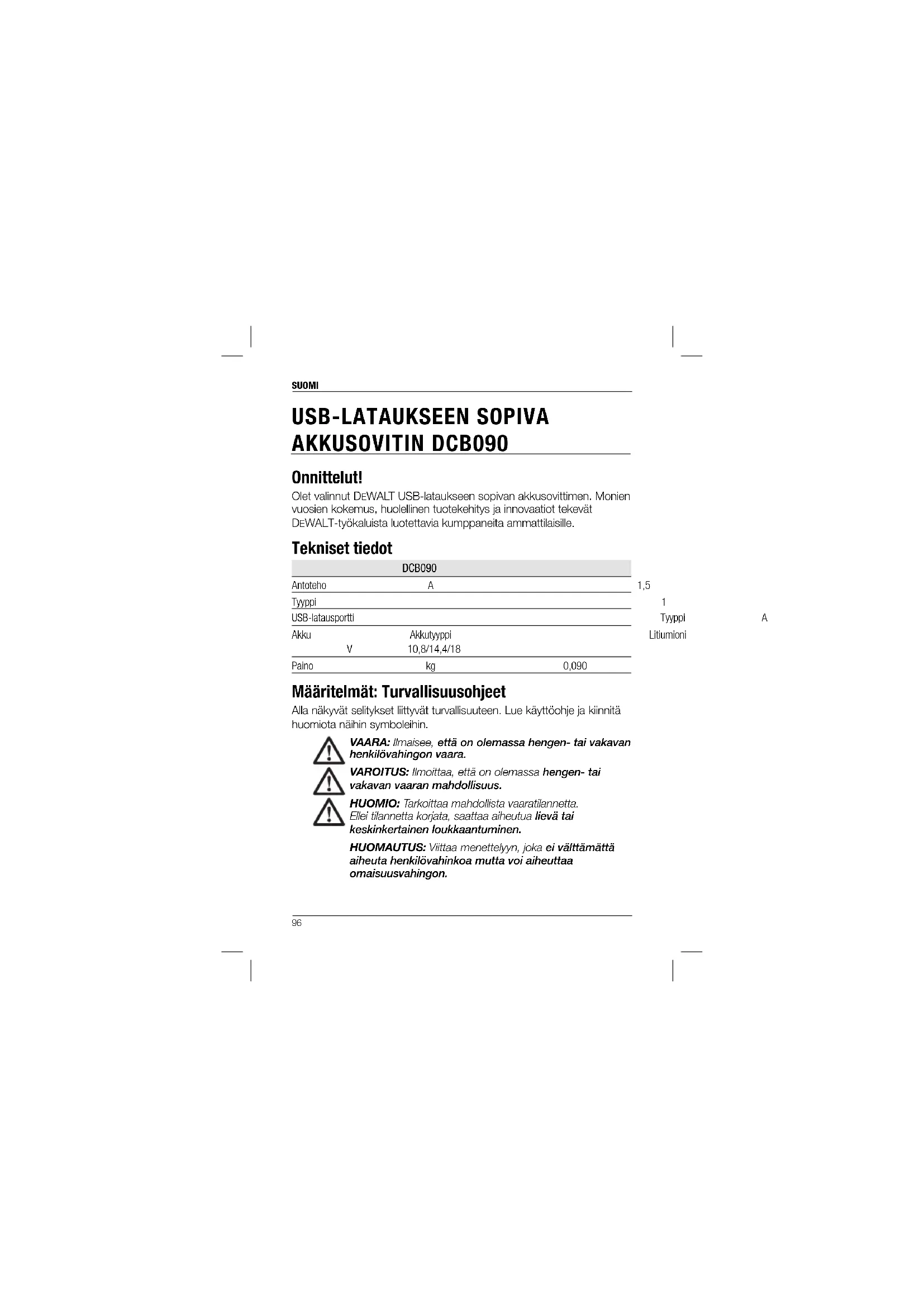 USB-LATAUKSEEN SOPIVA AKKUSOVITIN DCB090 Onnittelut! Olet valinnut DEWALT USB-lataukseen sopivan akkusovittimen. Monien vuosien kokemus, huolellinen tuotekehitys ja innovaatiot tekevät DEWALT-työkaluista luotettavia kumppaneita ammattilaisille. Tekniset tiedot DCB090 Antoteho A 1,5 Tyyppi 1 USB-latausportti Tyyppi A Akku Akkutyyppi Litiumioni V 10,8/14,4/18 Paino kg 0,090 Määritelmät: Turvallisuusohjeet Alla näkyvät selitykset liittyvät turvallisuuteen. Lue käyttöohje ja kiinnitä huomiota näihin symboleihin. VAARA: Ilmaisee, että on olemassa hengen- tai vakavan henkilövahingon vaara. VAROITUS: Ilmoittaa, että on olemassa hengen- tai vakavan vaaran mahdollisuus. HUOMIO: Tarkoittaa mahdollista vaaratilannetta. Ellei tilannetta korjata, saattaa aiheutua lievä tai keskinkertainen loukkaantuminen. HUOMAUTUS: Viittaa menettelyyn, joka ei välttämättä aiheuta henkilövahinkoa mutta voi aiheuttaa omaisuusvahingon.SUOMI