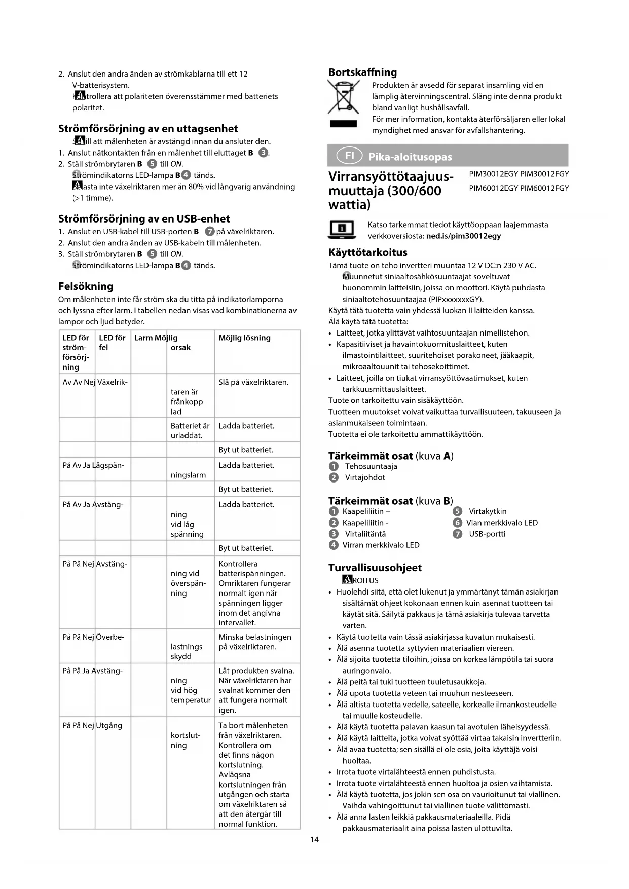 Pika-aloitusopas Virransyöttötaajuus- muuttaja (300/600 wattia) PIM30012EGY PIM30012FGY PIM60012EGY PIM60012FGYKatso tarkemmat tiedot käyttöoppaan laajemmasta verkkoversiosta: ned.is/pim30012egy Käyttötarkoitus Tämä tuote on teho invertteri muuntaa 12 V DC:n 230 V AC. Muunnetut siniaaltosähkösuuntaajat soveltuvat huonommin laitteisiin, joissa on moottori. Käytä puhdasta siniaaltotehosuuntaajaa (PIPxxxxxxxGY).Käytä tätä tuotetta vain yhdessä luokan II laitteiden kanssa.Älä käytä tätä tuotetta:• Laitteet, jotka ylittävät vaihtosuuntaajan nimellistehon.• Kapasitiiviset ja havaintokuormituslaitteet, kuten ilmastointilaitteet, suuritehoiset porakoneet, jääkaapit, mikroaaltouunit tai tehosekoittimet.• Laitteet, joilla on tiukat virransyöttövaatimukset, kuten tarkkuusmittauslaitteet.Tuote on tarkoitettu vain sisäkäyttöön.Tuotteen muutokset voivat vaikuttaa turvallisuuteen, takuuseen ja asianmukaiseen toimintaan.Tuotetta ei ole tarkoitettu ammattikäyttöön. Tärkeimmät osat (kuva A) 1 Tehosuuntaaja2 Virtajohdot Tärkeimmät osat (kuva B) 1 Kaapeliliitin +2 Kaapeliliitin -3 Virtaliitäntä4 Virran merkkivalo LED5 Virtakytkin6 Vian merkkivalo LED7 USB-portti Turvallisuusohjeet