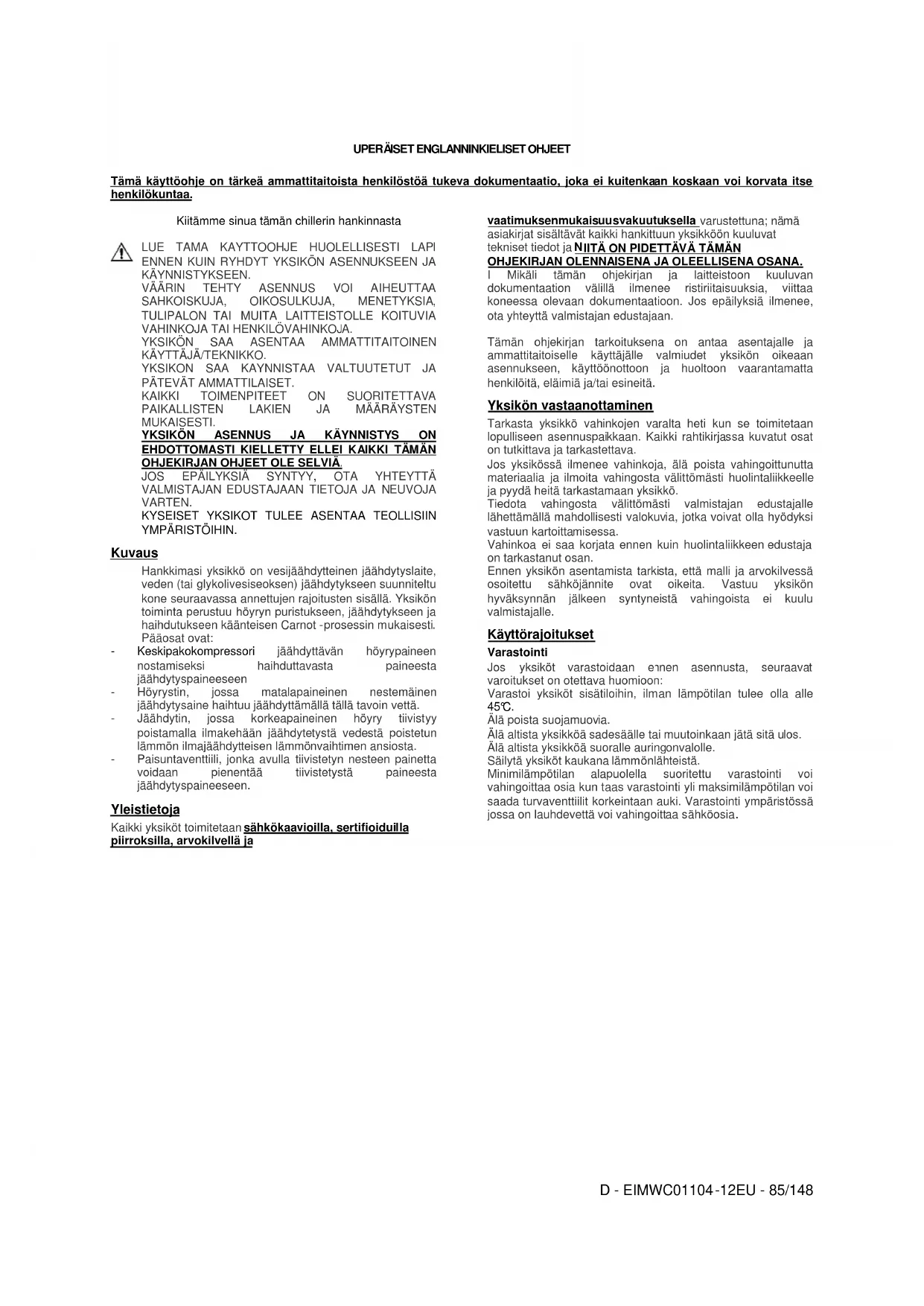 Yksi- j a kolmivaihekuormitusten samanaikaisuus ja eri vaiheiden välinen epätasapainoisuus voi aiheuttaa vuotoja maahan mallistoon kuuluvien yksikköjen vakiotoiminnan aikana. Jos yksikköön kuuluu laitteita, jotka saavat aikaan korkeampia jänniteyliaaltoja (kuten V FD ja vaiheen katkaisu), maahan suuntaavat vuodot voivat nousta paljon korkeampiin arvoihin (noin 2 ampeeria). Sähkövirran syöttöjärjestelmän suojukset on suunniteltava edellä mainittujen arvojen mukaisesti Käyttö Koneenkäyttäjän vastuu On oleellista, että koneenkäyttäjää koulutetaan kunnolla ja perehdytetään järjestelmän toimintaan ennen yksikön käyttöä. Tämä ohjekirjan lukemisen jälkeen, käyttäjän on opiskeltava mikroprosessorin käyttöohje ja sähkökaavio käynnistyksen, toiminnan, pysäytyksen ja kaikkien t toimintajaksojen ymmärtämiseksi. Yksikön ensimmäisen käynnistysvaiheen jälkeen, valtuutettu teknikko on käytettävissä vastaamaan mihin tahansa kysymykseen ja antamaan toimintaan liittyviä ohjeita. EIMWC01104 -12EU - 88/148 Takuu ei kata jäätymisestä aiheutuvia vahinkoja.