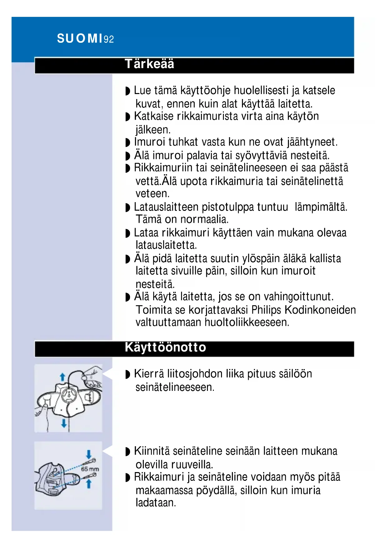 Rikkaimuriin tai seinatelineeseen ei saa paastavetta. Alä upota rikkaimuria tai seinatelinettaveteen.