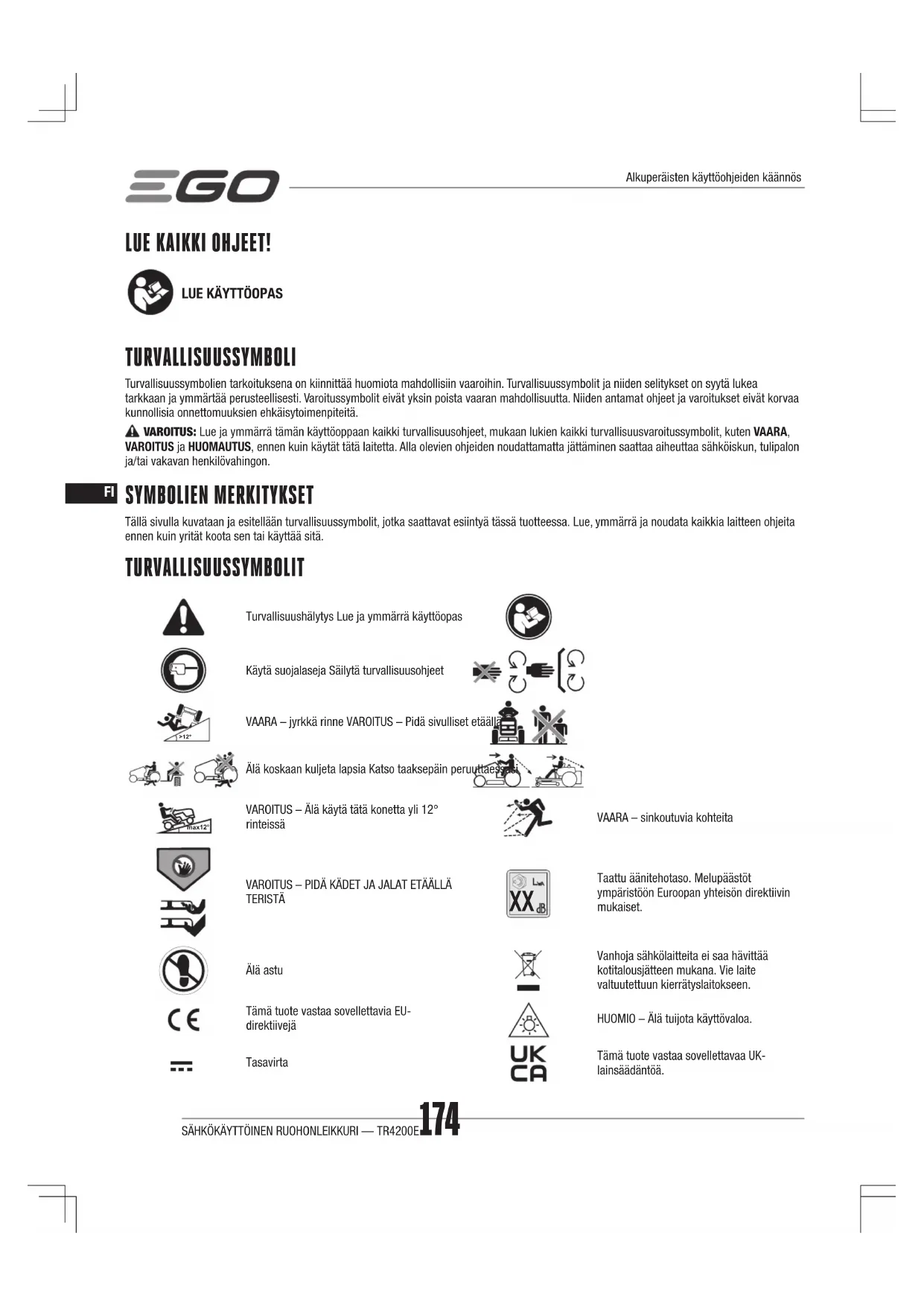 TURVALLISUUSSYMBOLI Turvallisuussymbolien tarkoituksena on kiinnittää huomiota mahdollisiin vaaroihin. Turvallisuussymbolit ja niiden selitykset on syytä lukea tarkkaan ja ymmärtää perusteellisesti. Varoitussymbolit eivät yksin poista vaaran mahdollisuutta. Niiden antamat ohjeet ja varoitukset eivät korvaa kunnollisia onnettomuuksien ehkäisytoimenpiteitä. VAROITUS: Lue ja ymmärrä tämän käyttöoppaan kaikki turvallisuusohjeet, mukaan lukien kaikki turvallisuusvaroitussymbolit, kuten VAARA, VAROITUS ja HUOMAUTUS, ennen kuin käytät tätä laitetta. Alla olevien ohjeiden noudattamatta jättäminen saattaa aiheuttaa sähköiskun, tulipalon ja/tai vakavan henkilövahingon. SYMBOLIEN MERKITYKSET Tällä sivulla kuvataan ja esitellään turvallisuussymbolit, jotka saattavat esiintyä tässä tuotteessa. Lue, ymmärrä ja noudata kaikkia laitteen ohjeita ennen kuin yrität koota sen tai käyttää sitä. TURVALLISUUSSYMBOLIT Turvallisuushälytys Lue ja ymmärrä käyttöopasKäytä suojalaseja Säilytä turvallisuusohjeet>12°VAARA – jyrkkä rinne VAROITUS – Pidä sivulliset etäälläÄlä koskaan kuljeta lapsia Katso taaksepäin peruuttaessasimax12°VAROITUS – Älä käytä tätä konetta yli 12° rinteissäVAARA – sinkoutuvia kohteitaVAROITUS – PIDÄ KÄDET JA JALAT ETÄÄLLÄ TERISTÄ Taattu äänitehotaso. Melupäästöt ympäristöön Euroopan yhteisön direktiivin mukaiset.Älä astuVanhoja sähkölaitteita ei saa hävittää kotitalousjätteen mukana. Vie laite valtuutettuun kierrätyslaitokseen.Tämä tuote vastaa sovellettavia EU-direktiivejäHUOMIO – Älä tuijota käyttövaloa.TasavirtaTämä tuote vastaa sovellettavaa UK-lainsäädäntöä.Alkuperäisten käyttöohjeiden käännös175SÄHKÖKÄYTTÖINEN RUOHONLEIKKURI — TR4200E