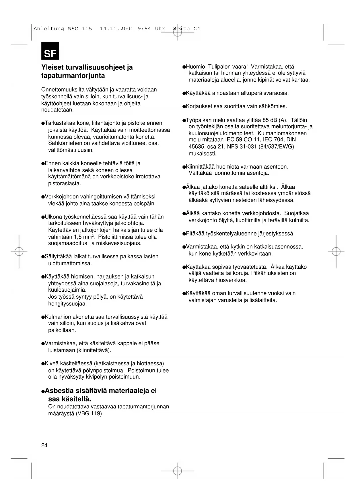 Spännfläns Flänsmutter Arrangemang av flänsen vid användning av en rak avskiljnngsskiva Anleitung WSC 115 14.11.2001 9:54 Uhr Seite 2324 Yleiset turvallisuusohjeet ja tapaturmantorjunta Onnettomuuksilta vältytään ja vaaratta voidaan työskennellä vain silloin, kun turvallisuus- ja käyttöohjeet luetaan kokonaan ja ohjeita noudatetaan. Tarkastakaa kone, liitäntäjohto ja pistoke ennen jokaista käyttöä. Käyttäkää vain moitteettomassa kunnossa olevaa, vaurioitumatonta konetta. Sähkömiehen on vaihdettava vioittuneet osat välittömästi uusiin. Ennen kaikkia koneelle tehtäviä töitä ja laikanvaihtoa sekä koneen ollessa käyttämättömänä on verkkopistoke irrotettava pistorasiasta. Verkkojohdon vahingoittumisen välttämiseksi viekää johto aina taakse koneesta poispäin. Ulkona työskenneltäessä saa käyttää vain tähän tarkoitukseen hyväksyttyjä jatkojohtoja. Käytettävien jatkojohtojen halkaisijan tulee olla vähintään 1,5 mm