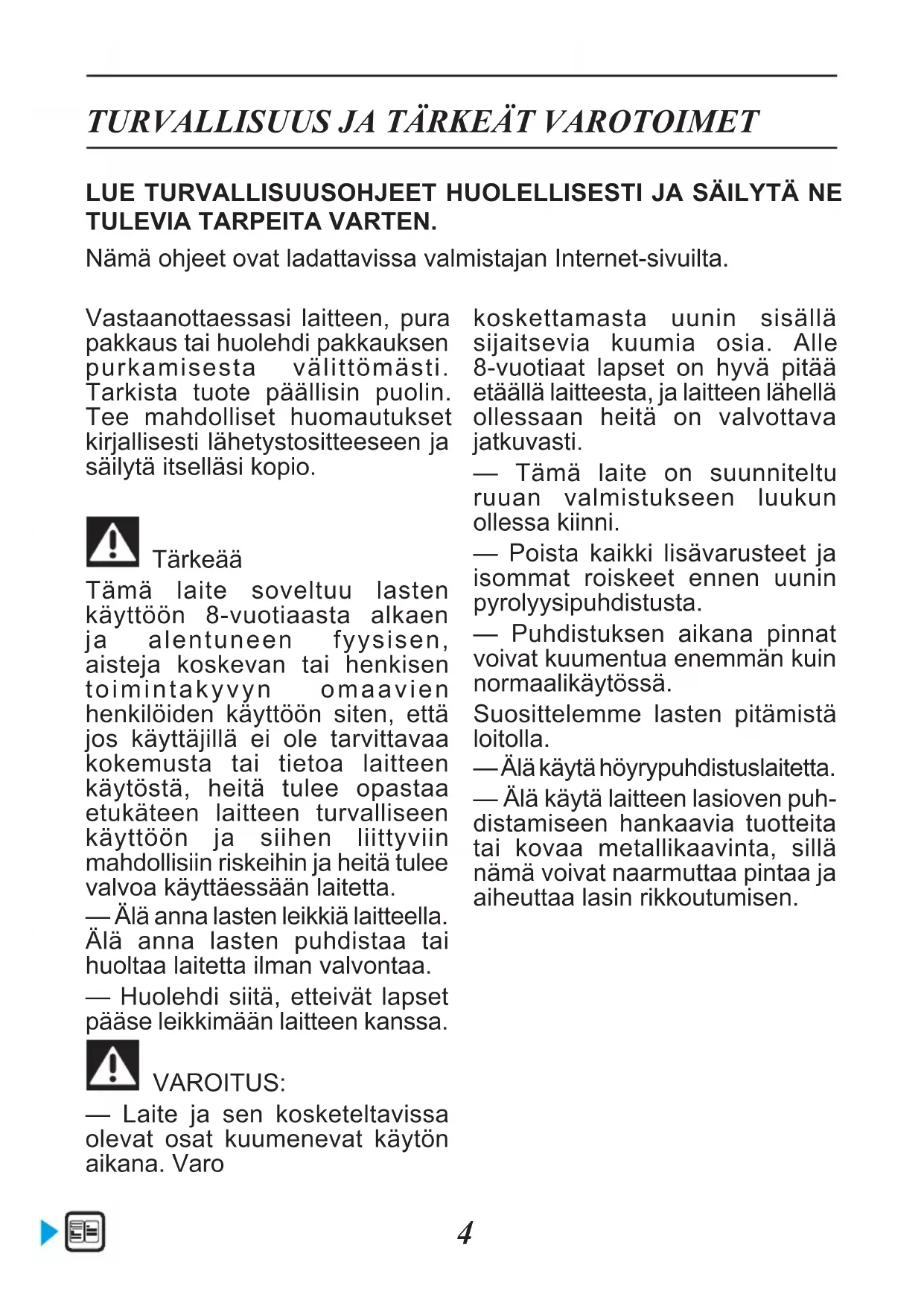 Vastaanottaessasi laitteen, pura pakkaus tai huolehdi pakkauksen purkamisesta välittömästi. Tarkista tuote päällisin puolin. Tee mahdolliset huomautukset kirjallisesti lähetystositteeseen ja säilytä itselläsi kopio. Tärkeää Tämä laite soveltuu lasten käyttöön 8-vuotiaasta alkaen ja alentuneen fyysisen, aisteja koskevan tai henkisen toimintakyvyn omaavien henkilöiden käyttöön siten, että jos käyttäjillä ei ole tarvittavaa kokemusta tai tietoa laitteen käytöstä, heitä tulee opastaa etukäteen laitteen turvalliseen käyttöön ja siihen liittyviin mahdollisiin riskeihin ja heitä tulee valvoa käyttäessään laitetta. — Älä anna lasten leikkiä laitteella. Älä anna lasten puhdistaa tai huoltaa laitetta ilman valvontaa. — Huolehdi siitä, etteivät lapset pääse leikkimään laitteen kanssa. VAROITUS: — Laite ja sen kosketeltavissa olevat osat kuumenevat käytön aikana. Varo koskettamasta uunin sisällä sijaitsevia kuumia osia. Alle 8-vuotiaat lapset on hyvä pitää etäällä laitteesta, ja laitteen lähellä ollessaan heitä on valvottava jatkuvasti. — Tämä laite on suunniteltu ruuan valmistukseen luukun ollessa kiinni. — Poista kaikki lisävarusteet ja isommat roiskeet ennen uunin pyrolyysipuhdistusta. — Puhdistuksen aikana pinnat voivat kuumentua enemmän kuin normaalikäytössä. Suosittelemme lasten pitämistä loitolla. — Älä käytä höyrypuhdistuslaitetta. — Älä käytä laitteen lasioven puh- distamiseen hankaavia tuotteita tai kovaa metallikaavinta, sillä nämä voivat naarmuttaa pintaa ja aiheuttaa lasin rikkoutumisen. LUE TURVALLISUUSOHJEET HUOLELLISESTI JA SÄILYTÄ NE TULEVIA TARPEITA VARTEN. Nämä ohjeet ovat ladattavissa valmistajan Internet-sivuilta.5