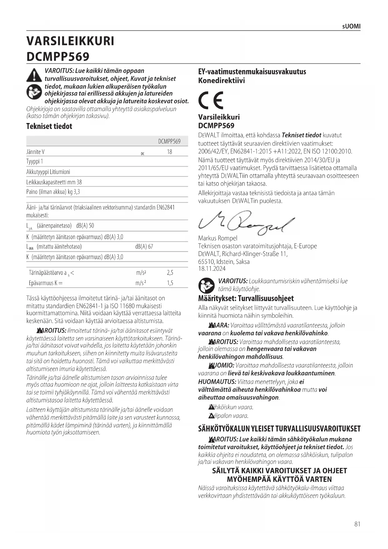 VAROITUS: Varoittaa mahdollisesta vaaratilanteesta, jolloin olemassa on hengenvaara tai vakavan henkilövahingonmahdollisuus. HUOMIO: Varoittaa mahdollisesta vaaratilanteesta, jolloin vaarana on lievä tai keskivakavaloukkaantuminen.HUOMAUTUS: Viittaa menettelyyn, joka ei välttämättä aiheuta henkilövahinkoa mutta voi aiheuttaaomaisuusvahingon. Sähköiskunvaara. Tulipalonvaara. EY‑vaatimustenmukaisuusvakuutus Konedirektiivi Varsileikkuri DCMPP569 DeWALT ilmoittaa, että kohdassa Tekniset tiedot kuvatut tuotteet täyttävät seuraavien direktiivien vaatimukset: 2006/42/EY, EN62841-1:2015 +A11:2022, EN ISO 12100:2010.Nämä tuotteet täyttävät myös direktiivien 2014/30/EU ja 2011/65/EU vaatimukset. Pyydä tarvittaessa lisätietoa ottamalla yhteyttä DeWALTiin ottamalla yhteyttä seuraavaan osoitteeseen tai katso ohjekirjan takaosa.Allekirjoittaja vastaa teknisistä tiedoista ja antaa tämän vakuutuksenDeWALTin puolesta.Markus Rompel Teknisen osaston varatoimitusjohtaja, E-Europe DeWALT, Richard-Klinger-Straße 11, 65510, Idstein, Saksa 18.11.2024Tässä käyttöohjeessa ilmoitetut tärinä- ja/tai äänitasot on mitattu standardien EN62841-1 ja ISO 11680 mukaisesti kuormittamattomina. Niitä voidaan käyttää verrattaessa laitteita keskenään. Sitä voidaan käyttää arvioitaessa altistumista. VAROITUS: Ilmoitetut tärinä- ja/tai äänitasot esiintyvät käytettäessä laitetta sen varsinaiseen käyttötarkoitukseen. Tärinä- ja/tai äänitasot voivat vaihdella, jos laitetta käytetään johonkin muuhun tarkoitukseen, siihen on kiinnitetty muita lisävarusteita tai sitä on hoidettu huonosti. Tämä voi vaikuttaa merkittävästi altistumiseen imuria käytettäessä.Tärinälle ja/tai äänelle altistumisen tason arvioinnissa tulee myös ottaa huomioon ne ajat, jolloin laitteesta katkaistaan virta tai se toimii tyhjäkäynnillä. Tämä voi vähentää merkittävästi altistumistasoa laitetta käytettäessä.Laitteen käyttäjän altistumista tärinälle ja/tai äänelle voidaan vähentää merkittävästi pitämällä laite ja sen varusteet kunnossa, pitämällä kädet lämpiminä (tärinää varten), ja kiinnittämällä huomiotatyön jaksottamiseen.DCMPP569Jännite V