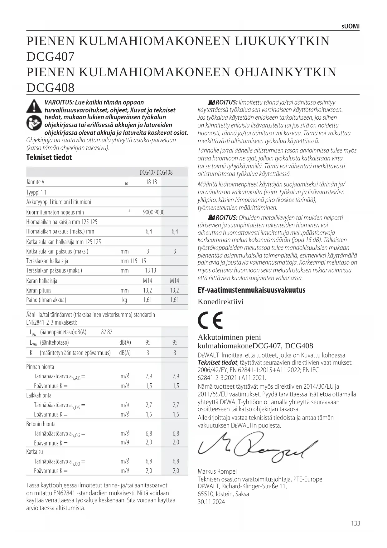 Akkutoiminen pieni kulmahiomakoneDCG407, DCG408 DeWALT ilmoittaa, että tuotteet, jotka on Kuvattu kohdassa Tekniset tiedot, täyttävät seuraavien direktiivien vaatimukset: 2006/42/EY, EN 62841‑1:2015+A11:2022; EN IEC 62841‑2‑3:2021+A11:2021.Nämä tuotteet täyttävät myös direktiivien 2014/30/EU ja 2011/65/EU vaatimukset. Pyydä tarvittaessa lisätietoa ottamalla yhteyttä DeWALT‑yhtiöön ottamalla yhteyttä seuraavaan osoitteeseen tai katso ohjekirjantakaosa.Allekirjoittaja vastaa teknisistä tiedoista ja antaa tämän vakuutuksen DeWALTinpuolesta.Markus Rompel Teknisen osaston varatoimitusjohtaja, PTE‑Europe DeWALT, Richard‑Klinger‑Straße 11, 65510, Idstein, Saksa 30.11.2024 VAROITUS: Ilmoitettu tärinä ja/tai äänitaso esiintyy käytettäessä työkalua sen varsinaiseen käyttötarkoitukseen. Jos työkalua käytetään erilaiseen tarkoitukseen, jos siihen on kiinnitetty erilaisia lisävarusteita tai jos sitä on hoidettu huonosti, tärinä ja/tai äänitaso voi kasvaa. Tämä voi vaikuttaa merkittävästi altistumiseen työkaluakäytettäessä.Tärinälle ja/tai äänelle altistumisen tason arvioinnissa tulee myös ottaa huomioon ne ajat, jolloin työkalusta katkaistaan virta tai se toimii tyhjäkäynnillä. Tämä voi vähentää merkittävästi altistumistasoa työkaluakäytettäessä.Määritä lisätoimenpiteet käyttäjän suojaamiseksi tärinän ja/tai äänitason vaikutuksilta (esim. työkalun ja lisävarusteiden ylläpito, käsien lämpimänä pito (koskee tärinää), työmenetelmienmäärittäminen. VAROITUS: Ohuiden metallilevyjen tai muiden helposti tärisevien ja suuripintaisten rakenteiden hiominen voi aiheuttaa huomattavasti ilmoitettuja melupäästöarvoja korkeamman melun kokonaismäärän (jopa 15dB). Tällaisten työstökappaleiden melutasoa tulee mahdollisuuksien mukaan pienentää asianmukaisilla toimenpiteillä, esimerkiksi käyttämällä painavia ja joustavia vaimennusmattoja. Korkeampi melutaso on myös otettava huomioon sekä melualtistuksen riskiarvioinnissa että riittävien kuulonsuojaintenvalinnassa.Tässä käyttöohjeessa ilmoitetut tärinä‑ ja/tai äänitasoarvot on mitattu EN62841 ‑standardien mukaisesti. Niitä voidaan käyttää verrattaessa työkaluja keskenään. Sitä voidaan käyttää arvioitaessaaltistumista.DCG407 DCG408Jännite V 18 18Tyyppi 1 1Akkutyyppi Litiumioni LitiumioniKuormittamaton nopeus min 9000 9000Hiomalaikan halkaisija mm 125 125Hiomalaikan paksuus (maks.) mm 6,4 6,4 Katkaisulaikan halkaisija mm 125 125Katkaisulaikan paksuus (maks.) mm