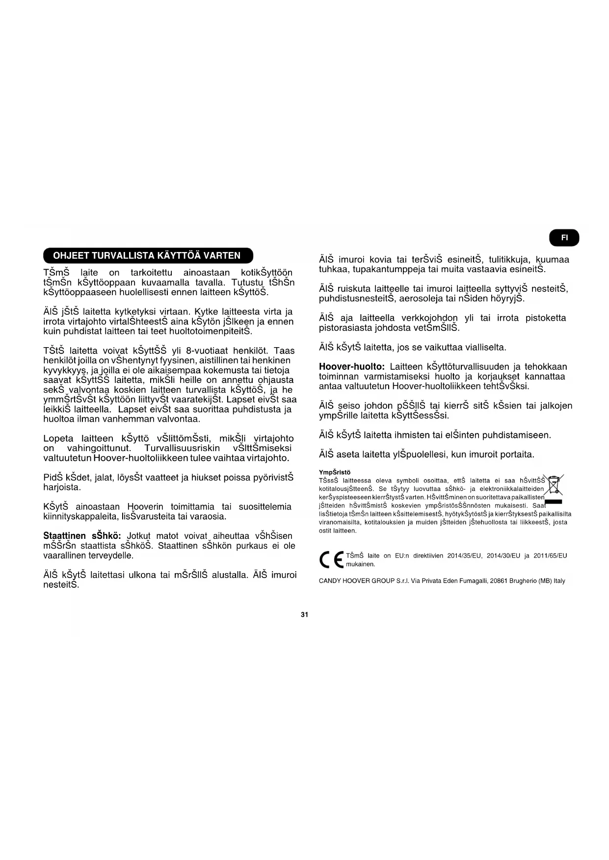 Tämä laite on tarkoitettu ainoastaan kotikäyttöön tämän käyttöoppaan kuvaamalla tavalla. Tutustu tähän käyttöoppaaseen huolellisesti ennen laitteen käyttöä. Älä jätä laitetta kytketyksi virtaan. Kytke laitteesta virta ja irrota virtajohto virtalähteestä aina käytön jälkeen ja ennen kuin puhdistat laitteen tai teet huoltotoimenpiteitä. Tätä laitetta voivat käyttää yli 8-vuotiaat henkilöt. Taas henkilöt joilla on vähentynyt fyysinen, aistillinen tai henkinen kyvykkyys, ja joilla ei ole aikaisempaa kokemusta tai tietoja saavat käyttää laitetta, mikäli heille on annettu ohjausta sekä valvontaa koskien laitteen turvallista käyttöä, ja he ymmärtävät käyttöön liittyvät vaaratekijät. Lapset eivät saa leikkiä laitteella. Lapset eivät saa suorittaa puhdistusta ja huoltoa ilman vanhemman valvontaa. Lopeta laitteen käyttö välittömästi, mikäli virtajohto on vahingoittunut. Turvallisuusriskin välttämiseksi valtuutetun Hoover-huoltoliikkeen tulee vaihtaa virtajohto. Pidä kädet, jalat, löysät vaatteet ja hiukset poissa pyörivistä harjoista. Käytä ainoastaan Hooverin toimittamia tai suosittelemia kiinnityskappaleita, lisävarusteita tai varaosia. Staattinen sähkö: Jotkut matot voivat aiheuttaa vähäisen määrän staattista sähköä. Staattinen sähkön purkaus ei ole vaarallinen terveydelle. Älä käytä laitettasi ulkona tai märällä alustalla. Älä imuroi nesteitä. Älä imuroi kovia tai teräviä esineitä, tulitikkuja, kuumaa tuhkaa, tupakantumppeja tai muita vastaavia esineitä. Älä ruiskuta laitteelle tai imuroi laitteella syttyviä nesteitä, puhdistusnesteitä, aerosoleja tai näiden höyryjä. Älä aja laitteella verkkojohdon yli tai irrota pistoketta pistorasiasta johdosta vetämällä. Älä käytä laitetta, jos se vaikuttaa vialliselta. Hoover-huolto: Laitteen käyttöturvallisuuden ja tehokkaan toiminnan varmistamiseksi huolto ja korjaukset kannattaa antaa valtuutetun Hoover-huoltoliikkeen tehtäväksi. Älä seiso johdon päällä tai kierrä sitä käsien tai jalkojen ympärille laitetta käyttäessäsi. Älä käytä laitetta ihmisten tai eläinten puhdistamiseen. Älä aseta laitetta yläpuolellesi, kun imuroit portaita. Ympäristö Tässä laitteessa oleva symboli osoittaa, että laitetta ei saa hävittää kotitalousjätteenä. Se täytyy luovuttaa sähkö- ja elektroniikkalaitteiden keräyspisteeseen kierrätystä varten. Hävittäminen on suoritettava paikallisten jätteiden hävittämistä koskevien ympäristösäännösten mukaisesti. Saat lisätietoja tämän laitteen käsittelemisestä, hyötykäytöstä ja kierrätyksestä paikallisilta viranomaisilta, kotitalouksien ja muiden jätteiden jätehuollosta tai liikkeestä, josta ostit laitteen. Tämä laite on EU:n direktiivien 2014/35/EU, 2014/30/EU ja 2011/65/EU mukainen. CANDY HOOVER GROUP S.r.l. Via Privata Eden Fumagalli, 20861 Brugherio (MB) Italy FI32 LAITTEESEEN TUTUSTUMINEN A. Letku B. Pölypussilokeron kansi C. Poistoilmasuodattimen kansi D. Imurin runko E. Kantokahva F. Pölypussilokeron vapautussalpa G. Pölypussin täyttöasteen indikaattori. H. Virtapainike