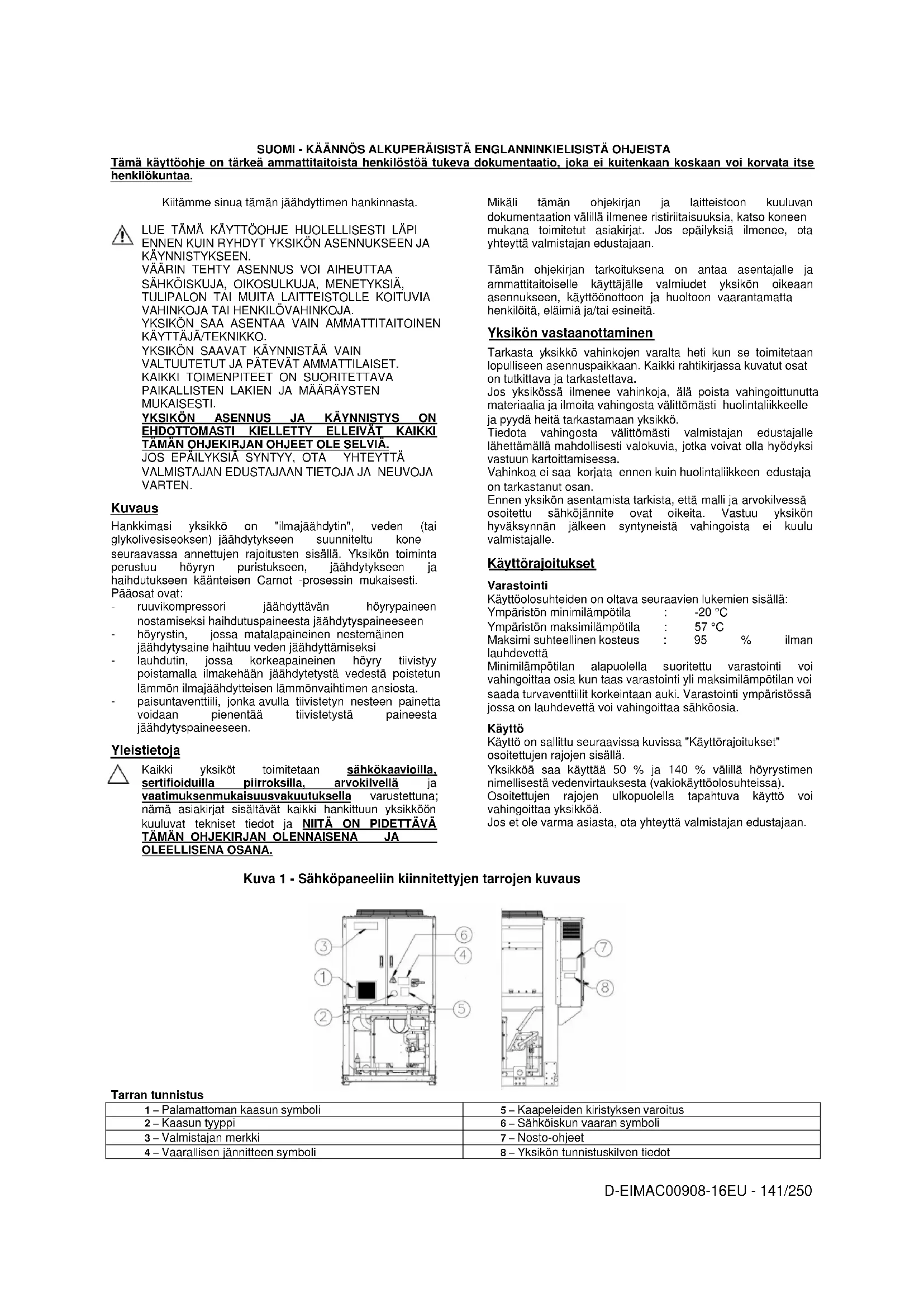Tarran tunnistus 1 – Palamattoman kaasun symboli 5 – Kaapeleiden kiristyksen varoitus 2 – Kaasun tyyppi 6 – Sähköiskun vaaran symboli 3 – Valmistajan merkki 7 – Nosto-ohjeet 4 – Vaarallisen jännitteen symboli 8 – Yksikön tunnistuskilven tiedotD-EIMAC00908-16EU - 142/250