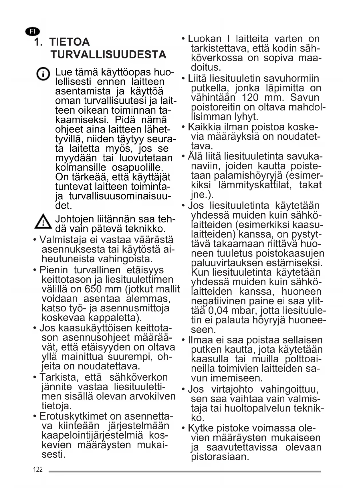 - Tilassa täytyy olla asianmu- kainen tuuletus kun liesituule- tinta käytetään samanaikai- sesti kaasulla tai muilla poltto- aineilla toimivien laitteiden kanssa (ei koske laitteita, jot- ka poistavat tilaan vain il- maa).