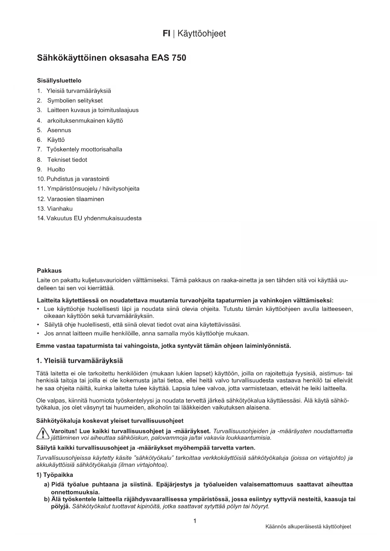 Sähkökäyttöinen oksasaha EAS 750 Sisällysluettelo