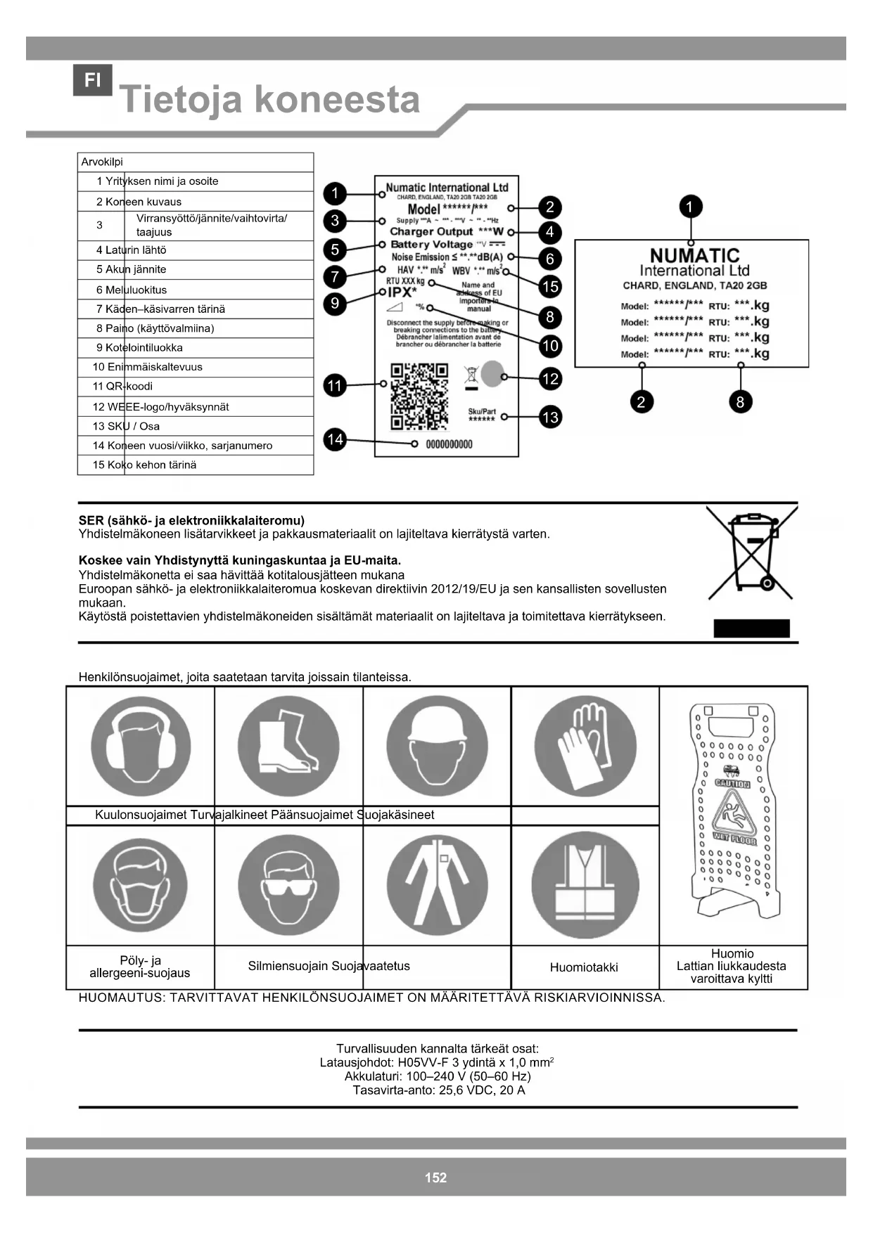 Akkulaturi: 100–240 V (50–60 Hz) Tasavirta-anto: 25,6 VDC, 20 A Kuulonsuojaimet Turvajalkineet Päänsuojaimet Suojakäsineet Pöly- ja allergeeni-suojaus Silmiensuojain Suojavaatetus Huomiotakki Huomio Lattian liukkaudesta varoittava kyltti Henkilönsuojaimet, joita saatetaan tarvita joissain tilanteissa. HUOMAUTUS: TARVITTAVAT HENKILÖNSUOJAIMET ON MÄÄRITETTÄVÄ RISKIARVIOINNISSA. Arvokilpi1 Yrityksen nimi ja osoite2 Koneen kuvaus Virransyöttö/jännite/vaihtovirta/taajuus4 Laturin lähtö5 Akun jännite6 Meluluokitus7 Käden–käsivarren tärinä8 Paino (käyttövalmiina)9 Kotelointiluokka10 Enimmäiskaltevuus11 QR-koodi12 WEEE-logo/hyväksynnät13 SKU / Osa14 Koneen vuosi/viikko, sarjanumero15 Koko kehon tärinä