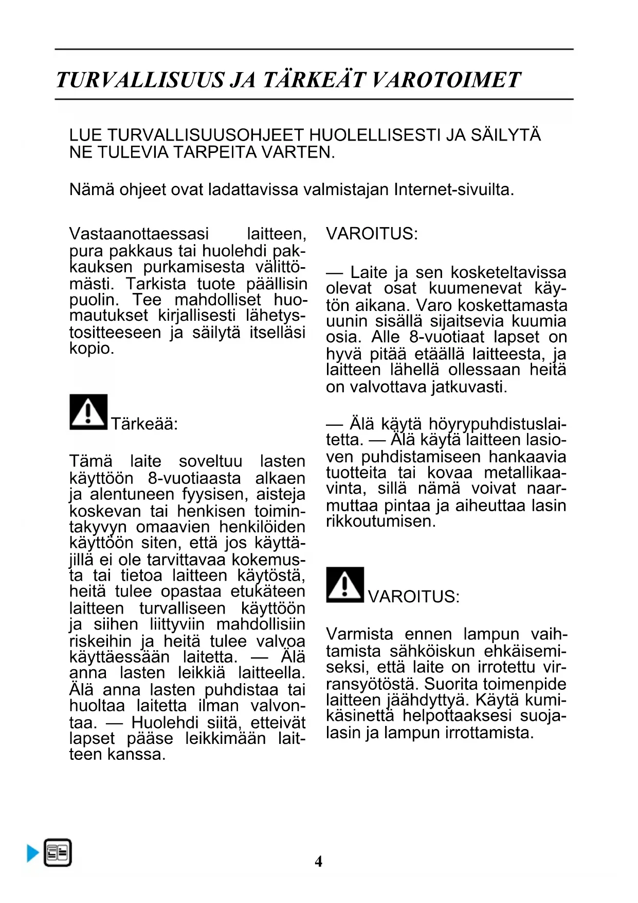 Tämä laite soveltuu lasten käyttoön 8-vuotiaasta alkaen ja alentuneen fyysisen, aisteja koskevan tai henkisen toimintakyvyn omaavien henkilöiden käyttoön siten, etta jos käyttajillä ei ole tarvittavaa kokemusta tai tietao laitteen käytostä, heita tulee opastaa etukäteen laitteen turvalliseen käyttoön ja siihen liittyviin mahdollisiin riskeihin ja heita tulee valvoa käyttaessän laitetta. — Alä annalasten leikkiä laitteella. Alä annalasten puhdistaa tai huoltaa laitetta ilman valvontaa. — Huolehdi siitä, etteivat lapset paase leikkimaan laitteen kanssa.