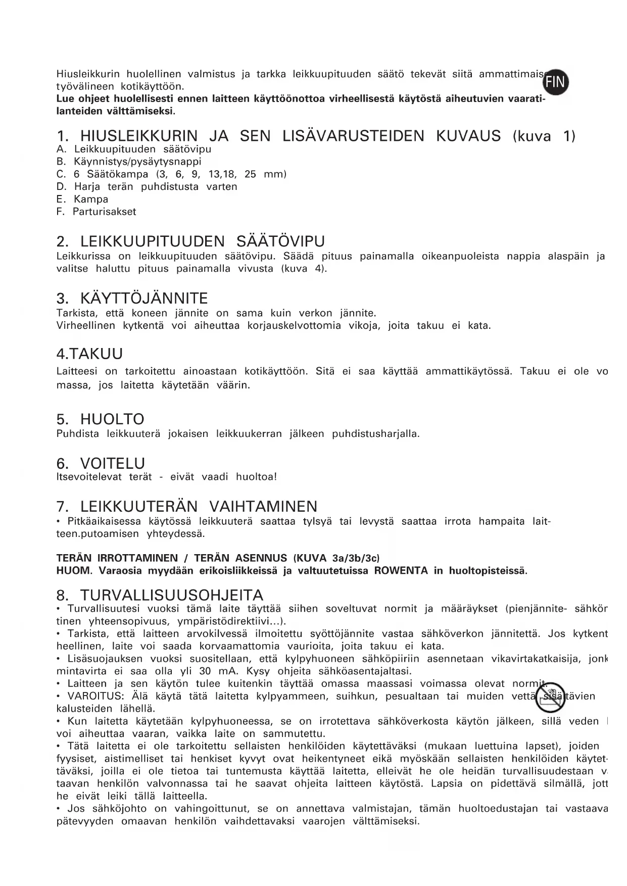 - Pitkäaikaisessa käytössä leikkuuterä saattaa tylsyä tai levystä saattaa irrota hampaita lait- teen.putoamisen yhteydessä. TERÄN IRROTTAMINEN / TERÄN ASENNUS (KUVA 3a/3b/3c) HUOM. Varaosia myydään erikoisliikkeissä ja valtuutetuissa ROWENTA in huoltopisteissä.