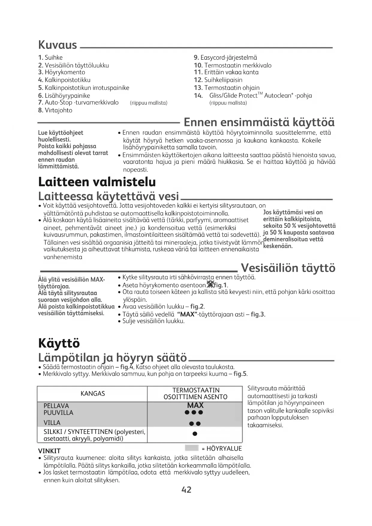 - Säädä lämpötila valitun kankaan mukaan.• Aseta höyrykomento asentoon – fig.1.• Voit aloittaa silityksen kun merkkivalo sammuu. Lisätoiminnot Gliss/Glide Protect
