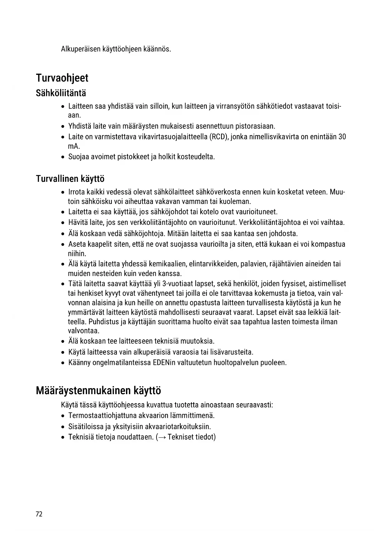 - Käänny ongelmatilanteissa EDENin valtuutetun huoltopalvelun puoleen. Määräystenmukainen käyttö Käytä tässä käyttöohjeessa kuvattua tuotetta ainoastaan seuraavasti: