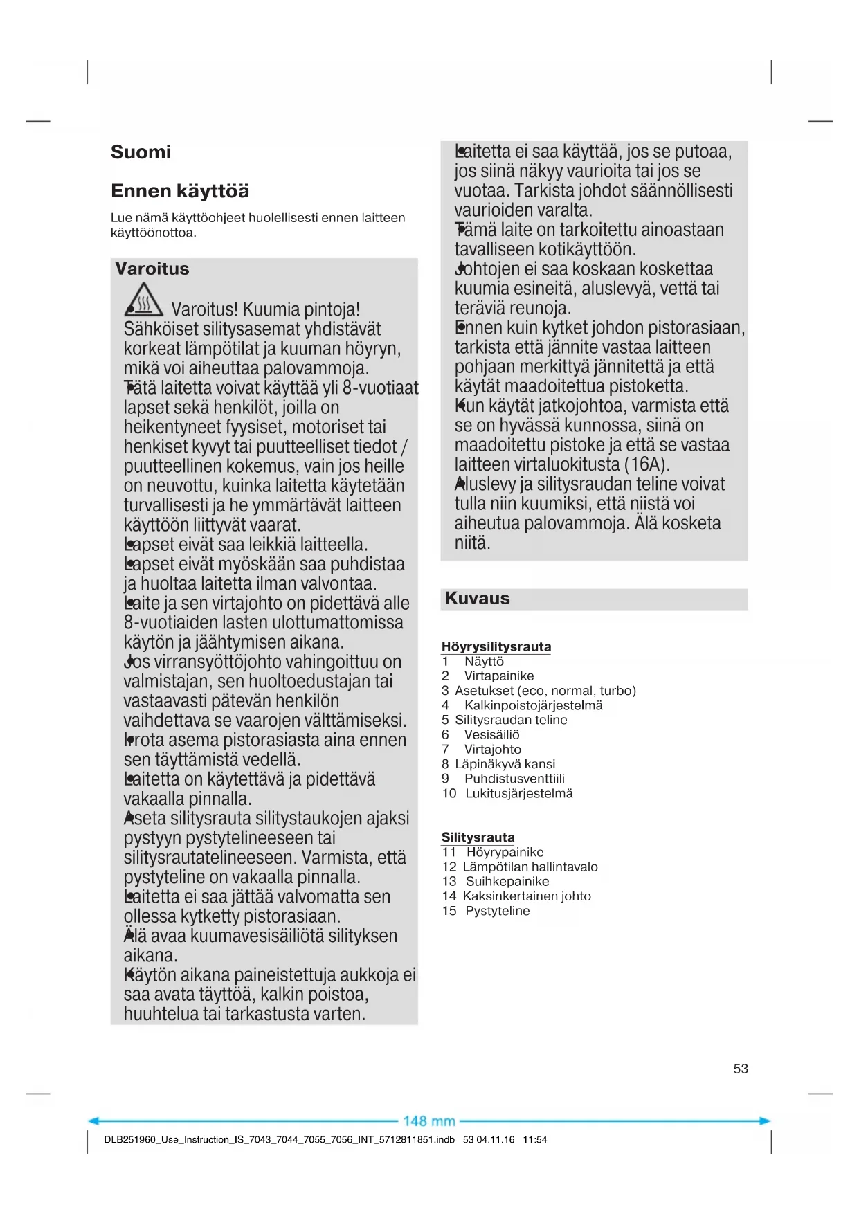 DLB251960_Use_Instruction_IS_7043_7044_7055_7056_INT_5712811851.indb 52 04.11.16 11:54Suomi Ennen käyttöä Lue nämä käyttöohjeet huolellisesti ennen laitteen käyttöönottoa. Varoitus