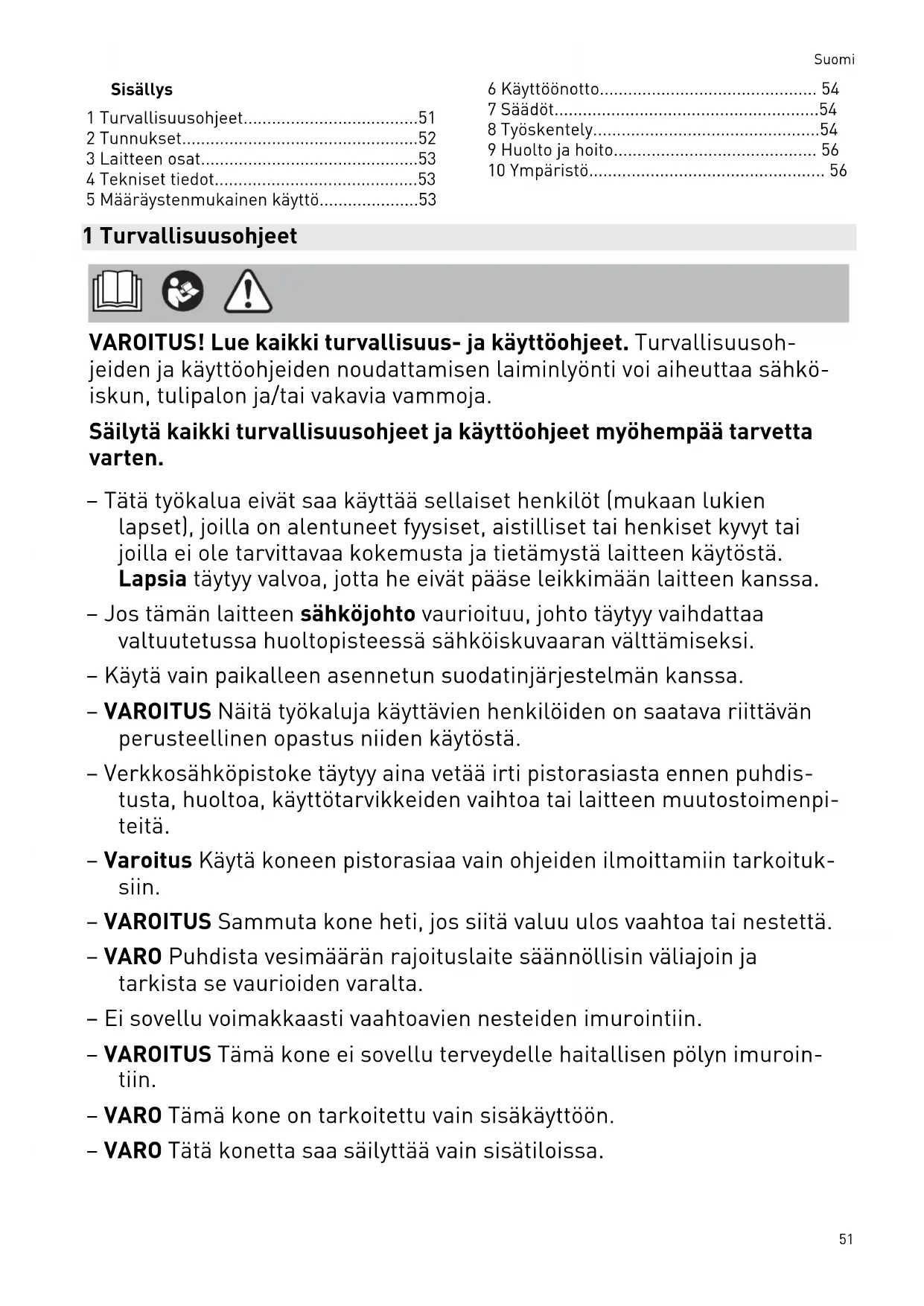 - 10 Ympäristö 1 Turvallisuusohjeet VAROITUS! Lue kaikki turvallisuus- ja käyttöohjeet. Turvallisuusoh jeiden ja käyttöohjeiden noudattamisen laiminlyönti voi aiheuttaa sähkö iskun, tulipalon ja/tai vakavia vammoja. Säilytä kaikki turvallisuusohjeet ja käyttöohjeet myöhempää tarvetta varten. – Tätä työkalua eivät saa käyttää sellaiset henkilöt (mukaan lukien lapset), joilla on alentuneet fyysiset, aistilliset tai henkiset kyvyt tai joilla ei ole tarvittavaa kokemusta ja tietämystä laitteen käytöstä. Lapsia täytyy valvoa, jotta he eivät pääse leikkimään laitteen kanssa. – Jos tämän laitteen sähköjohto vaurioituu, johto täytyy vaihdattaa valtuutetussa huoltopisteessä sähköiskuvaaran välttämiseksi. – Käytä vain paikalleen asennetun suodatinjärjestelmän kanssa. – VAROITUS Näitä työkaluja käyttävien henkilöiden on saatava riittävän perusteellinen opastus niiden käytöstä. – Verkkosähköpistoke täytyy aina vetää irti pistorasiasta ennen puhdis tusta, huoltoa, käyttötarvikkeiden vaihtoa tai laitteen muutostoimenpi teitä. – Varoitus Käytä koneen pistorasiaa vain ohjeiden ilmoittamiin tarkoituk siin. – VAROITUS Sammuta kone heti, jos siitä valuu ulos vaahtoa tai nestettä. – VARO Puhdista vesimäärän rajoituslaite säännöllisin väliajoin ja tarkista se vaurioiden varalta. – Ei sovellu voimakkaasti vaahtoavien nesteiden imurointiin. – VAROITUS Tämä kone ei sovellu terveydelle haitallisen pölyn imuroin tiin. – VARO Tämä kone on tarkoitettu vain sisäkäyttöön. – VARO Tätä konetta saa säilyttää vain sisätiloissa. Suomi 51– Räjähdys- ja palovaara! Älä imuroi: – kipinöitä, hehkuvia siruja tai kuumaa pölyä; – palonarkoja tai räjähdysalttiita aineita (esim. magnesium, alumiini, bensiini, ohenne); – syövyttäviä aineita (esim. hapot, emäsliuokset, liuottimet); – kemiallisesti reaktiivisia aineita, jotka aiheuttavat lämpöä, happoja/ emäksiä, kaasuja yms. (esim. reaktiiviset 2K-materiaalit, alumiini ja vesi). – Noudata kansallisia turvallisuusmääräyksiä sekä materiaalin valmis tajan antamia ohjeita! – Käytä vain sopivan suojavarustuksen kanssa! – Työskentele vain kunnossa olevan laitteen kanssa (tarkasta silmämää räisesti), kuivassa ympäristössä ja ohjeiden mukaan! – Vaaran välttämiseksi tarkasta pistoke, pistorasia, johto ja suodatin säännöllisin väliajoin. Vaihdata vialliset sähkökomponentit vain valtuu tetussa huoltokorjaamossa. – Kanna laitetta vain sen asianmukaisen kahvan varassa. – Älä nosta äläkä kuljeta nosturikoukun tai nostolaitteen varassa. – Järjestelmäimuria ei saa kantaa imuletkun kiinnittimen [1-3] varassa! – Aseta laite vain tasaiselle alustalle ja varmista, ettei se pääse vieri mään pois paikaltaan. – Tätä laitetta eivät saa käyttää sellaiset henkilöt, jotka saattavat reagoida herkästi sähköiskuun (esim. ihmiset, joilla on sydämentah distin)), koska laitteeseen voi varautua staattista sähköä. – Käytä vain alkuperäistä Festool-imuletkua. – Huomioi työskentelyalueen olosuhteet ja varmista oma ja sivullisten turvallisuus laitteen kujetuksen ja käytön aikana. Tällä tavalla estät esim. imuletkun tai verkkovirtavirtajohdon aiheut tamat kompastumiset. – Pidä pakkauskalvot poissa lasten ulottuvilta. Tukehtumisvaara. 2 Tunnukset Varoitus yleisestä vaarasta Sähköiskuvaara Lue käyttöohjeet ja turvallisuusohjeet! Älä hävitä kotitalousjätteiden mukana. Vedä verkkopistoke irti Käytä hengityssuojainta. Suomi 52Laitteen päälle kiipeäminen on kielletty Ohje, vihje CE-vaatimustenmukaisuusmerkintä Käsittelyohje 3 Laitteen osat [1-1] Laitepistorasia [1-2] Johto- ja tarvikekotelo [1-3] Imuletkun kiinnitin [1-4] Kahva [1-5] Lukitsin [1-6] Suodatinpanos [1-7] Kiinnityssalpa [1-8] Puhallusaukko [1-9] Likasäiliö [1-10] Käynnistys-/sammutuskytkin [1-11] MAN-painike [1-12] Imutehon säätö Mainitut kuvat ovat käyttöoppaan alussa. 4 Tekniset tiedot Järjestelmäimurit CT15 CT25 Tehontarve 350 - 1200W Liitäntäarvo laitepistorasiaan maks. EU CH, DK p. 56