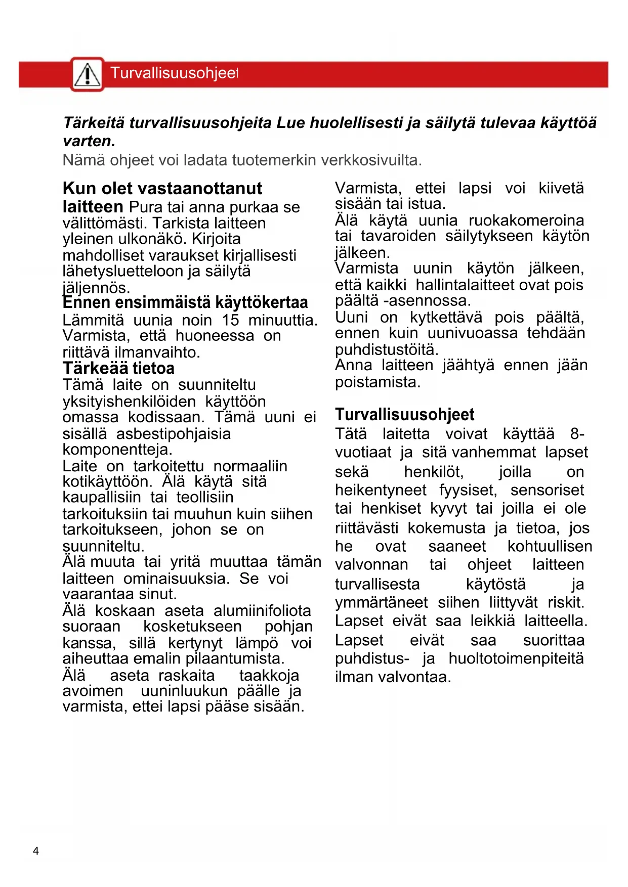 Laite ja sen käytettävissä olevat osat kuumenevat käytön aikana. Varo koskemasta uunin sisällä oleviin lämmityselementteihin. Alle 8-vuotiaat lapset on pidettävä poissa, ellei heitä valvota koko ajan.