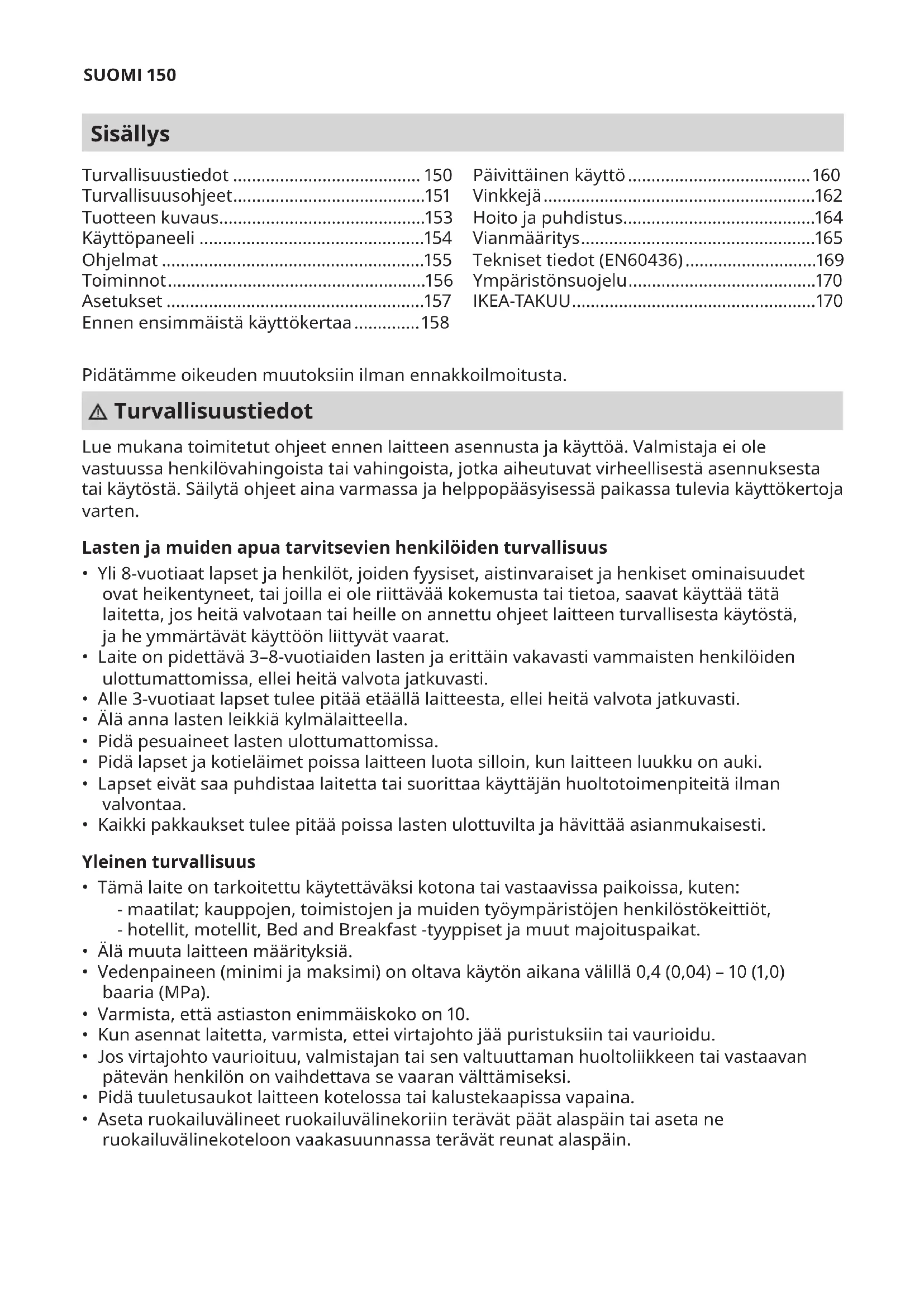 - asennusohjeiden ja käyttöoppaan turvallisuusohjeiden mukaisesti.SUOMI 172 IKEA-laitteiden myynninjälkeinen palvelu: Pyydämme ottamaan yhteyttä IKEA:n myynninjälkeiseen palveluun, jos: haluat tehdä tämän takuun piiriin kuuluvan huoltopyynnön; haluat pyytää selventäviä tietoja IKEA-keittiökalusteisiin tarkoitetun IKEA-laitteen asennukseen liittyen. Huolto ei anna seuraaviin liittyviä selventäviä tietoja: IKEA-keittiön yleinen asennus; sähköliitännät (mikäli laitteen mukana toimitetaan pistoke ja virtajohto), vesi- ja kaasuliitännät, sillä nämä on annettava valtuutetun huoltoteknikon tehtäväksi. pyytää selventäviä tietoja IKEA-laitteen käyttöoppaiden sisällöstä ja teknisistä tiedoista. Varmistaaksesi, että voimme palvella sinua parhaalla mahdollisella tavalla, lue huolellisesti tämän oppaan sisältämät asennusohjeet ja/tai käyttöohjeet, ennen kuin otat yhteyttä meihin. Varaosien saatavuus Seuraavat varaosat ovat saatavilla 7vuoden ajan mallin tuotannon lopettamisesta: moottori; kierto- ja tyhjennyspumppu; lämmittimet ja lämmitysvastukset, mukaan lukien lämpöpumput (erikseen tai pakettina); putket ja vastaavat laitteistot, mukaan lukien kaikki letkut, venttiilit, suodattimet ja aquastop-järjestelmät; ovikokoonpanojen rakenteelliset osat ja sisäosat (erikseen tai pakettina); piirilevyt, elektroniset näytöt; painekytkimet; termostaatit ja anturit; ohjelmistot ja laiteohjelmistot, mukaan lukien nollausohjelmisto. Seuraavat varaosat ovat saatavilla 10 vuoden ajan mallin tuotannon lopettamisesta: luukkujen saranat ja tiivisteet, muut tiivisteet, suihkuvarret, tyhjennysaukon suodattimet, sisällä olevat telineet ja muoviset lisäosat kuten korit ja kannet. Tilaat varaosat ottamalla yhteyttä IKEA:n myynninjälkeiseen palveluun. Yhteydenototpalveluatarvittaessa Tämän oppaan viimeisellä sivulla on täydellinen luettelo IKEA:n nimeämistä yhteyshenkilöistä sekä heidän puhelinnumeronsa. Jotta voimme palvella sinua mahdollisimman nopeasti, pyydämme soittamaan tämän oppaan lopussa mainittuihin puhelinnumeroihin. Ilmoita aina tässä oppaassa mainittu kyseessä olevan laitteen numero. Ennenkuin soitat meille, ota esille kyseessä olevan laitteen IKEAN tuotenumero (8-numeroinen koodi) ja laitteen sarjanumero (8-numeroinen koodi, jokalöytyy arvokilvestä). PIDÄ OSTOKUITTI TALLESSA! Se on todiste ostosta ja se vaaditaan takuuta varten. Huomaa, että kuitissa on mainittu myös IKEA-tuotteen nimi ja numero (8-numeroinen koodi) jokaisesta ostamastasi laitteesta. Tarvitsetko lisäapua? Jos sinulla on muita kuin kodinkoneiden myynninjälkeiseen palveluun liittyviä kysymyksiä, ota yhteys lähimmän IKEA-myymälän asiakaspalveluun. Ennen yhteydenottoa tutustu huolellisesti laitteen mukana tuleviin ohjekirjoihin.SVENSKA 173 Innehåll Kan ändras utan föregående meddelande. Säkerhetsinformation Läs denna bruksanvisning noggrant före installation och användning av produkten. Tillverkaren ansvarar inte för personskador eller skador som orsakats av felaktig montering eller användning. Förvara alltid anvisningen på en säker och tillgänglig plats för framtida referens. Säkerhet för barn och personer med nedsatt förmåga