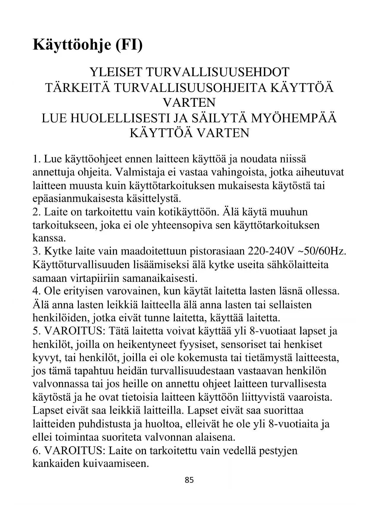 henkilöt, joilla on heikentyneet fyysiset, sensoriset tai henkiset kyvyt, tai henkilöt, joilla ei ole kokemusta tai tietämystä laitteesta, jos tämä tapahtuu heidän turvallisuudestaan vastaavan henkilön valvonnassa tai jos heille on annettu ohjeet laitteen turvallisesta käytöstä ja he ovat tietoisia laitteen käyttöön liittyvistä vaaroista. Lapset eivät saa leikkiä laitteilla. Lapset eivät saa suorittaa laitteiden puhdistusta ja huoltoa, elleivät he ole yli 8-vuotiaita ja ellei toimintaa suoriteta valvonnan alaisena.