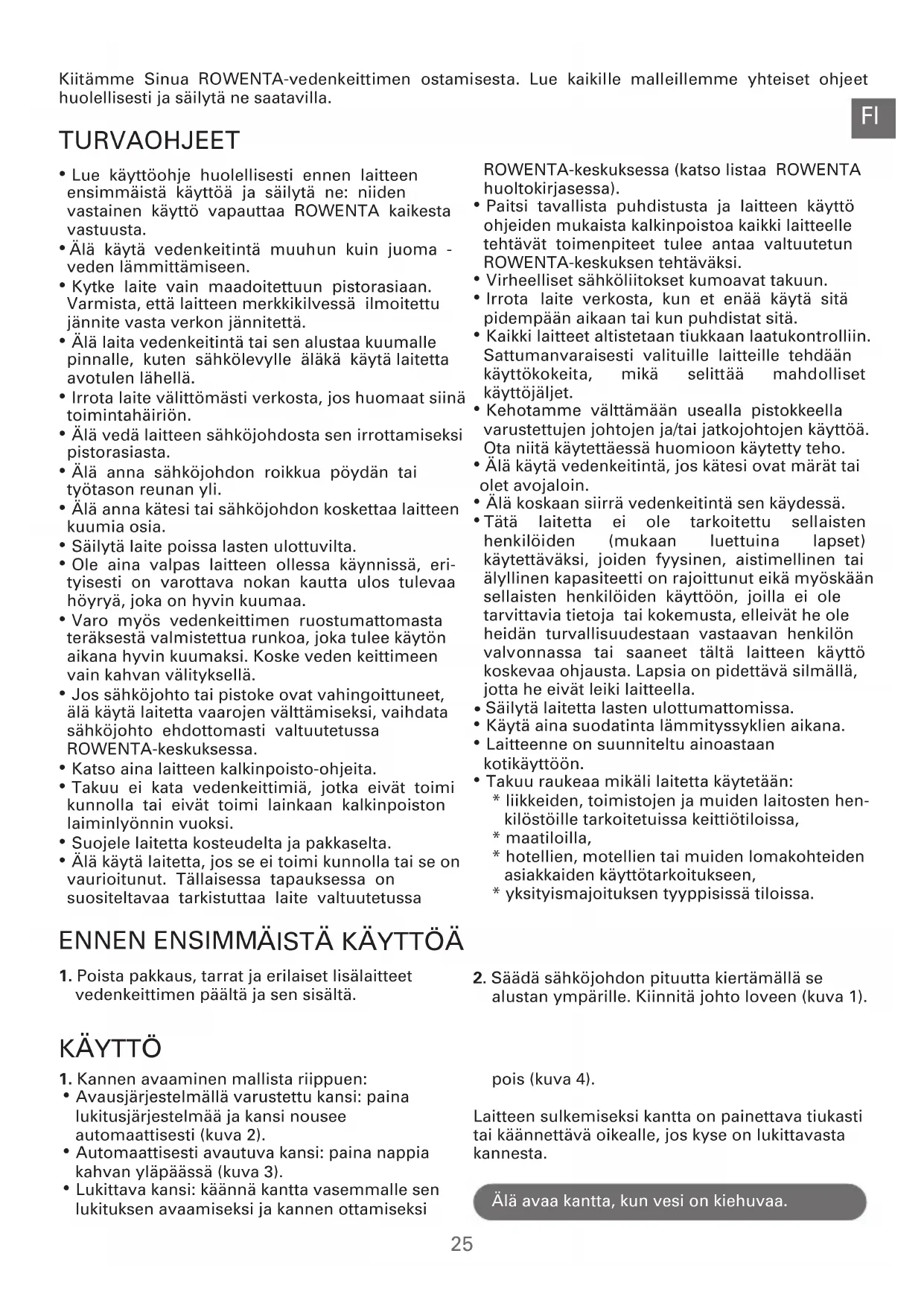 Huolehtikaamme ympäristöstä! i Laitteesi on varustettu monilla arvokkailla ja kierrätettävillä materiaaleilla. Toimita laitteesi keräyspisteeseen tai sellaisen puuttuessa vaikka valtuutettuun huoltokeskukseen, jotta laitteen osat varmasti kierrätetään. Onnettomuuksien välttämiseksi lapsia ei koskaan saa kantaa, kun juot tai kuljetat kuumia juomia.29 Merci d’avoir acheté une bouilloire ROWENTA. Lire attentivement les instructions communes à tous nos modèles et les garder à portée de main.