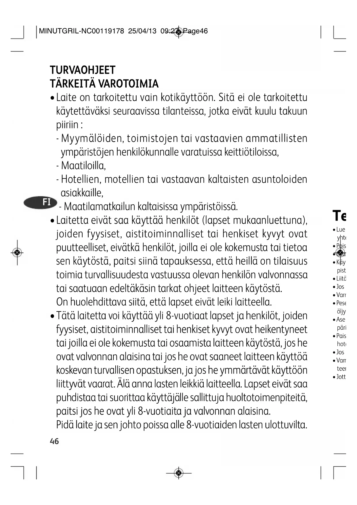 MINUTGRIL-NC00119178 25/04/13 09:27 Page46• Laitteen pinnat voivat olla hyvin kuumat, kun laite on käytössä. Laitteen kuumiin osiin ei saa koskea.