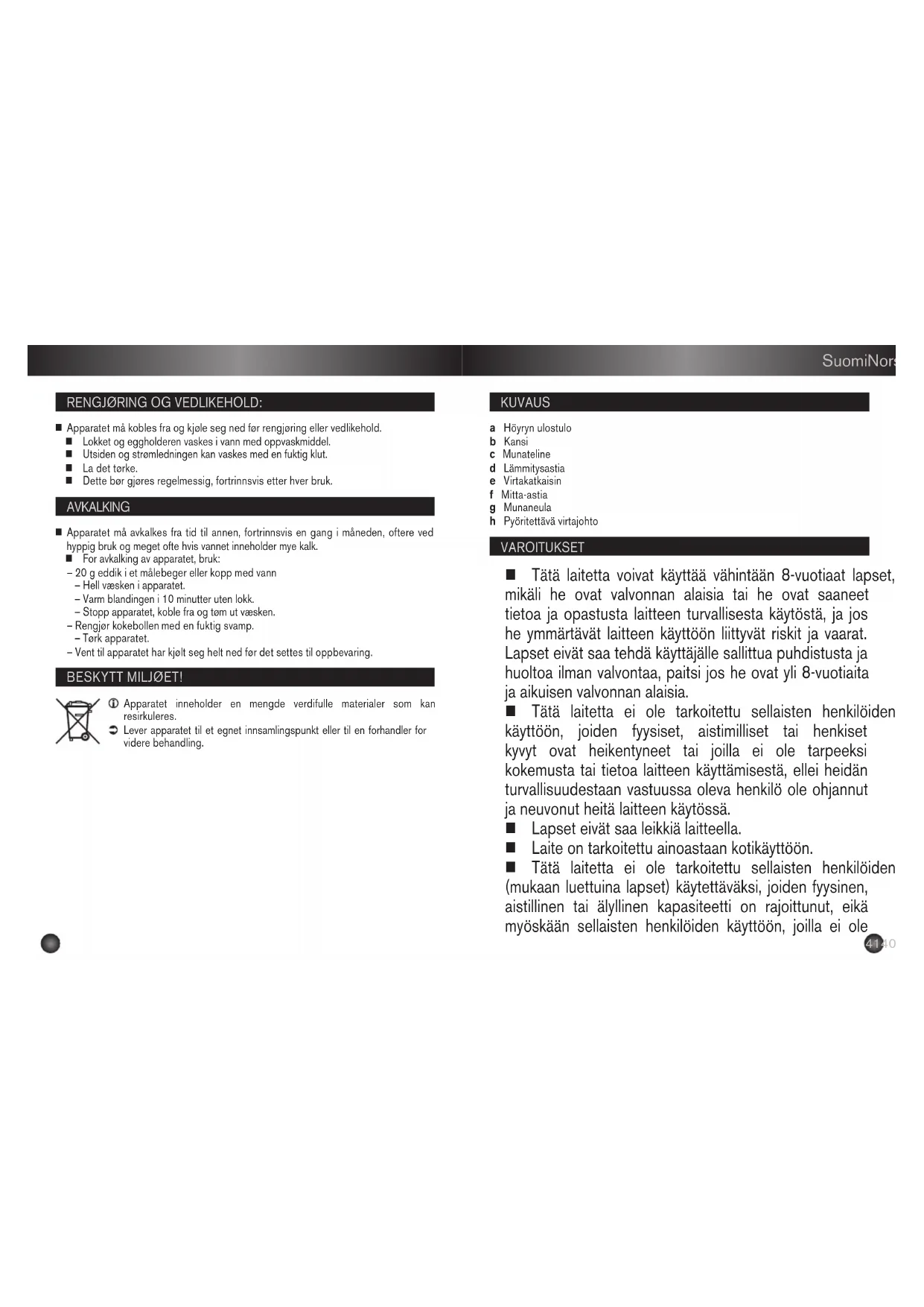Apparatet må ikke brukes når det er tomt. For å unngå overoppheting av apparatet, må det ikke plasseres i et hjørne eller mot en vegg. Apparatet må aldri plasseres direkte på en skjør overflate (glassbord, duk, lakkert tre etc.) eller på en plastduk. Kjøkkenredskaper må aldri legges på stekeflatene i apparatet. Apparatet skal aldri nedsenkes i vann. Unngå væting av apparatet, kontrollen og ledningen Hendene må aldri holdes over dette hullet under koking. SLUTTEN AV KOKINGEN: Når vannet har fordampet, vil et lydsignal høres. Dette angir slutten av koketiden. Sett bryteren i posisjon O. (9) Apparatet stopper. Eggene er klare. Ta lokket av med en grytevott, apparatet er fremdeles varmt og damp slipper ut når lokket åpnes. (10) Ta eggeholderen i håndtaket (med en grytevott om nødvendig). (11) Ta eggeholderen ut av apparatet og hold den under kaldt, rennende vann for å kjøle ned eggene. (12)4140 SuomiNorsk RENGJØRING OG VEDLIKEHOLD: Apparatet må kobles fra og kjøle seg ned før rengjøring eller vedlikehold. Lokket og eggholderen vaskes i vann med oppvaskmiddel. Utsiden og strømledningen kan vaskes med en fuktig klut. La det tørke. Dette bør gjøres regelmessig, fortrinnsvis etter hver bruk. AVKALKING BESKYTT MILJØET! Apparatet må avkalkes fra tid til annen, fortrinnsvis en gang i måneden, oftere ved hyppig bruk og meget ofte hvis vannet inneholder mye kalk. For avkalking av apparatet, bruk: – 20 g eddik i et målebeger eller kopp med vann – Hell væsken i apparatet. – Varm blandingen i 10 minutter uten lokk. – Stopp apparatet, koble fra og tøm ut væsken. – Rengjør kokebollen med en fuktig svamp. – Tørk apparatet. – Vent til apparatet har kjølt seg helt ned før det settes til oppbevaring. Apparatet inneholder en mengde verdifulle materialer som kan resirkuleres. Lever apparatet til et egnet innsamlingspunkt eller til en forhandler for videre behandling. KUVAUS VAROITUKSET a Höyryn ulostulo b Kansi c Munateline d Lämmitysastia e Virtakatkaisin f Mitta-astia g Munaneula h Pyöritettävä virtajohto Tätä laitetta voivat käyttää vähintään 8-vuotiaat lapset, mikäli he ovat valvonnan alaisia tai he ovat saaneet tietoa ja opastusta laitteen turvallisesta käytöstä, ja jos he ymmärtävät laitteen käyttöön liittyvät riskit ja vaarat. Lapset eivät saa tehdä käyttäjälle sallittua puhdistusta ja huoltoa ilman valvontaa, paitsi jos he ovat yli 8-vuotiaita ja aikuisen valvonnan alaisia. Tätä laitetta ei ole tarkoitettu sellaisten henkilöiden käyttöön, joiden fyysiset, aistimilliset tai henkiset kyvyt ovat heikentyneet tai joilla ei ole tarpeeksi kokemusta tai tietoa laitteen käyttämisestä, ellei heidän turvallisuudestaan vastuussa oleva henkilö ole ohjannut ja neuvonut heitä laitteen käytössä. Lapset eivät saa leikkiä laitteella. Laite on tarkoitettu ainoastaan kotikäyttöön. Tätä laitetta ei ole tarkoitettu sellaisten henkilöiden (mukaan luettuina lapset) käytettäväksi, joiden fyysinen, aistillinen tai älyllinen kapasiteetti on rajoittunut, eikä myöskään sellaisten henkilöiden käyttöön, joilla ei ole4342 Suomi Suomi tarvittavia tietoja tai kokemusta, elleivät he ole saaneet heidän turvallisuudestaan vastaavan henkilön käyttöä koskevaa ohjausta. Lapsia on pidettävä silmällä, jotta he eivät leiki laitteella. Laitetta ei ole tarkoitettu käytettäväksi seuraavissa tapauksissa, joita takuu ei kata: – henkilökunnan käyttöön tarkoitetut keittiötilat liikkeissä, toimistoissa ja muissa ammatillisissa ympäristöissä, – maatiloilla, – hotellien, motellien tai muiden majoitustyyppien asiakkaiden käytössä, – Bed & Breakfast -tyyppisissä majoituskohteissa. Virtajohtoa ei voi vaihtaa. Jos johto on viallinen, laite olisi syytä hävittää. Varo vahingoittamasta kantta. Varoitus: lämpenevän osan pinta on lämmin vielä käytön jälkeenkin. Varoitus: laitteen väärinkäyttö voi johtaa loukkaantumisiin. Puhdista elintarvikkeiden kanssa kosketuksissa olevat lisävarusteet ja osat astianpesuaineella sekä kostealla liinalla tai sienellä. Huuhtele kostean liinan tai sienen avulla ja kuivaa ne lopuksi kuivalla liinalla. Laitetta voidaan käyttää korkeuteen asti, joka on 4000 m. Turvallisuutesi vuoksi tämä laite on voimassa olevien normien ja säädösten mukainen (alijännitedirektiivi, elektromagneettinen yhteensopivuus, ruokien kanssa kosketuksissa olevat materiaalit, ympäristödirektiivi...) Lue käyttöohjeet huolellisesti ja säilytä niitä käden ulottuvilla, kuten myös kaikkia eri käyttöohjeen versioita sekä laitteen mukana toimitettujen lisätarvikkeiden käyttöohjeita. Älä koskaan käytä laitetta valvomatta. Älä koskaan kytke päälle laitetta kun et käytä sitä.