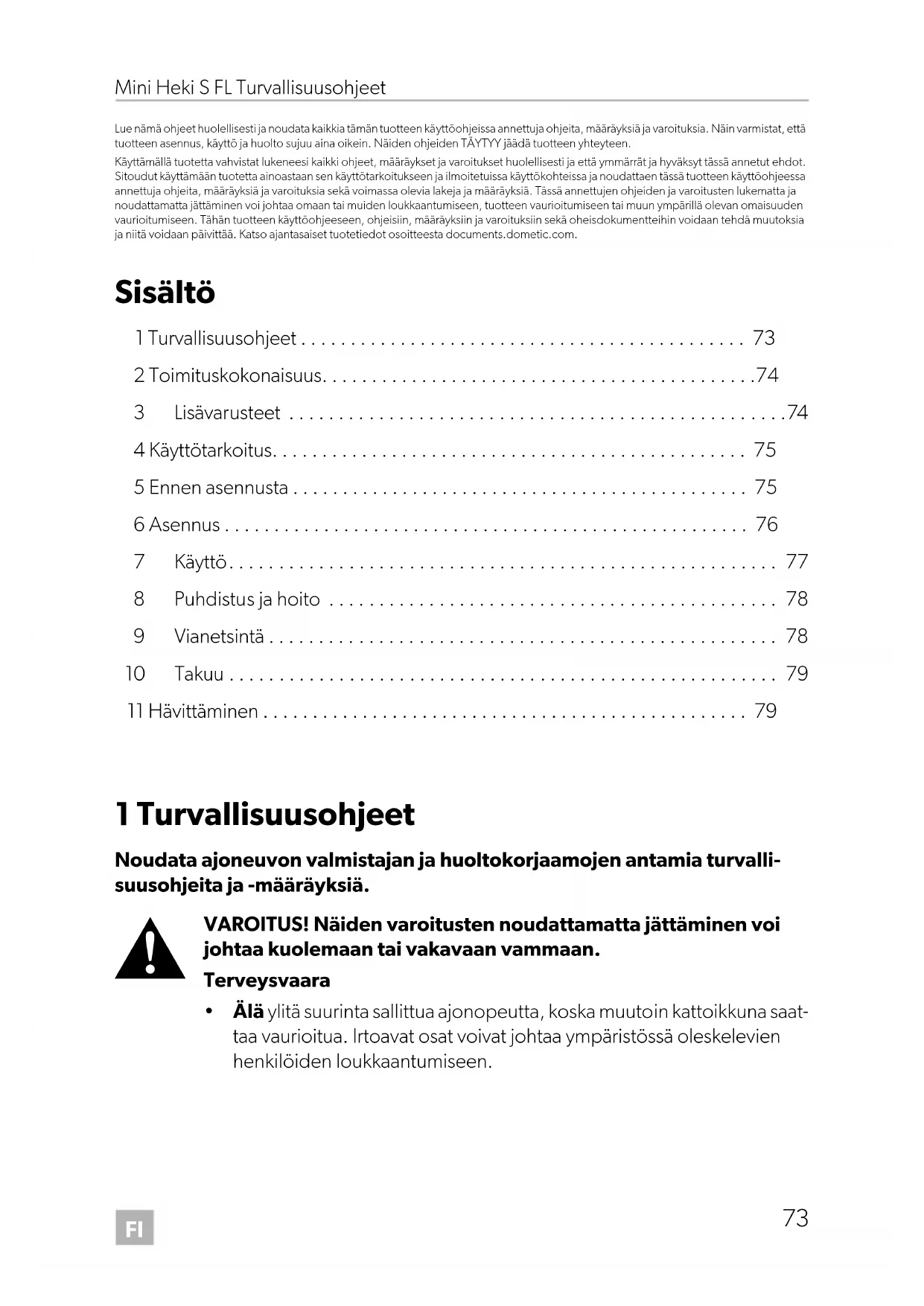 - Lue nämä ohjeet huolellisesti ja noudata kaikkia tämän tuotteen käyttöohjeissa annettuja ohjeita, määräyksiä ja varoituksia. Näin varmistat, että tuotteen asennus, käyttö ja huolto sujuu aina oikein. Näiden ohjeiden TÄYTYY jäädä tuotteen yhteyteen. Käyttämällä tuotetta vahvistat lukeneesi kaikki ohjeet, määräykset ja varoitukset huolellisesti ja että ymmärrät ja hyväksyt tässä annetut ehdot. Sitoudut käyttämään tuotetta ainoastaan sen käyttötarkoitukseen ja ilmoitetuissa käyttökohteissa ja noudattaen tässä tuotteen käyttöohjeessa annettuja ohjeita, määräyksiä ja varoituksia sekä voimassa olevia lakeja ja määräyksiä. Tässä annettujen ohjeiden ja varoitusten lukematta ja noudattamatta jättäminen voi johtaa omaan tai muiden loukkaantumiseen, tuotteen vaurioitumiseen tai muun ympärillä olevan omaisuuden vaurioitumiseen. Tähän tuotteen käyttöohjeeseen, ohjeisiin, määräyksiin ja varoituksiin sekä oheisdokumentteihin voidaan tehdä muutoksia ja niitä voidaan päivittää. Katso ajantasaiset tuotetiedot osoitteesta documents.dometic.com. Sisältö 1 Turvallisuusohjeet p. 73