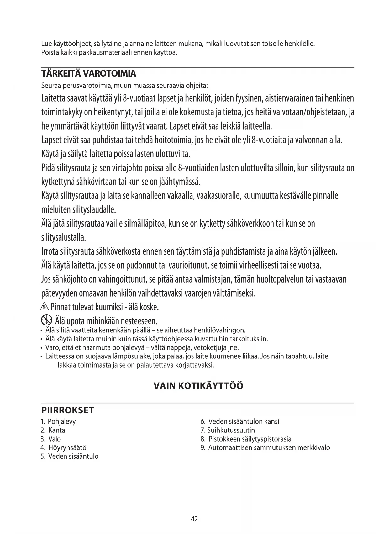 Seuraa perusvarotoimia, muun muassa seuraavia ohjeita: Laitetta saavat käyttää yli 8-vuotiaat lapset ja henkilöt, joiden fyysinen, aistienvarainen tai henkinen toimintakyky on heikentynyt, tai joilla ei ole kokemusta ja tietoa, jos heitä valvotaan/ohjeistetaan, ja he ymmärtävät käyttöön liittyvät vaarat. Lapset eivät saa leikkiä laitteella. Lapset eivät saa puhdistaa tai tehdä hoitotoimia, jos he eivät ole yli 8-vuotiaita ja valvonnan alla. Käytä ja säilytä laitetta poissa lasten ulottuvilta. Pidä silitysrauta ja sen virtajohto poissa alle 8-vuotiaiden lasten ulottuvilta silloin, kun silitysrauta on kytkettynä sähkövirtaan tai kun se on jäähtymässä. Käytä silitysrautaa ja laita se kannalleen vakaalla, vaakasuoralle, kuumuutta kestävälle pinnalle mieluiten silityslaudalle. Älä jätä silitysrautaa vaille silmälläpitoa, kun se on kytketty sähköverkkoon tai kun se on silitysalustalla. Irrota silitysrauta sähköverkosta ennen sen täyttämistä ja puhdistamista ja aina käytön jälkeen. Älä käytä laitetta, jos se on pudonnut tai vaurioitunut, se toimii virheellisesti tai se vuotaa. Jos sähköjohto on vahingoittunut, se pitää antaa valmistajan, tämän huoltopalvelun tai vastaavan pätevyyden omaavan henkilön vaihdettavaksi vaarojen välttämiseksi. h Pinnat tulevat kuumiksi - älä koske.
