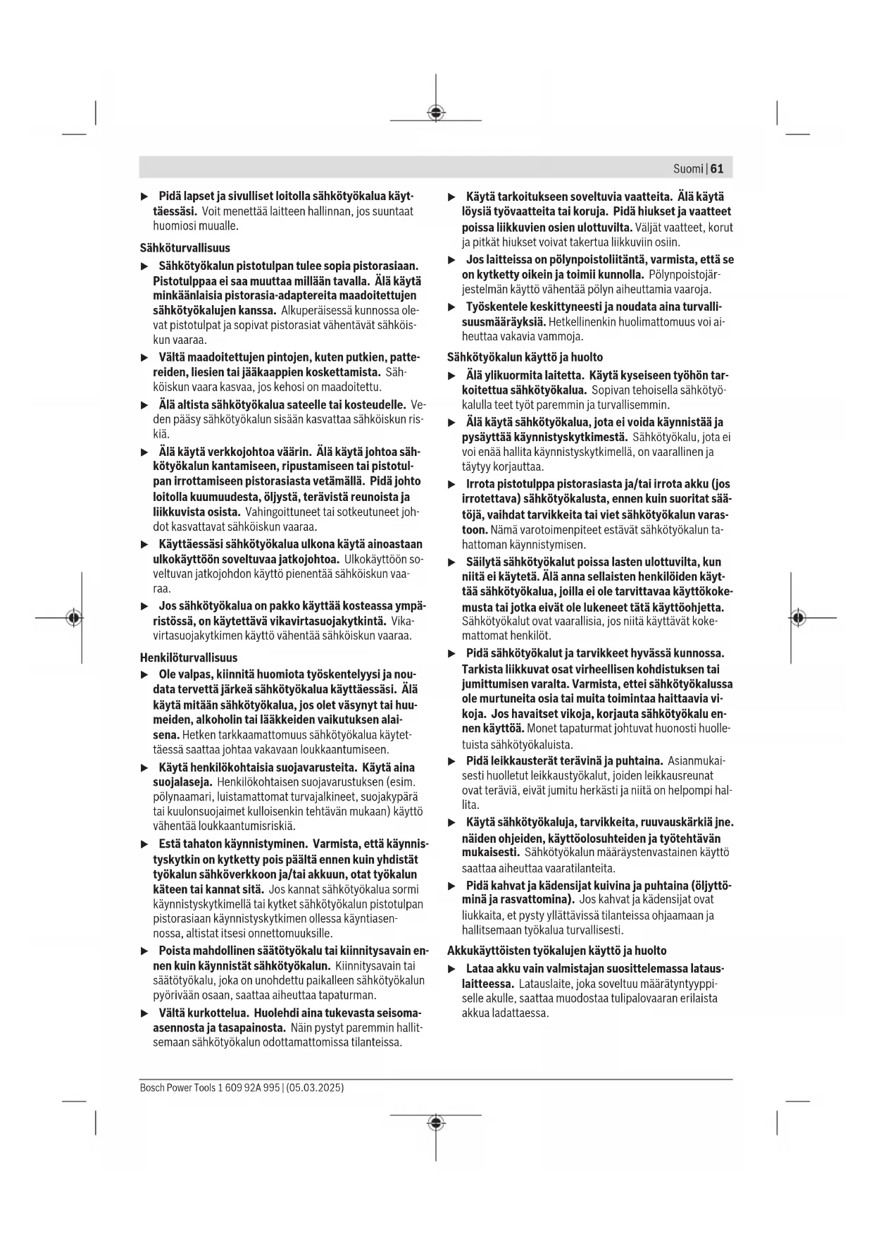 Näissä käyttöohjeissa ilmoitetut tärinä- ja melupäästötiedot on mitattu standardissa määritetyn mittausmenetelmän mu- kaan ja niitä voi käyttää sähkötyökalujen keskinäiseen vertai- luun. Ne soveltuvat myös tärinä- ja melupäästöjen alustavaan arviointiin. Ilmoitetut tärinä- ja melupäästöt vastaavat sähkötyökalun pääasiallisia käyttötapoja. Tärinä- ja melupäästöt saattavat kuitenkin poiketa ilmoitetuista arvoista, jos sähkötyökalua käytetään toisiin töihin, muilla käyttötarvikkeilla tai riittämät- tömästi huollettuna. Tämä saattaa suurentaa koko työsken- telyajan tärinä- ja melupäästöjä huomattavasti. Tärinä- ja melupäästöjen tarkaksi arvioimiseksi on huomioi- tava myös ne ajat, jolloin laite on sammutettuna tai tyhjä- käynnillä. Tämä voi vähentää huomattavasti koko työskente- lyajan tärinä- ja melupäästöjä. Määrittele tarvittavat lisävarotoimenpiteet käyttäjän suojele- miseksi tärinän aiheuttamilta haitoilta (esimerkiksi sähkötyö- kalujen ja käyttötarvikkeiden huolto, käsien pitäminen lämpi- minä ja työprosessien organisointi). Akku Bosch myy akkukäyttöisiä sähkötyökaluja myös ilman akkua. Pakkauksesta näet, sisältyykö akku sähkötyökalusi toimituk- seen. Akun lataminen u Käytä vain teknisissä tiedoissa ilmoitettuja latauslait- teita. Vain nämä latauslaitteet soveltuvat sähkötyökalus- sasi käytettävälle litiumioniakulle. Huomautus: kansainvälisten kuljetusmääräysten mukaisesti Li-ion-akut toimitetaan osittain ladattuina. Akun täyden suo- rituskyvyn varmistamiseksi akku tulee ladata täyteen ennen ensikäyttöä. Bosch Power Tools 1 609 92A 995 | (05.03.2025)64 | Suomi Akun asentaminen Työnnä ladattu akku akun kiinnityskohtaan niin, että se lukit- tuu paikalleen. Akun irrottaminen Kun haluat ottaa akun pois, paina akun vapautuspainikkeita ja vedä akku irti. Älä irrota akkua väkisin. Akun lataustilan näyttö Akun lataustilan näytön 3 vihreää LED-valoa ilmoittavat akun lataustilan. LED-valot Kapasiteetti 3vihreää LED-valoa palaa jatku- vasti 68–100% 2vihreää LED-valoa palaa jatku- vasti 22–68% 1vihreä LED-valo palaa jatkuvasti 2–22% 1vihreä LED-valo vilkkuu 0–2% Ohjeita akun optimaaliseen käsittelyyn Suojaa akku kosteudelta ja vedeltä. Säilytä akkua vain –20...50°C lämpötilassa. Älä jätä akkua esimerkiksi kuumana kesäpäivänä pitkäksi ajaksi autoon. Huomattavasti lyhentynyt käyntiaika latauksen jälkeen osoit- taa, että akku on elinikänsä lopussa ja täytyy vaihtaa uuteen. Huomioi hävitysohjeet. Asennus u Ota akku pois sähkötyökalusta, ennen kuin teet säh- kötyökaluun liittyviä töitä (esim. huolto, käyttötarvik- keen vaihto jne.). Käynnistyskytkimen tahaton painallus aiheuttaa loukkaantumisvaaran. Käyttötarvikkeen vaihto (katso kuva A) Avaa pikaistukkaa (2) kiertosuuntaan ➊, kunnes saat asen- nettua käyttötarvikkeen paikalleen. Asenna käyttötarvike. Ota kiinni pikaistukan (2) holkista ja kierrä sitä voimakkaasti suuntaan ➋. Tämän myötä poraistukka lukittuu automaatti- sesti. Lukitus aukeaa, kun kierrät holkkia vastakkaiseen suuntaan käyttötarvikkeen irrottamiseksi. Pölyn-/purunpoisto Työstettävistä materiaaleista syntyvä pöly (esimerkiksi lyijy- pitoinen pinnoite, tietyt puulaadut, kivi ja metalli) voi olla ter- veydelle vaarallista. Pölyn koskettaminen tai hengittäminen saattaa aiheuttaa käyttäjälle tai lähellä oleville ihmisille aller- gisia reaktioita ja/tai hengitystiesairauksia. Tietyt pölylaadut (esimerkiksi tammi- tai pyökkipöly) katso- taan syöpää aiheuttaviksi, varsinkin puunkäsittelyaineiden yhteydessä (kromaatti, puunsuoja-aine). Asbestipitoisia ai- neita saavat käsitellä vain ammattilaiset. – Huolehdi työkohteen hyvästä tuuletuksesta. – Suosittelemme käyttämään suodatusluokan P2 hengitys- suojanaamaria. Noudata käsiteltäviä materiaaleja koskevia maakohtaisia määräyksiä. u Estä pölyn kertyminen työpisteeseen. Pöly saattaa olla herkästi syttyvää. Käyttö Käyttöönotto Kiertosuunnan valinta (katso kuva B) Suunnanvaihtokytkimellä (5) voit vaihtaa sähkötyökalun pyörintäsuuntaa. Tätä ei voi kuitenkaan tehdä, kun käynnis- tyskytkintä (8) painetaan. Pyörintä myötäpäivään: kun haluat porata tai kiinnittää ruu- veja, työnnä suunnanvaihtokytkin (5) vasempaan ääriasen- toon. Vastapäivään pyörintä: käännä ruuvien löysäämistä tai ir- rottamista varten suunnanvaihtokytkin (5) oikealle ääriasen- toon asti. Vääntömomentin asetus 20-portaisella vääntömomentin asetusrenkaalla(3) voit va- lita tarvittavan vääntömomentin. Sopivalla asetusarvolla käyttötarvike pysähtyy heti kun ruuvin kanta on ruuvattu pin- nan tasalle / säädetyn vääntömomentin kohdalla. Asen- nossa rasterikytkin on passivoitu, kun teet esimerkiksi poraustöitä. Valitse ruuvien irrottamiseen tarvittaessa suurempi asetu- sarvo tai säädä asento symbolin kohdalle. Asento tuottaa suurimman vääntömomentin poraami- seen ja ruuvaamiseen. Mekaaninen vaihteenvalinta u Käytä vaihdekytkintä (4) vain sähkötyökalun ollessa pysäytettynä. u Siirrä vaihteenvalitsin aina rajoittimeen asti. Muuten sähkötyökalu saattaa vaurioitua. Vaihdekytkimen (4) avulla voit valita 2 erilaista kierroslukua- luetta. Vaihdekytki- men asento (4) Kierros- luku Vääntö- momentti Käyttöalue 1 Matala Korkea Raskaisiin käyttöso- velluksiin: esim. poraukseenja ruuvaukseen suu- rella halkaisijalla 2 Korkea Matala Kevyisiin käyttöso- velluksiin: esim. poraukseenja ruuvaukseen pie- nellä halkaisijalla 1 609 92A 995 | (05.03.2025) Bosch Power ToolsSuomi | 65 Käyttötavan valinta Poraaminen Aseta vääntömomentin asetusrengas(3) "po- raus"-symbolin kohdalle, kun haluat porata tai ruuvata suurimmalla vääntömomentilla. Ruuvaaminen Aseta vääntömomentin asetusrengas(3) halua- masi vääntömomenttiportaan kohdalle. Kierrosluvun säätö V