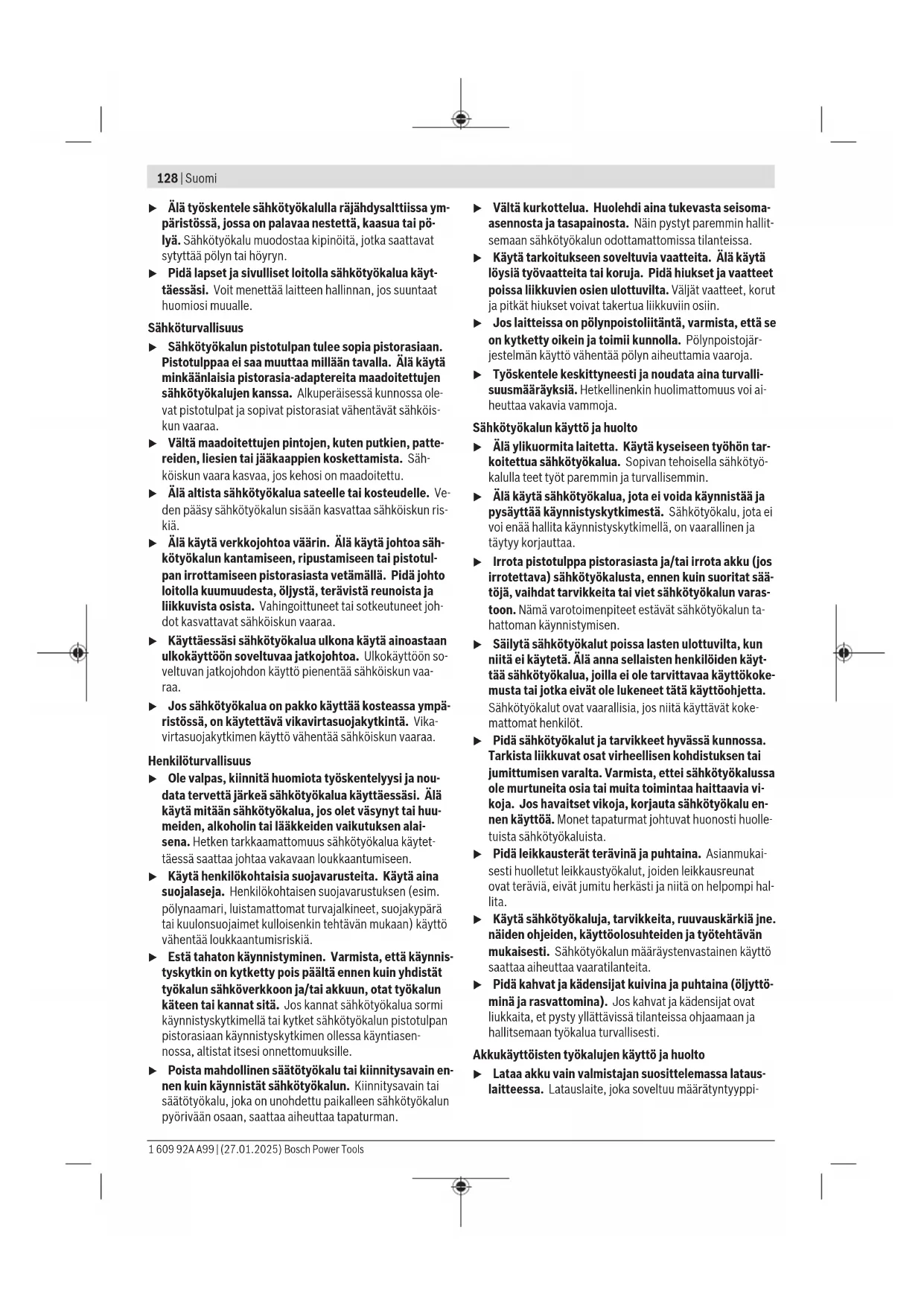 Kierroslukuportaiden ilmoitetut arvot ovat suuntaa-antavia. Akku Bosch myy akkukäyttöisiä sähkötyökaluja myös ilman akkua. Pakkauksesta näet, sisältyykö akku sähkötyökalusi toimituk- seen. Akun lataminen u Käytä vain teknisissä tiedoissa ilmoitettuja latauslait- teita. Vain nämä latauslaitteet soveltuvat sähkötyökalus- sasi käytettävälle litiumioniakulle. Huomautus: kansainvälisten kuljetusmääräysten mukaisesti Li-ion-akut toimitetaan osittain ladattuina. Akun täyden suo- rituskyvyn varmistamiseksi akku tulee ladata täyteen ennen ensikäyttöä. Akun asentaminen Työnnä ladattu akku akun kiinnityskohtaan niin, että se lukit- tuu paikalleen. Bosch Power Tools 1 609 92A A99 | (27.01.2025)134 | Suomi Akun irrottaminen Kun haluat ottaa akun pois, paina akun vapautuspainiketta ja vedä akku irti. Älä irrota akkua väkisin. Akussaon 2 lukitusvaihetta, millä estetään akun irtoaminen, jos painat tahattomasti akunvapautuspainiketta. Sähkötyö- kalussa oleva akku pysyy paikallaan jousen avulla. Akun lataustilan näyttö Huomautus: lataustilan näyttöä ei ole kaikissa akkutyypeissä. Akun lataustilan näytön vihreät LED-valot ilmoittavat akun la- taustilan. Turvallisuussyistä lataustilan tarkistaminen on mahdollista vain sähkötyökalun ollessa pysähdyksissä. Kun haluat nähdä lataustilan, paina lataustilan näytön paini- ketta tai . Tämä on mahdollista myös akun ollessa irro- tettuna. Jos lataustilan näytön painikkeen painaminen ei sytytä yh- tään LED-valoa, akku on viallinen ja täytyy vaihtaa. Akkutyyppi GBA 18V... LED-valo Kapasiteetti 3vihreää LED-valoa palaa jatkuvasti 60–100% 2vihreää LED-valoa palaa jatkuvasti 30–60% 1vihreä LED-valo palaa jatkuvasti 5–30% 1vihreä LED-valo vilkkuu 0–5% Akkutyyppi ProCORE18V... LED-valo Kapasiteetti 5vihreää LED-valoa palaa jatkuvasti 80–100% 4vihreää LED-valoa palaa jatkuvasti 60–80% 3vihreää LED-valoa palaa jatkuvasti 40–60% 2vihreää LED-valoa palaa jatkuvasti 20–40% 1vihreä LED-valo palaa jatkuvasti 5–20% 1vihreä LED-valo vilkkuu 0–5% Ohjeita akun optimaaliseen käsittelyyn Suojaa akku kosteudelta ja vedeltä. Säilytä akkua vain –20...50°C lämpötilassa. Älä jätä akkua esimerkiksi kuumana kesäpäivänä pitkäksi ajaksi autoon. Puhdista akun tuuletusaukot säännöllisin väliajoin peh- meällä, puhtaalla ja kuivalla siveltimellä. Huomattavasti lyhentynyt käyntiaika latauksen jälkeen osoit- taa, että akku on elinikänsä lopussa ja täytyy vaihtaa uuteen. Huomioi hävitysohjeet. Asennus u Ota akku pois sähkötyökalusta, ennen kuin teet säh- kötyökaluun liittyviä töitä (esim. huolto, käyttötarvik- keen vaihto jne.). Käynnistyskytkimen tahaton painallus aiheuttaa loukkaantumisvaaran. Suojusten asentaminen u Ota akku pois sähkötyökalusta, ennen kuin teet säh- kötyökaluun liittyviä töitä (esim. huolto, käyttötarvik- keen vaihto jne.). Käynnistyskytkimen tahaton painallus aiheuttaa loukkaantumisvaaran. Huomautus: Jos hiomalaikka on murtunut käytön aikana tai suojuksen/sähkötyökalun kiinnittimet ovat vioittuneet, säh- kötyökalu on lähetettävä välittömästi huoltopisteeseen kor- jausta varten, katso lisätiedot kappaleesta "Asiakaspalvelu ja käyttöneuvonta". Hiontatöiden suojus Aseta suojus (10) sähkötyökalun kiin- nittimeen niin, että suojuksen koo- dausnokat ovat kohdakkain kiinnitti- men kanssa. Paina ja pidä tällöin luki- tuksen avausvipua (1) painettuna. Paina suojusta (10) karakaulan päälle niin, että suojuksen liitoskohta menee kiinni sähkötyökalun laippaan ja käännä suojusta niin, että se lukittuu kuuluvasti kiinni. Säädä suojuksen (10) asento tehtä- vän työn mukaan. Paina sitä varten lukituksen avausvipua (1) ylöspäin ja käännä suojus (10) haluamaasi asentoon. u Säädä suojus(10) aina niin, että lukituksen avausvi- vun (1) molemmat nokat kiinnittyvät suojuksen (10) asiaankuuluviin loviin. u Säädä suojus (10) niin, ettei kipinäsuihku kohdistu käyttäjän suuntaan. u Käyttötarvikkeen pyörimissuunnassa suojus(10) saa kääntyä vain painettaessa lukituksen avausvipua(1)! Muussa tapauksessa sähkötyökalua ei saa missään ta- pauksessa enää käyttää ja se täytyy toimittaa huol- toon. Huomautus: suojuksen (10) koodausnokat varmistavat, että sähkötyökaluun voi asentaa vain sellaisen suojuksen, joka sopii siihen. Katkaisutöiden suojus u Käytä katkaisutöissä aina katkaisutöiden suojusta (11) tai hiomatöiden suojusta (10) ja siihen asennet- tua katkaisutöiden suojainta (14). u Käytä riittävän tehokasta pölynpoistoa, kun teet kivi- materiaalien katkaisutöitä. Katkaisutöiden suojus (11) asennetaan samalla tavalla kuin hiomatöiden suojus (10). Metallinen katkaisutöiden suojain Asenna metallinen katkaisutöiden suojain (14) hiomatöiden suojukseen (10) (katso kuva A): käännä pidinsankaa takai- sinpäin (➊). Kytke suojain (14) hiomatöiden suojukseen (10) (➋). Paina pidinsanka suojusta (10) vasten (➌). Kun haluat tehdä irrotuksen (katso kuva B), paina pidinsan- gan nappia (➊) ja käännä pidinsankaa takaisinpäin (➋). Vedä suojain (14) irti suojuksesta (10) (➌). 1 609 92A A99 | (27.01.2025) Bosch Power ToolsSuomi | 135 Muovinen katkaisutöiden suojain Kytke muovinen katkaisutöiden suojain(14) hiomatöiden suojukseen(10) (katso kuvaC). Suojain(14) napsahtaa kuuluvasti ja näkyvästi kiinni suojukseen(10). Kun haluat tehdä irrotuksen (katso kuvaD), vapauta suojain(14) suojuksen(10) (➊) vasemmalta tai oikealta puolelta ja vedä suojain irti (➋). Ohjaustuen avulla tehtävän katkaisutyön imusuojus Ohjaustuen avulla tehtävän katkaisutyön imusuojus(26) asennetaan samalla tavalla kuin hiomatöiden suojus. Saat yhdistettyä sähkötyökalun tukevasti imusuojukseen, kun kiinnität lisäkahvan (9)/(8) imusuojuksen sangan läpi vaihteistokoteloon. Ohjaustuella varustettuun imusuojuk- seen (26) voi kytkeä soveltuvan Bosch-pölynimurin. 