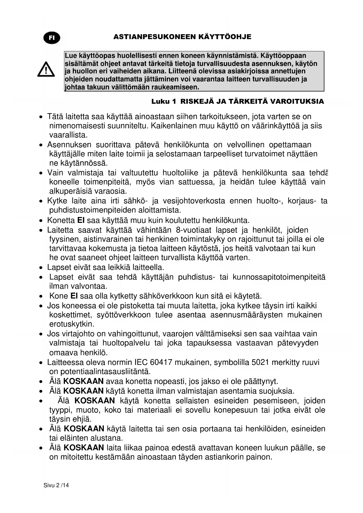 Lue käyttöopas huolellisesti ennen koneen käynnistämistä. Käyttöoppaan sisältämät ohjeet antavat tärkeitä tietoja turvallisuudesta asennuksen, käytön ja huollon eri vaiheiden aikana. Liitteenä olevissa asiakirjoissa annettujen ohjeiden noudattamatta jättäminen voi vaarantaa laitteen turvallisuuden ja johtaa takuun välittömään raukeamiseen. Luku 1 RISKEJÄ JA TÄRKEITÄ VAROITUKSIA Tätä laitetta saa käyttää ainoastaan siihen tarkoitukseen, jota varten se on nimenomaisesti suunniteltu. Kaikenlainen muu käyttö on väärinkäyttöä ja siis vaarallista. Asennuksen suorittava pätevä henkilökunta on velvollinen opettamaan käyttäjälle miten laite toimii ja selostamaan tarpeelliset turvatoimet näyttäen ne käytännössä. Vain valmistaja tai valtuutettu huoltoliike ja pätevä henkilökunta saa tehdä koneelle toimenpiteitä, myös vian sattuessa, ja heidän tulee käyttää vain alkuperäisiä varaosia. Kytke laite aina irti sähkö- ja vesijohtoverkosta ennen huolto-, korjaus- tai puhdistustoimenpiteiden aloittamista. Konetta EI saa käyttää muu kuin koulutettu henkilökunta. Laitetta saavat käyttää vähintään 8-vuotiaat lapset ja henkilöt, joiden fyysinen, aistinvarainen tai henkinen toimintakyky on rajoittunut tai joilla ei ole tarvittavaa kokemusta ja tietoa laitteen käytöstä, jos heitä valvotaan tai kun he ovat saaneet ohjeet laitteen turvallista käyttöä varten. Lapset eivät saa leikkiä laitteella. Lapset eivät saa tehdä käyttäjän puhdistus- tai kunnossapitotoimenpiteitä ilman valvontaa. Kone EI saa olla kytketty sähköverkkoon kun sitä ei käytetä. Jos koneessa ei ole pistoketta tai muuta laitetta, joka kytkee täysin irti kaikki koskettimet, syöttöverkkoon tulee asentaa asennusmääräysten mukainen erotuskytkin. Jos virtajohto on vahingoittunut, vaarojen välttämiseksi sen saa vaihtaa vain valmistaja tai huoltopalvelu tai joka tapauksessa vastaavan pätevyyden omaava henkilö. Laitteessa oleva normin IEC 60417 mukainen, symbolilla 5021 merkitty ruuvi on potentiaalintasausliitäntä. Älä KOSKAAN avaa konetta nopeasti, jos jakso ei ole päättynyt. Älä KOSKAAN käytä konetta ilman valmistajan asentamia suojuksia. Älä KOSKAAN käytä konetta sellaisten esineiden pesemiseen, joiden tyyppi, muoto, koko tai materiaali ei sovellu konepesuun tai jotka eivät ole täysin ehjiä. Älä KOSKAAN käytä laitetta tai sen osia portaana tai henkilöiden, esineiden tai eläinten alustana. Älä KOSKAAN laita liikaa painoa edestä avattavan koneen luukun päälle, se on mitoitettu kestämään ainoastaan täyden astiankorin painon.ASTIANPESUKONEEN KÄYTTÖOHJE Sivu 3 /14
